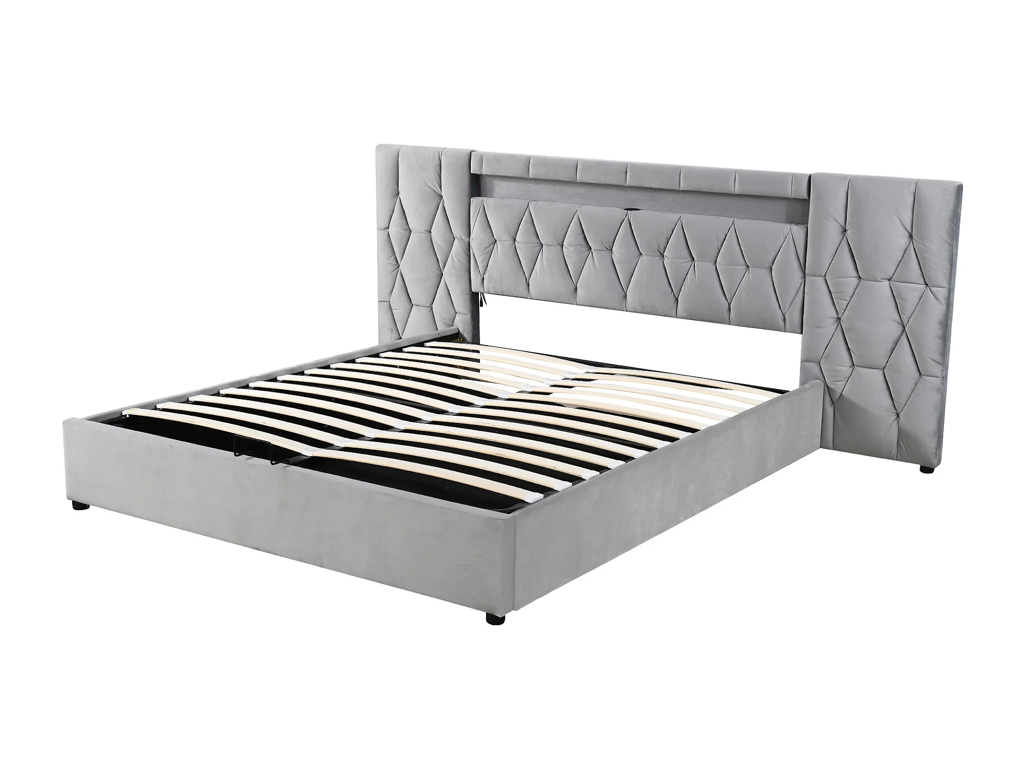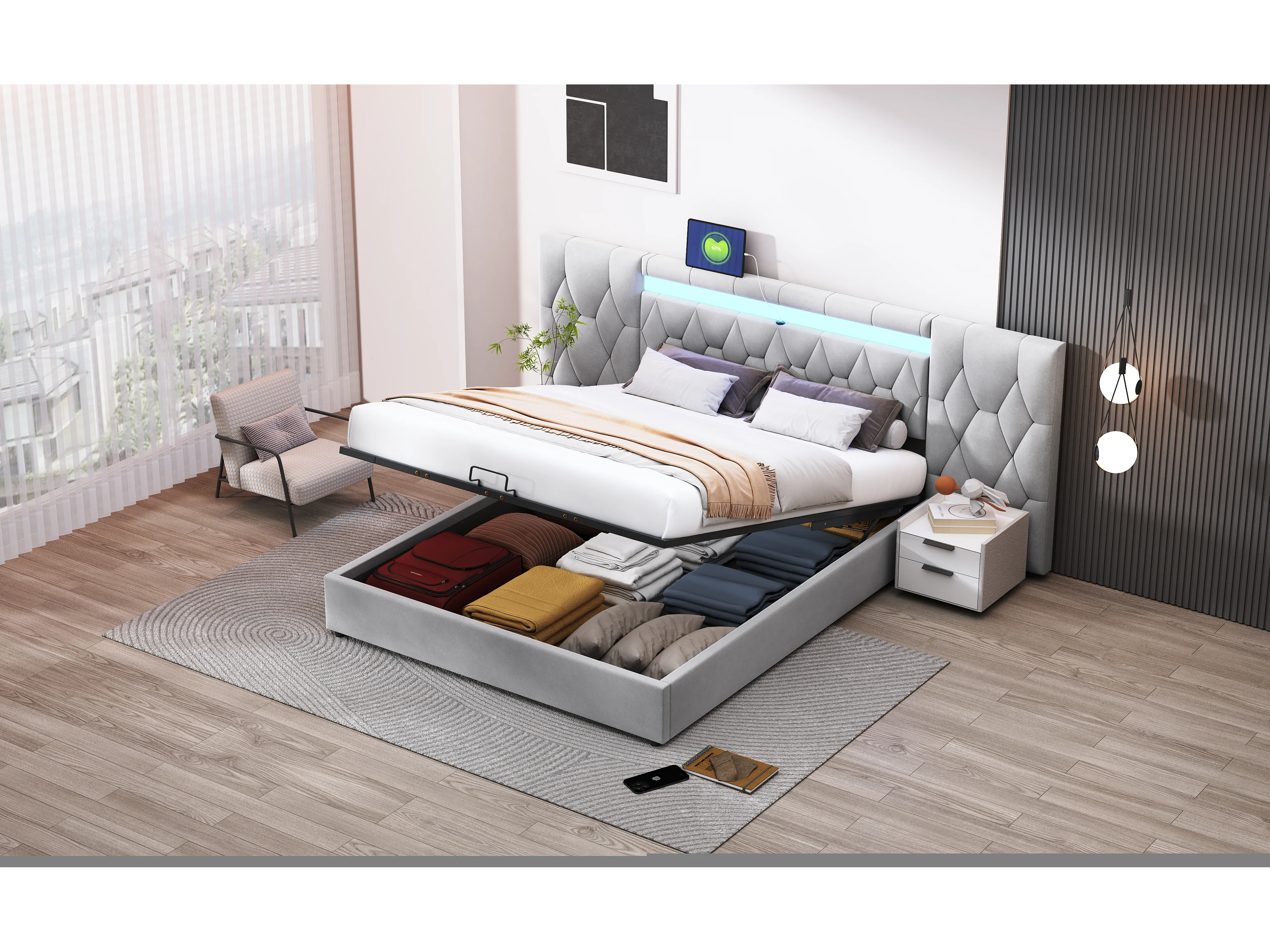 Lit double rembourré 180×200 cm avec grande tête de lit, en velours gris avec LED et ports USB, système de rangement hydraulique