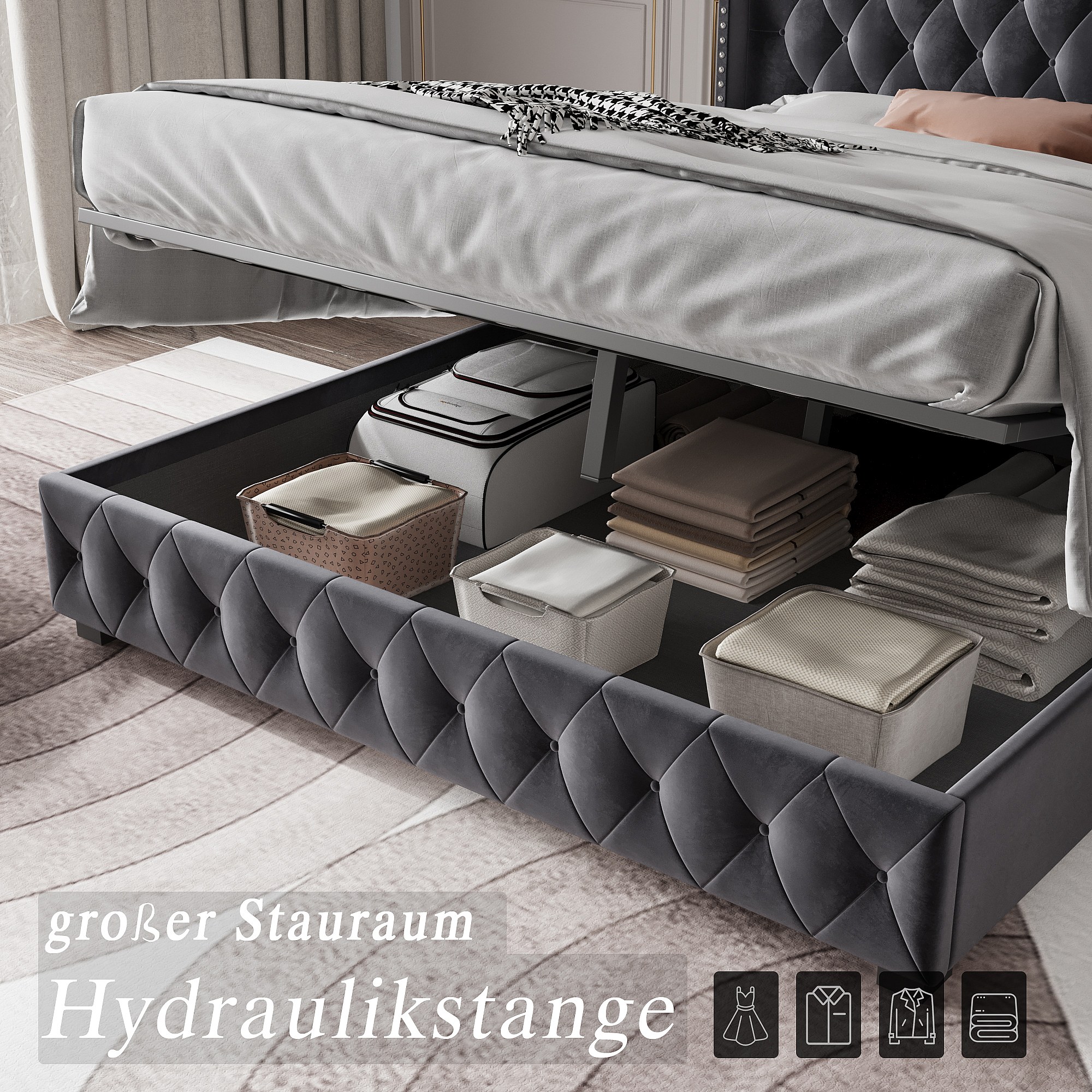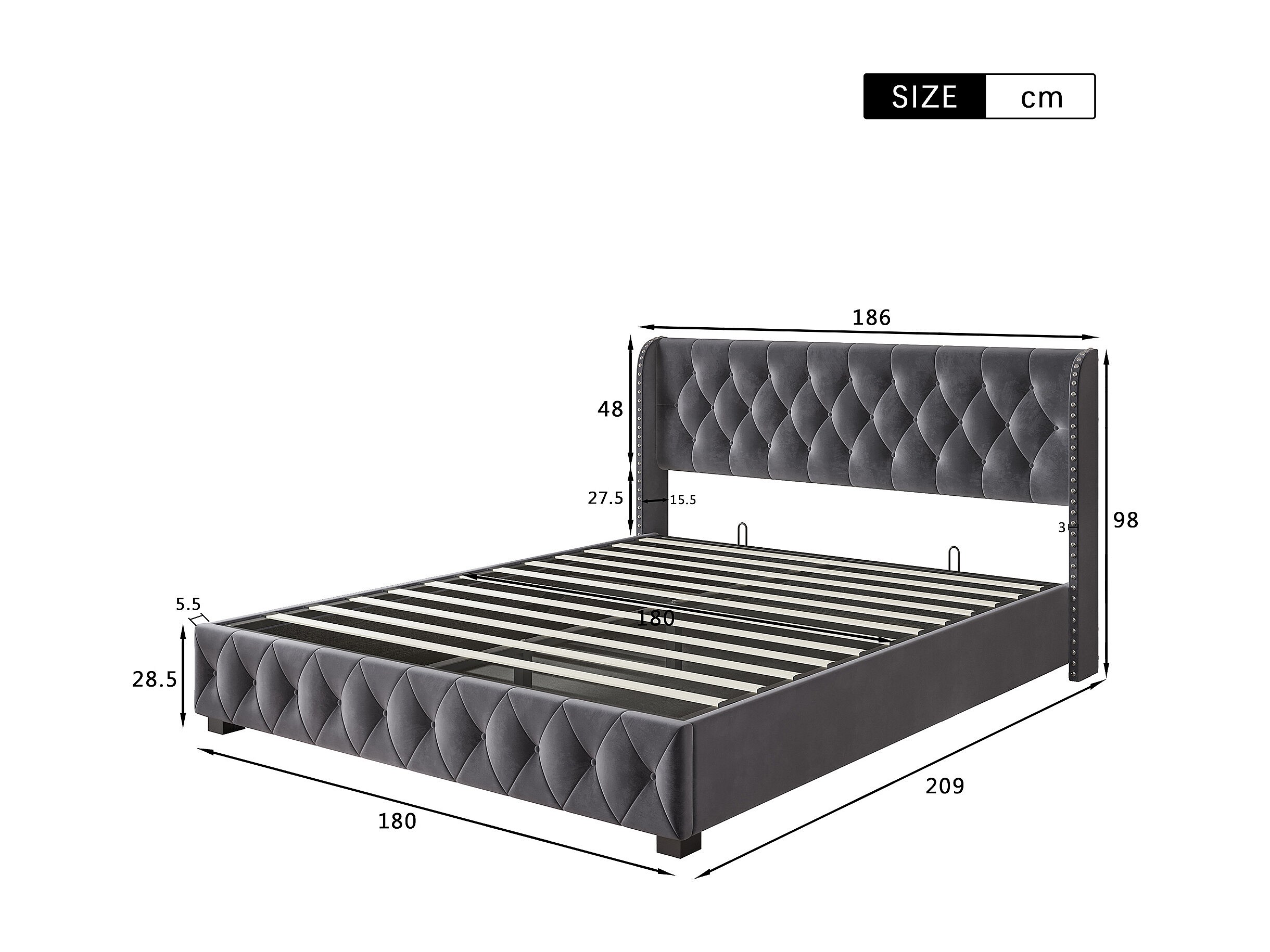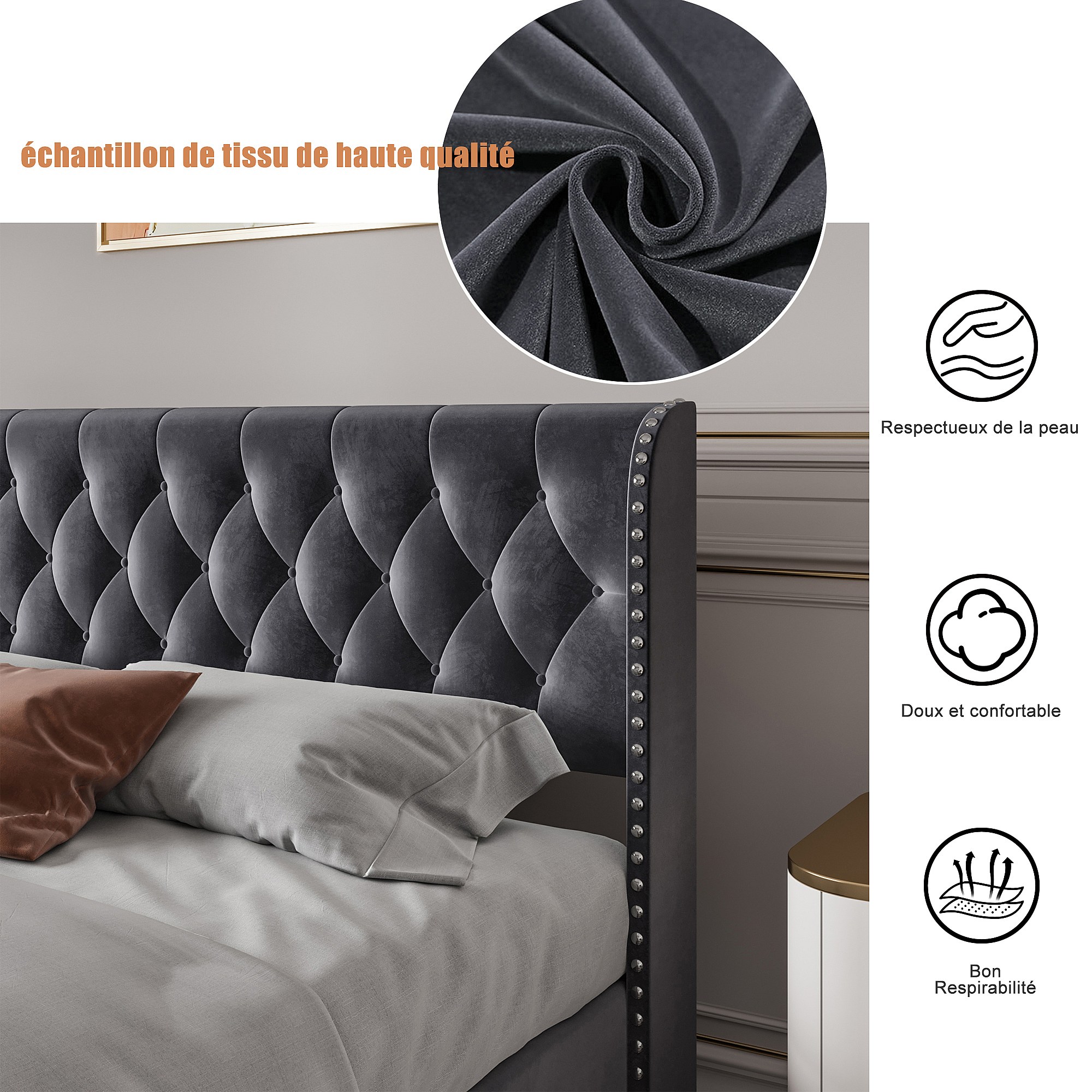 Lit Double Rembourré 180x200 cm, Lit Coffre avec Sommier à Lattes et Tête de Lit, Velours, Gris