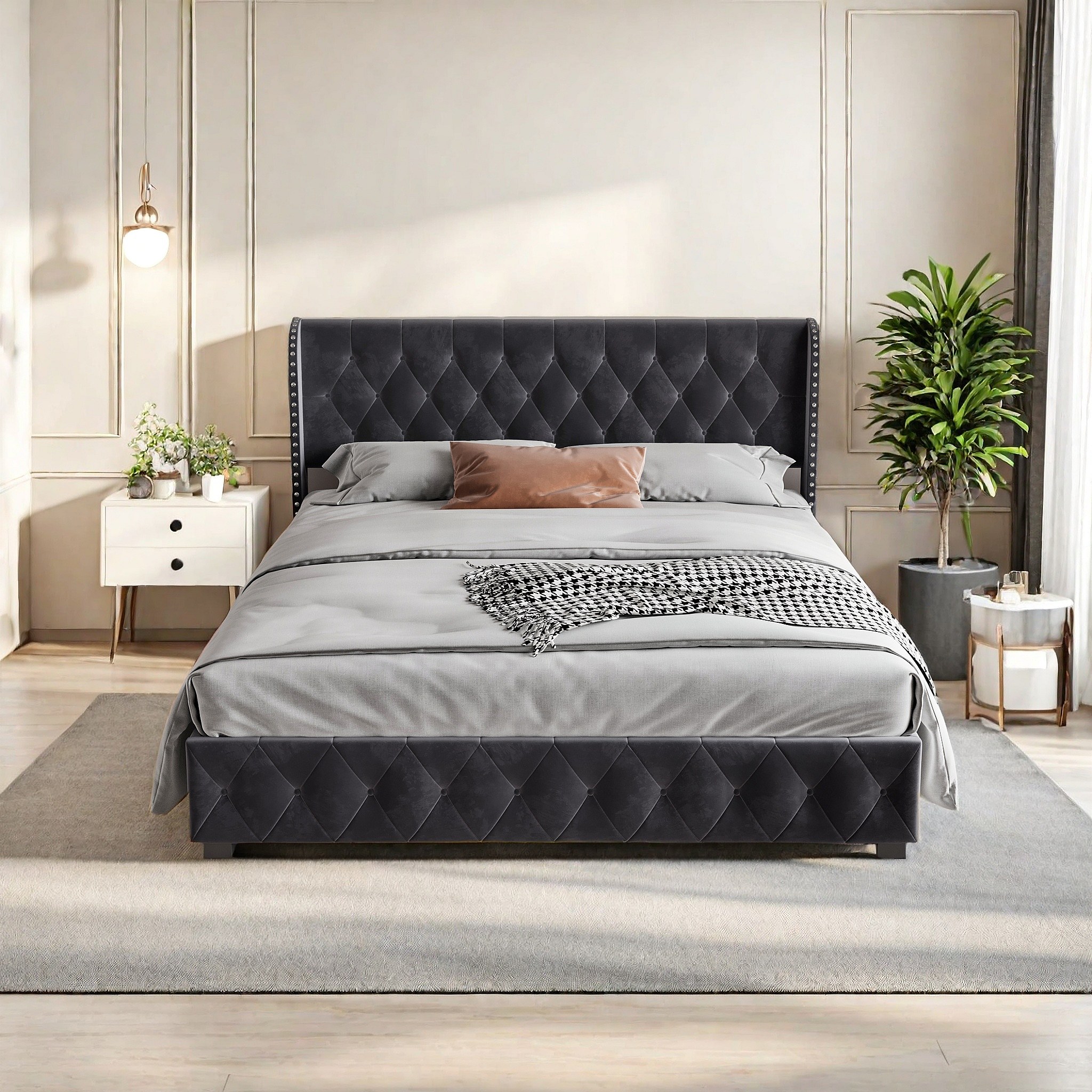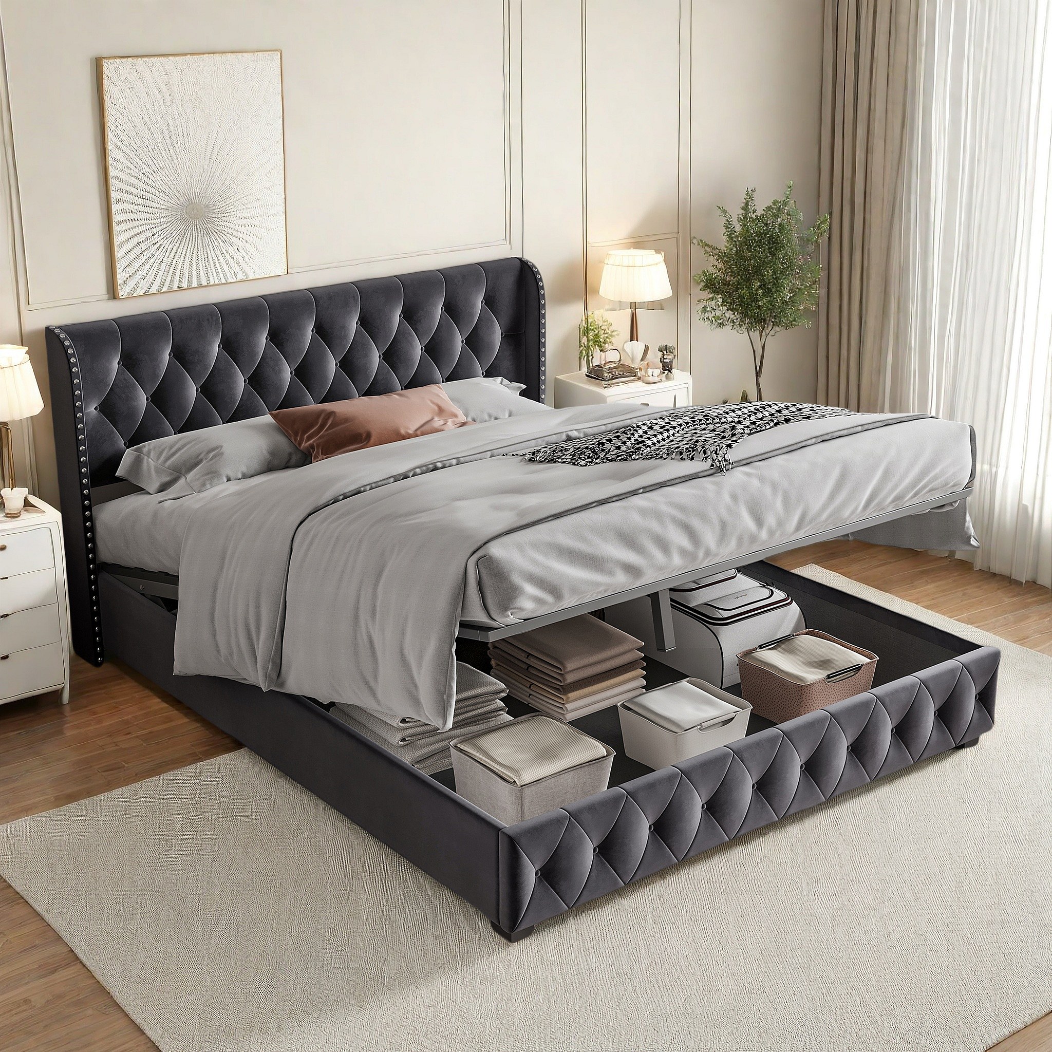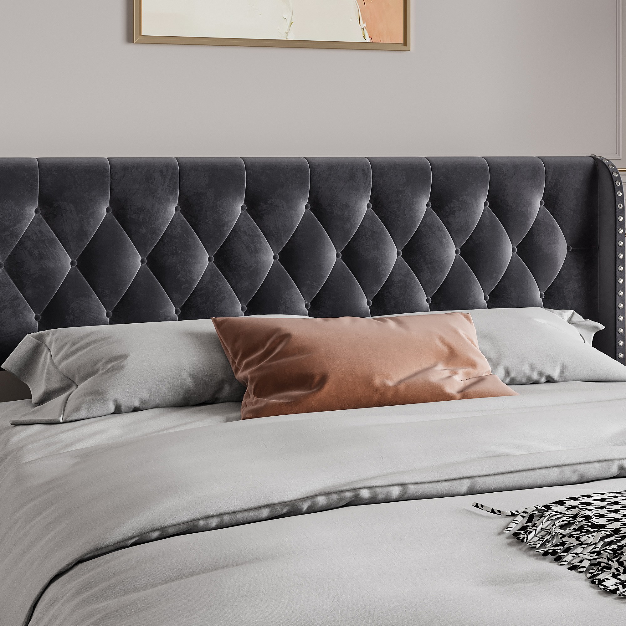 Lit Double Rembourré 180x200 cm, Lit Coffre avec Sommier à Lattes et Tête de Lit, Velours, Gris