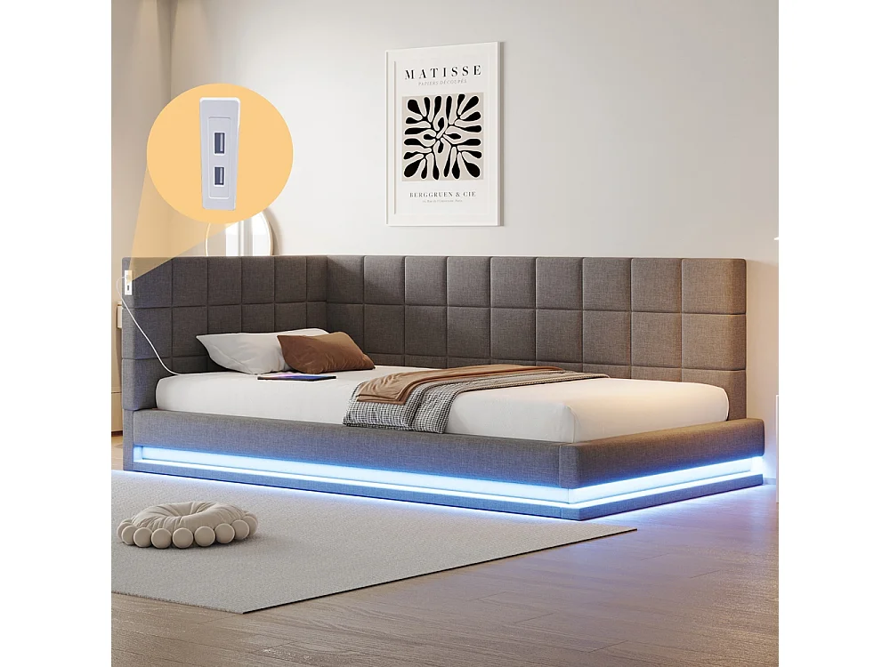 LIt double rembourré 90x200 avec bande lumineuse LED prise USB et sommier à lattes tissu velours agréable au toucher gris
