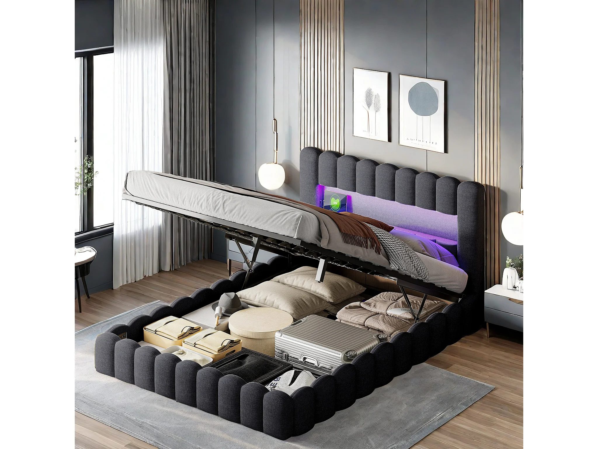 Lit Double Rembourré, Cadre de Lit, Lit Coffre 160x200cm, avec LED, Cadre de Lit Moderne pour Adultes 2 Personnes, Gris (sans Matelas)