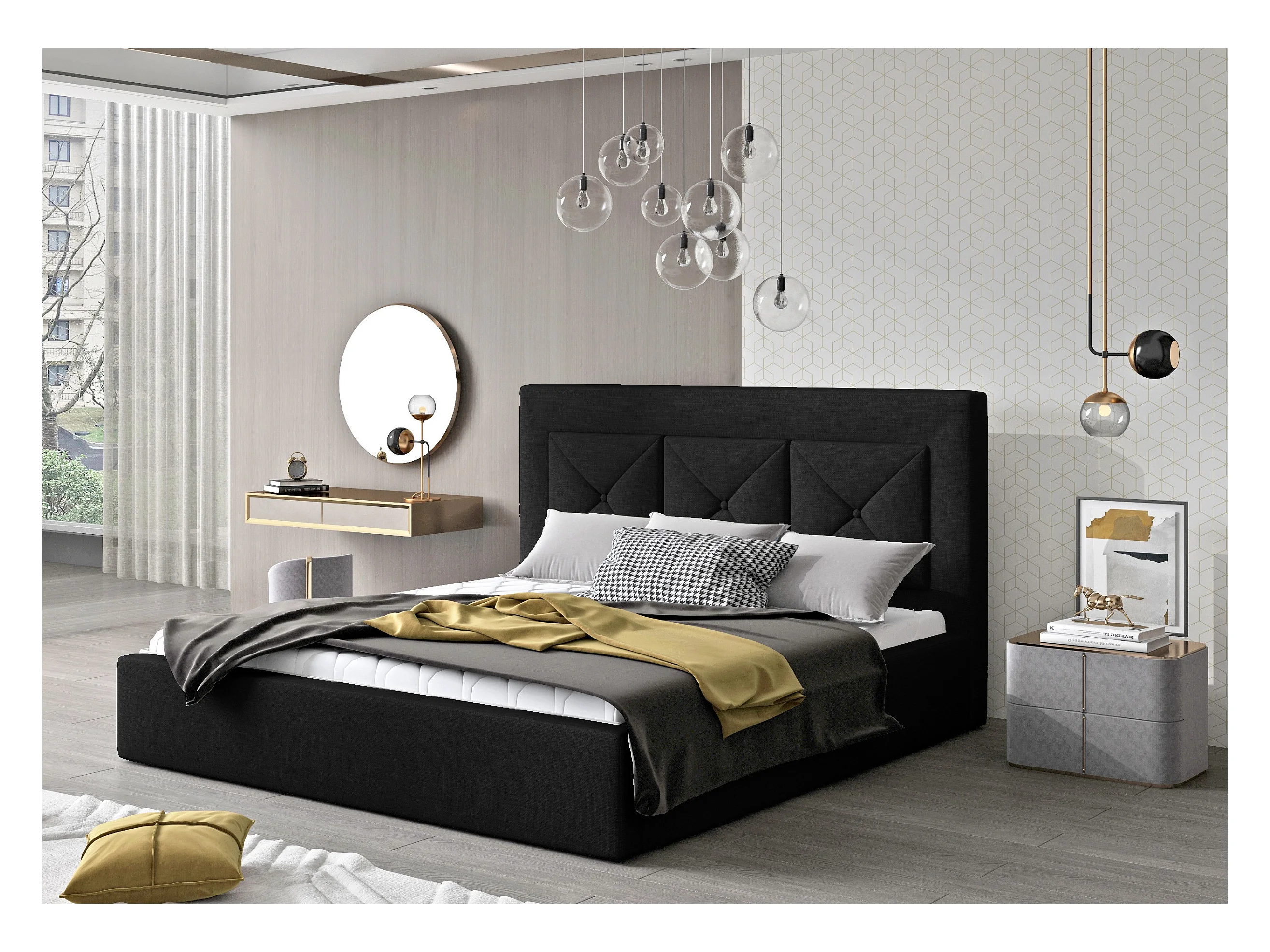 Lit double rembourré en tissu Clarin-Couleur Noir-180x200-Version coffre de rangement