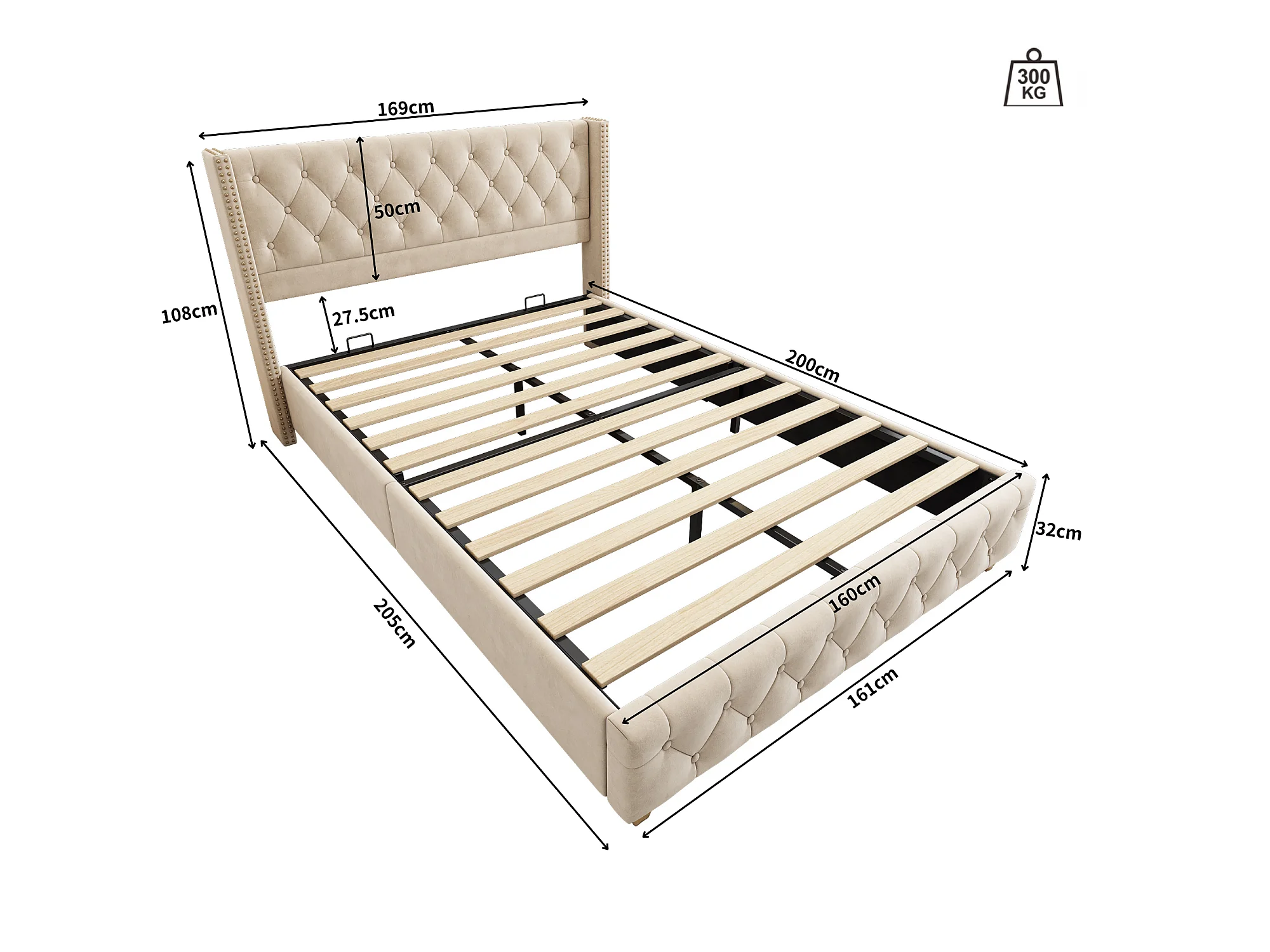 Lit double rembourré en velours 160x200cm avec sommier à lattes - Beige