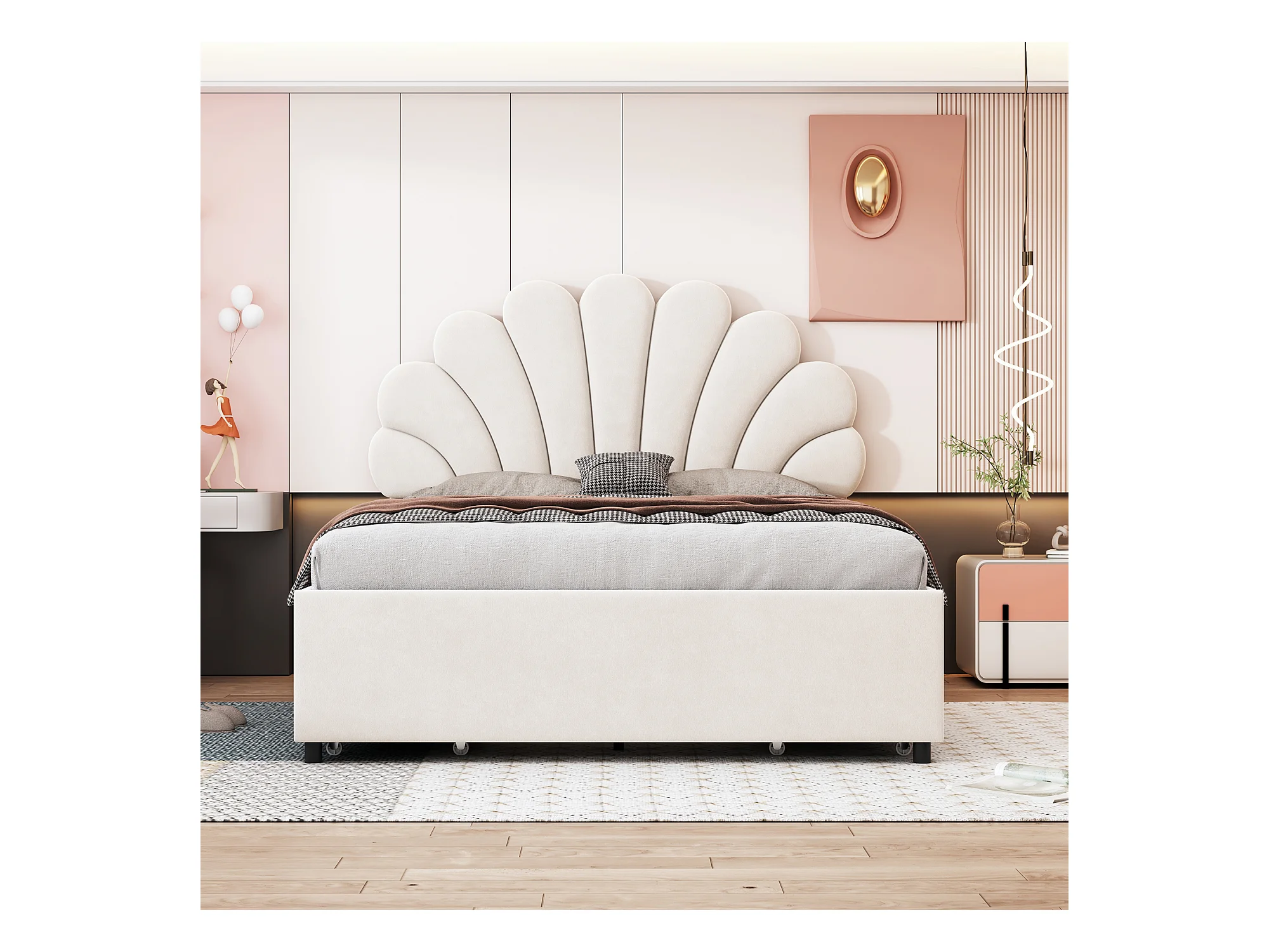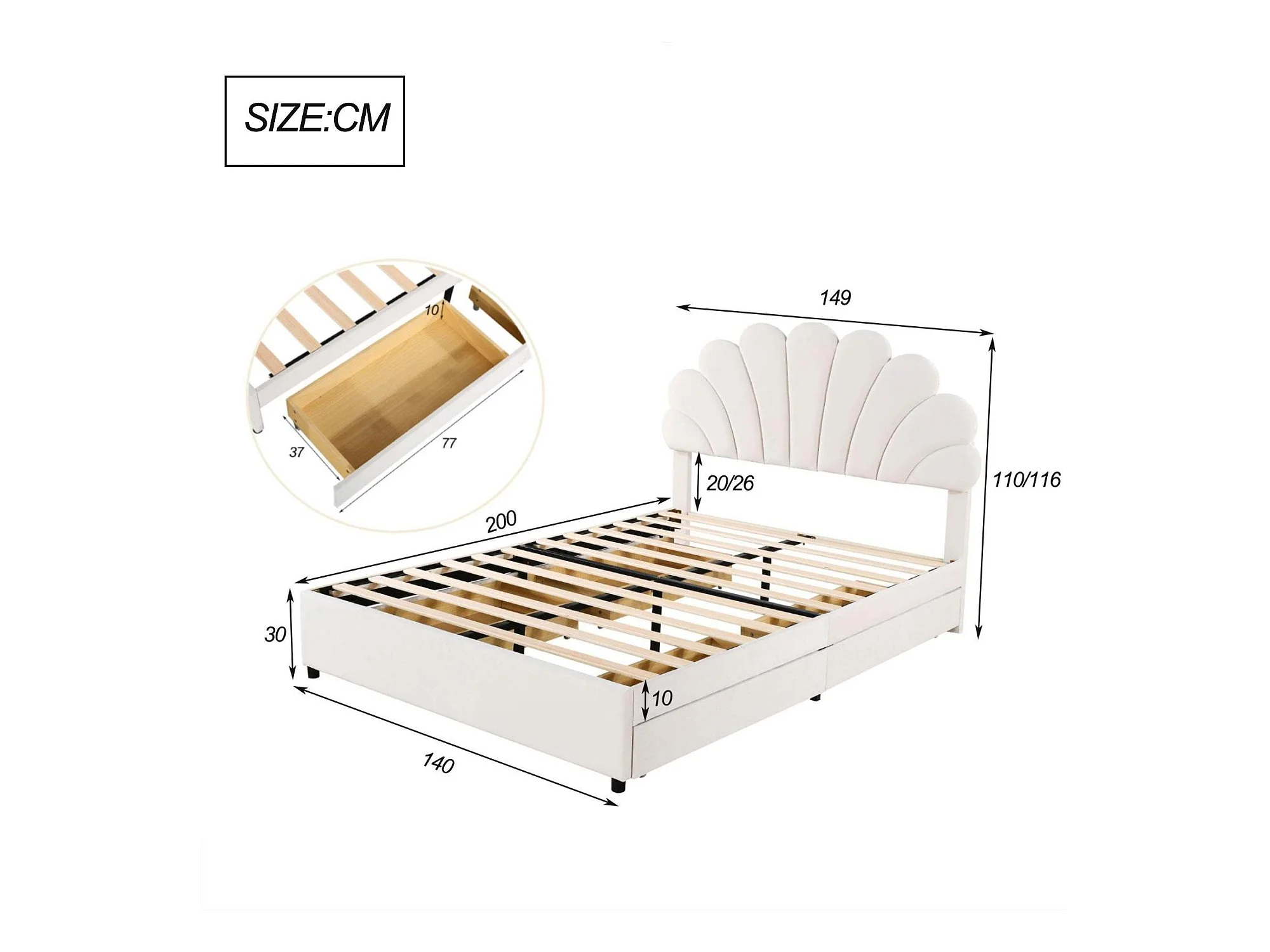 Lit double rembourré en velours avec 4 tiroirs - 140x200cm - tête de lit en forme de fleur - avec sommier à lattes - Beige