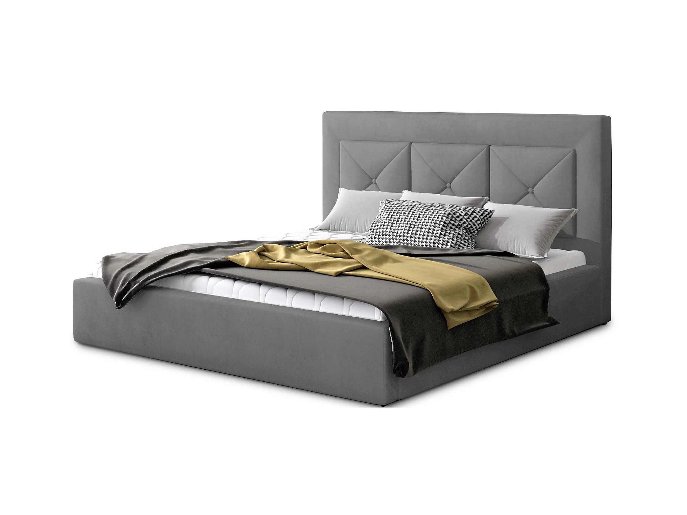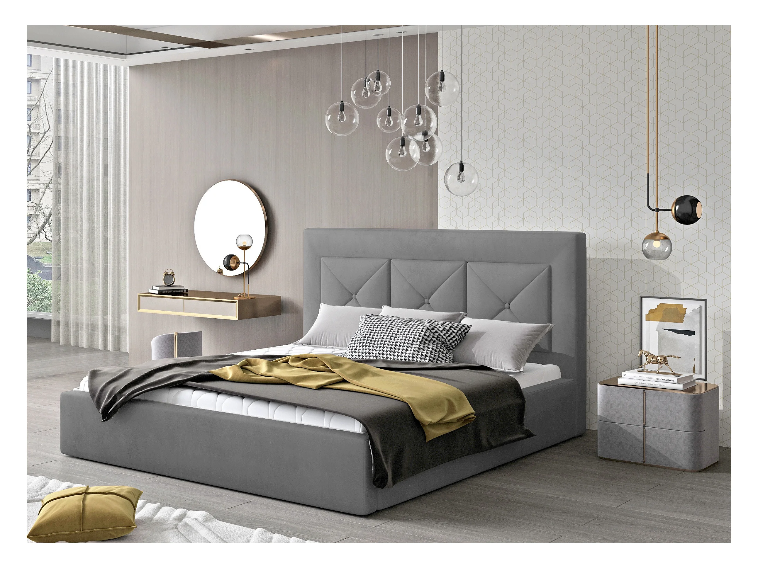 Lit double rembourré en velours Clarin-Couleur Gris-140x200-Version coffre de rangement