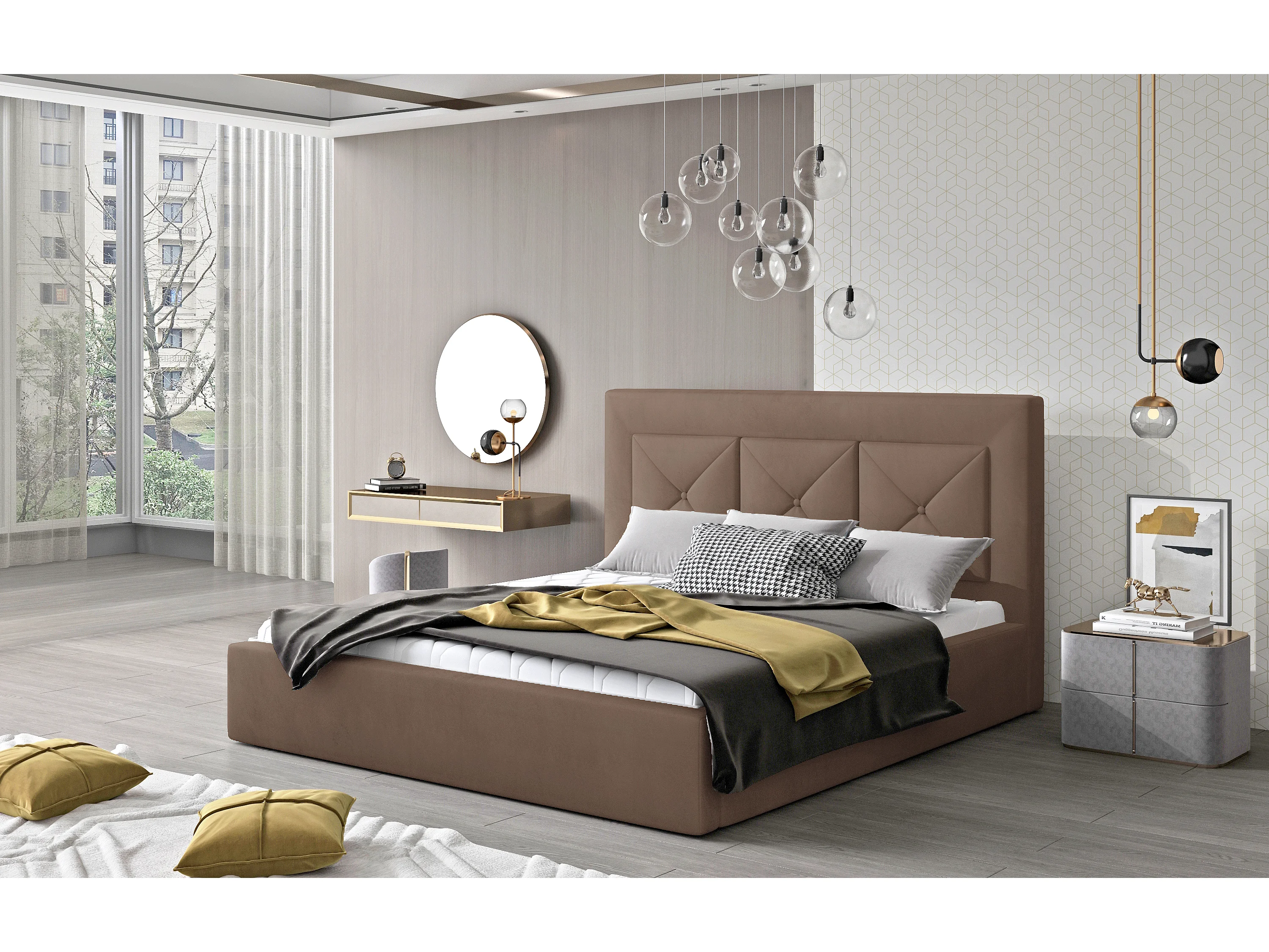 Lit double rembourré en velours Clarin-Couleur Marron clair-140x200-Version avec sommier