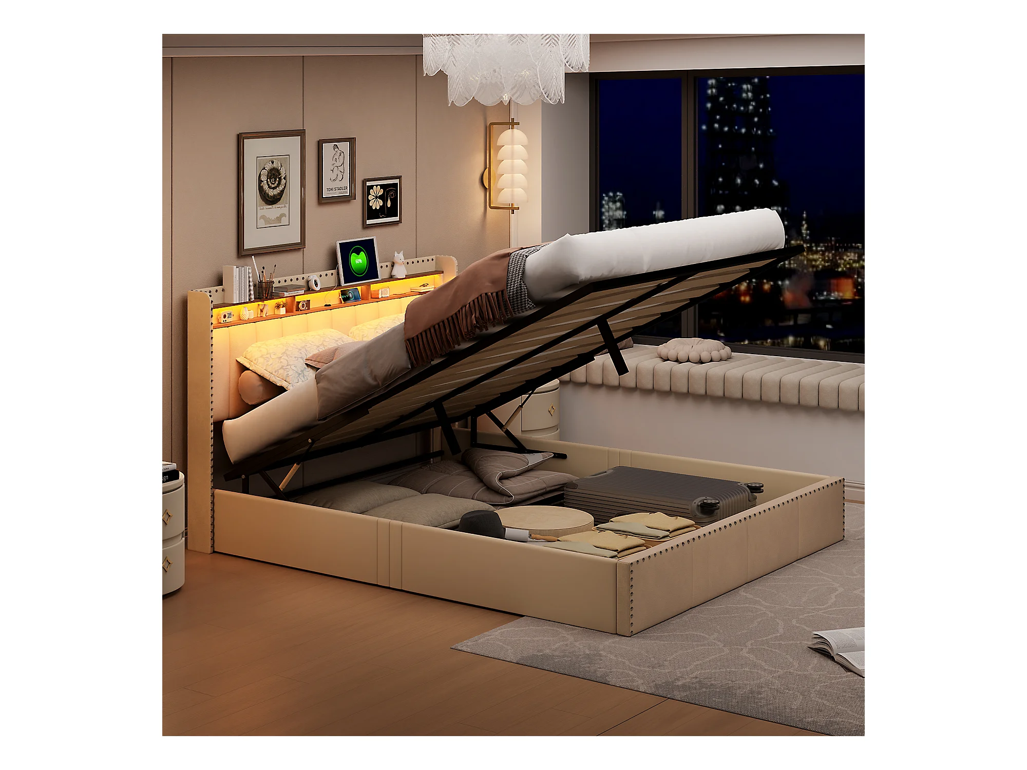 Lit Double, Rembourré Lit, 140x200cm, Cadre de Lit, Lit Coffre ,Lit Double avec Rangement sous Lit, Rangement, Velours, Beige (sans Matelas)