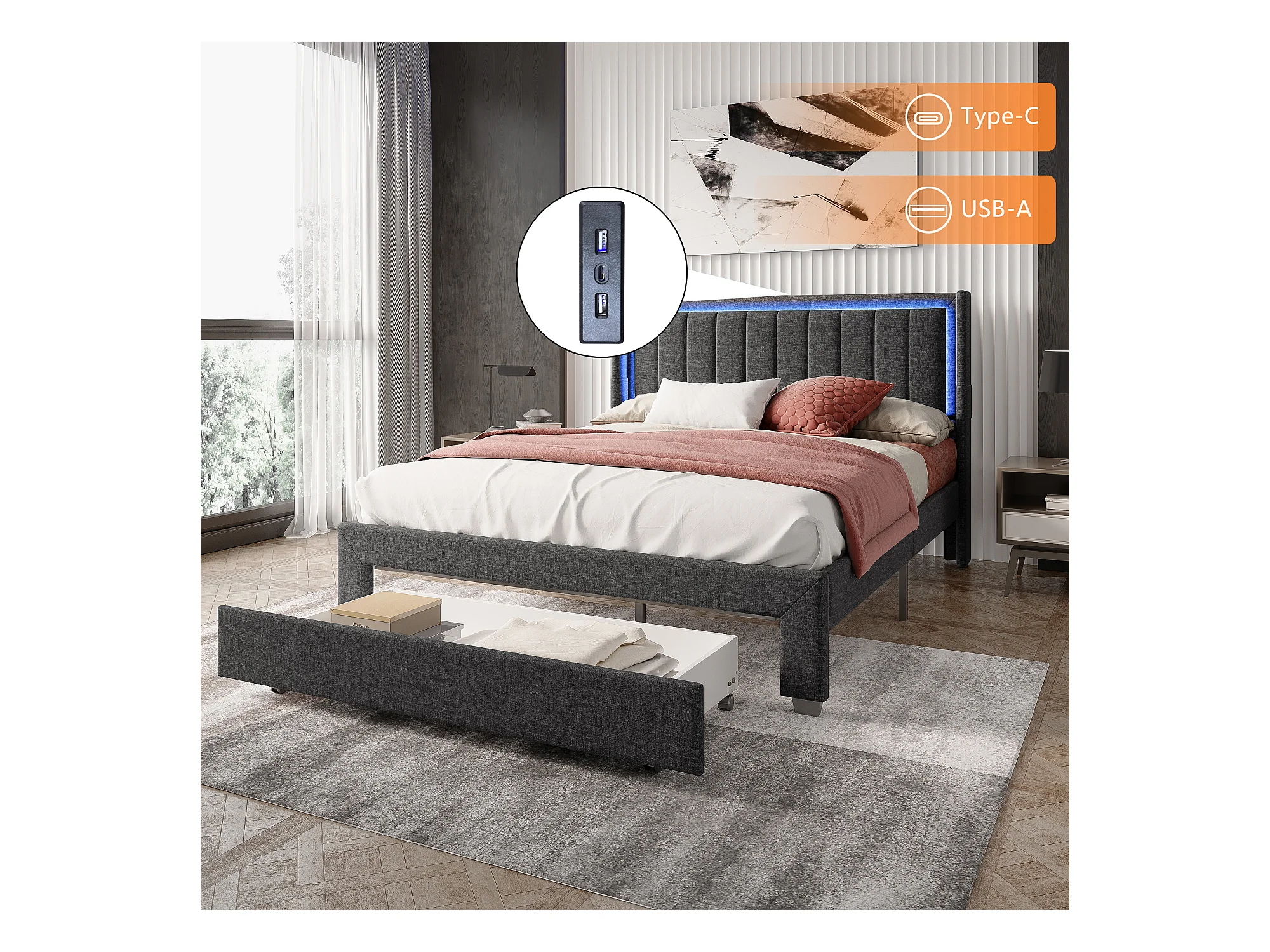 Lit Double Rembourré Lit 140x200cm, Cadre de Lit, Lit Coffre ,Lit Double, avec Sommier LED et USB ,1Tiroirs, Rangement,lin,Gris(sans Matelas)