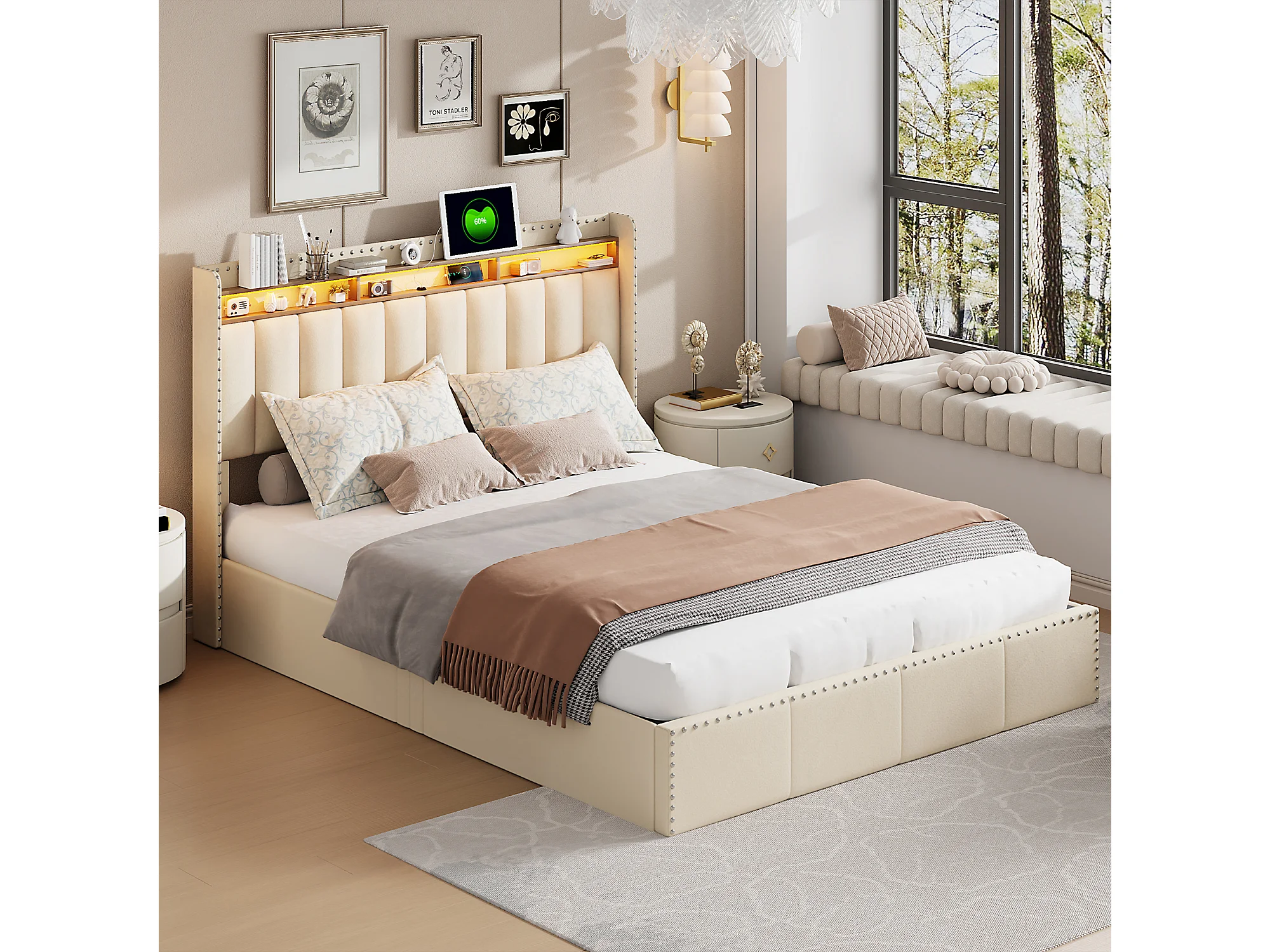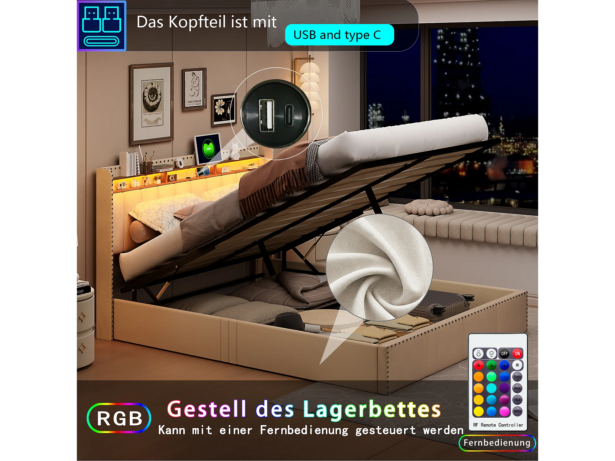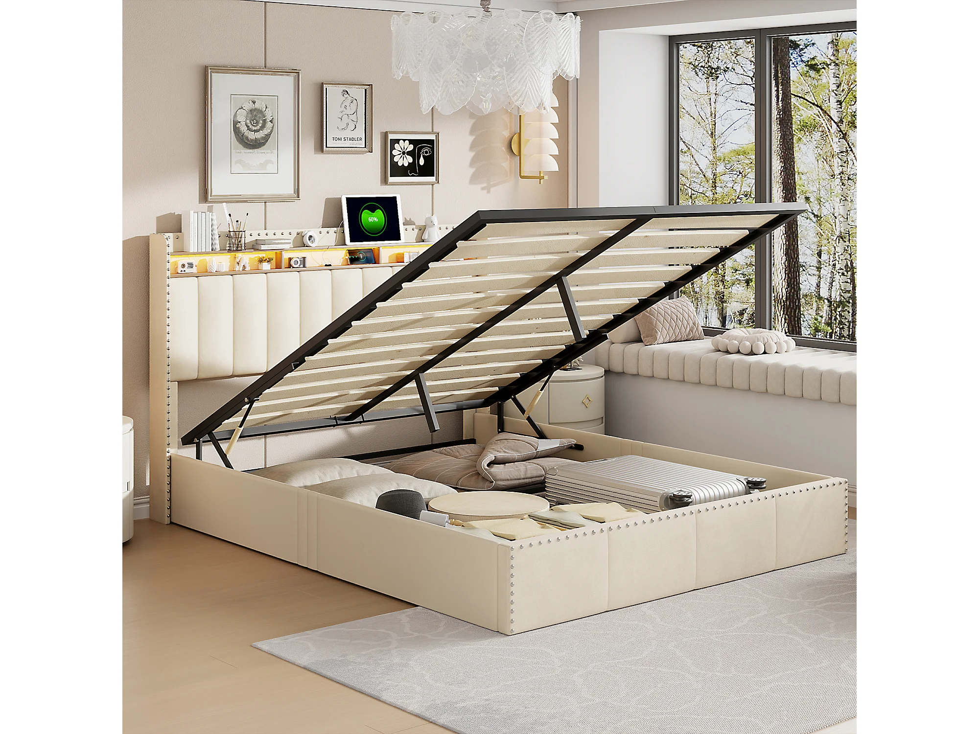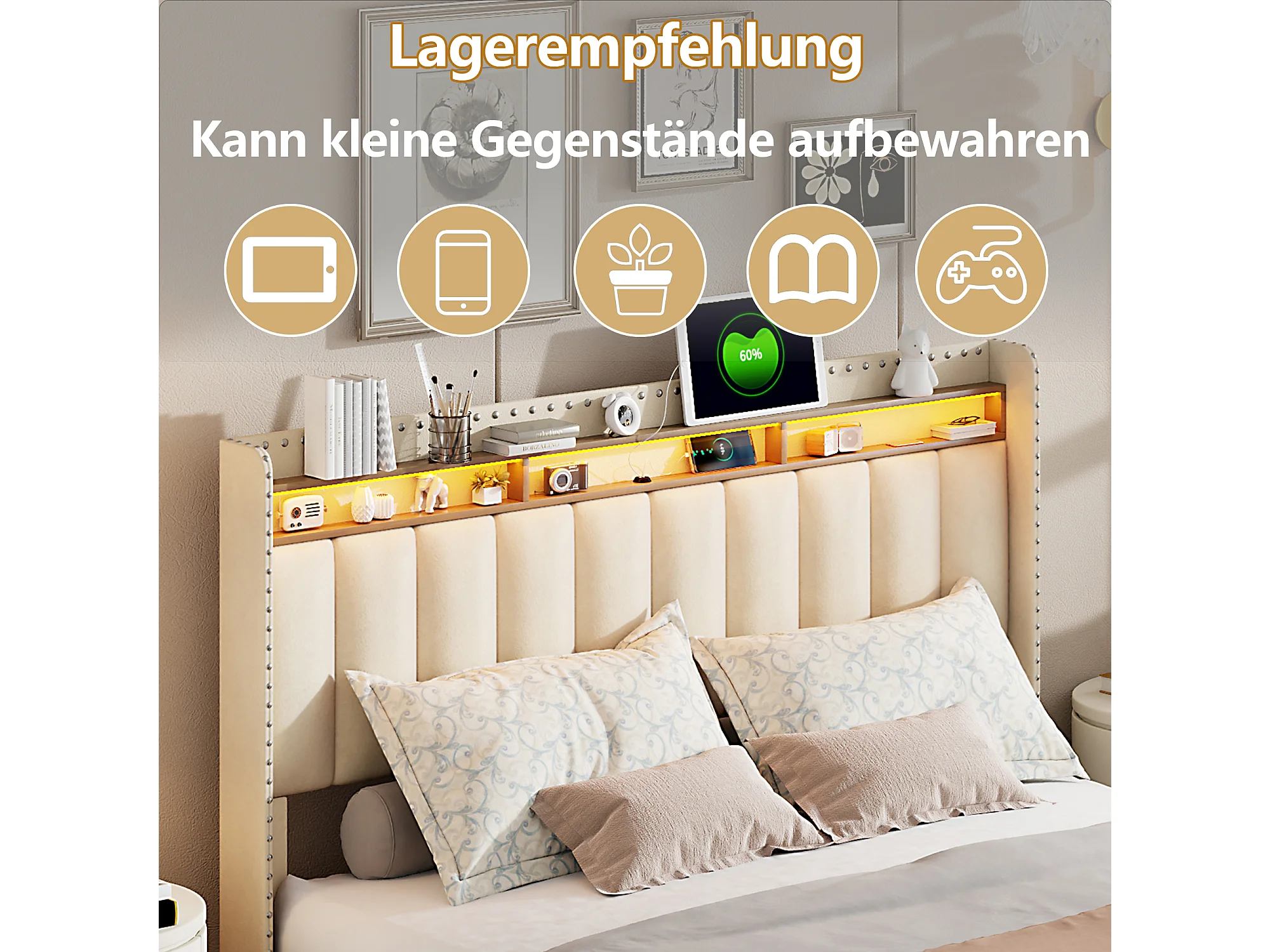 Lit Double, Rembourré Lit, 160x200cm, Cadre de Lit, Lit Coffre ,Lit Double avec Rangement sous Lit, Rangement, Velours, Beige (sans Matelas)
