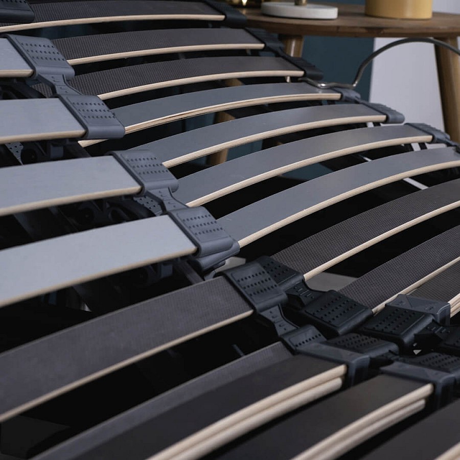 Suspension: 28 lattes décor, 35 x 8 mm ; zone lombaire, 6 doubles lattes avec régulateurs de confort indépendants