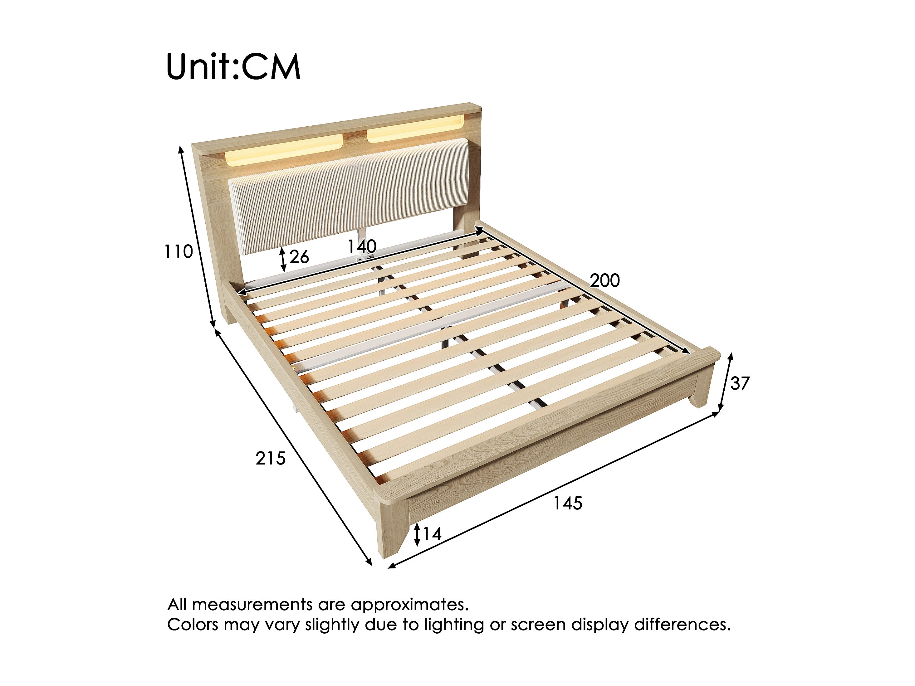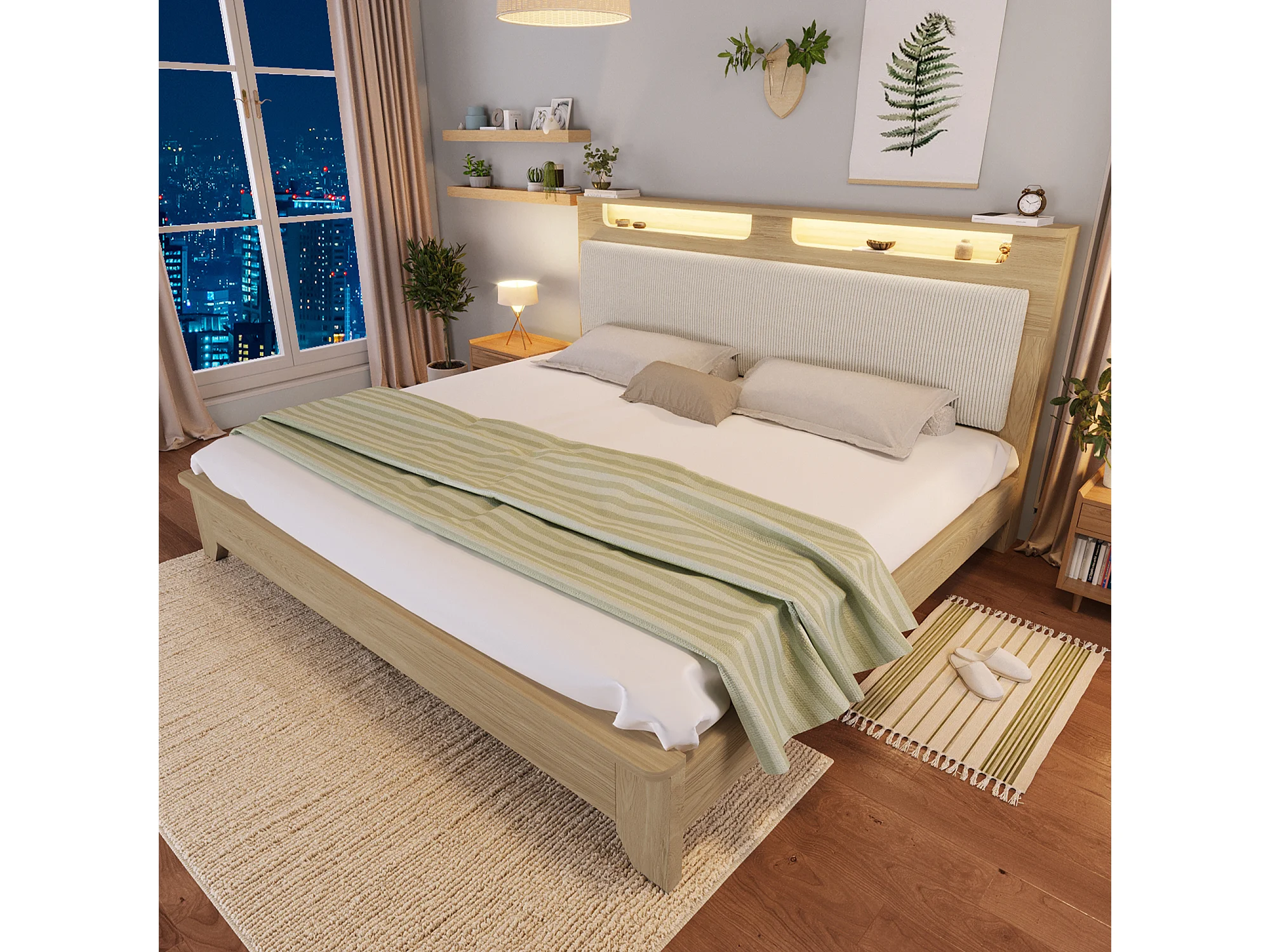 Lit en bois 140x200 cm, tête avec rangement et LED, dossier en velours côtelé beige, cadre bois chêne clair (Avec matelas)