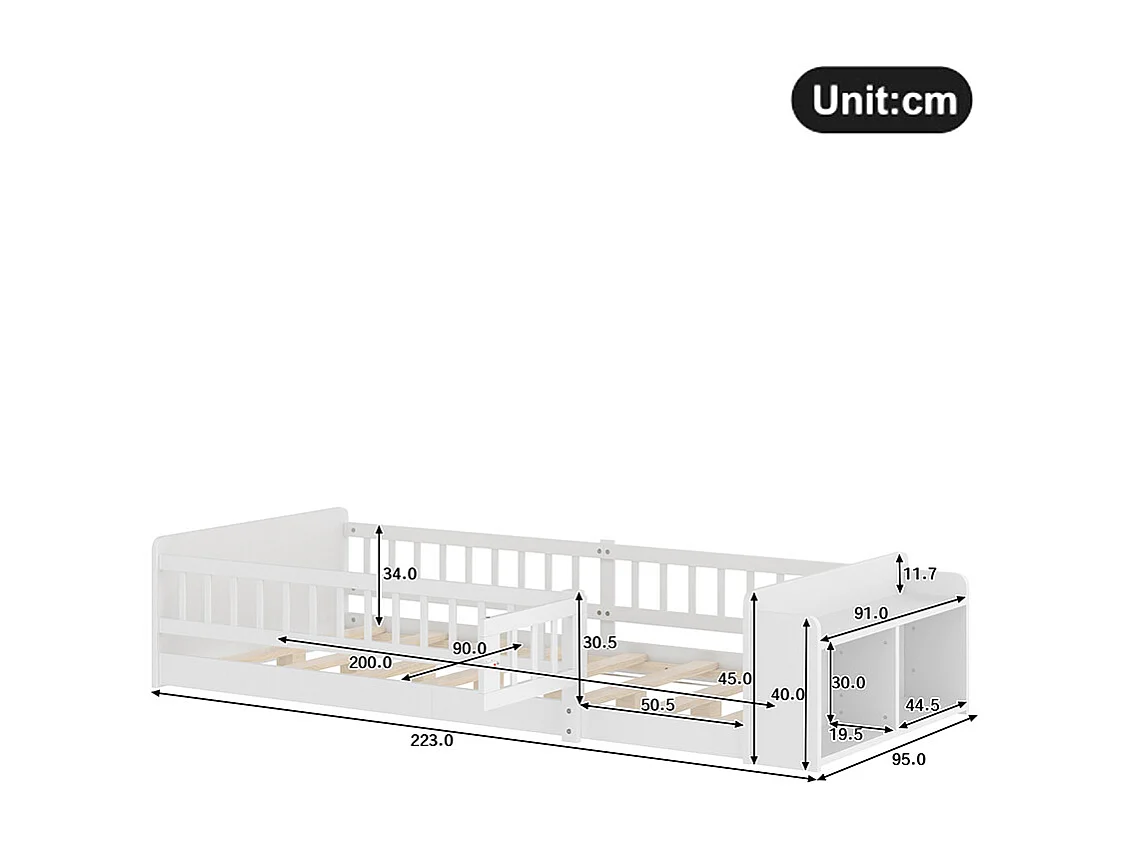 Lit en bois, lit d'enfant 90x200cm, avec rangement ouvert, étagères, armoire ouvrante, pin+mdf, blanc, sans matelas