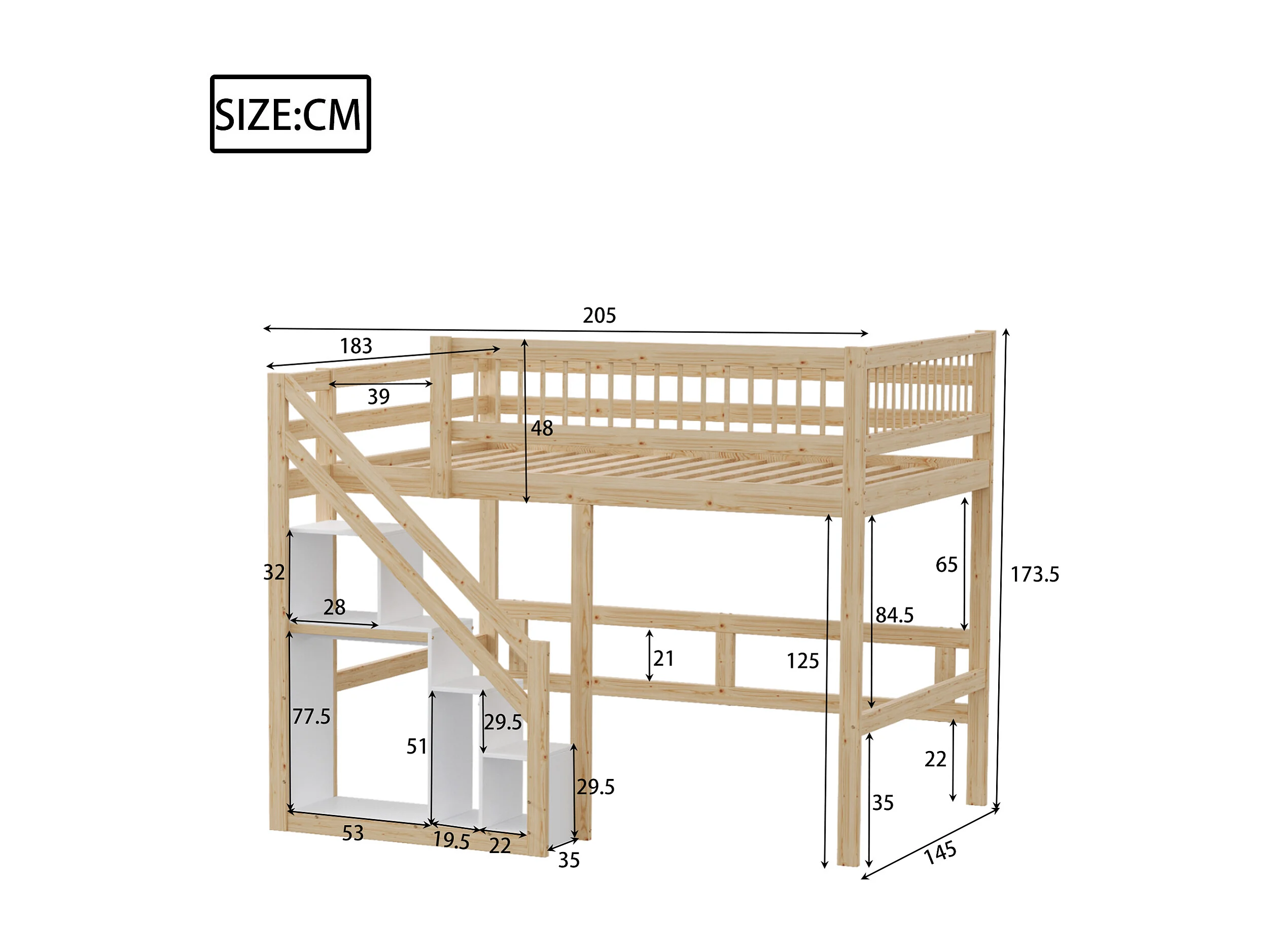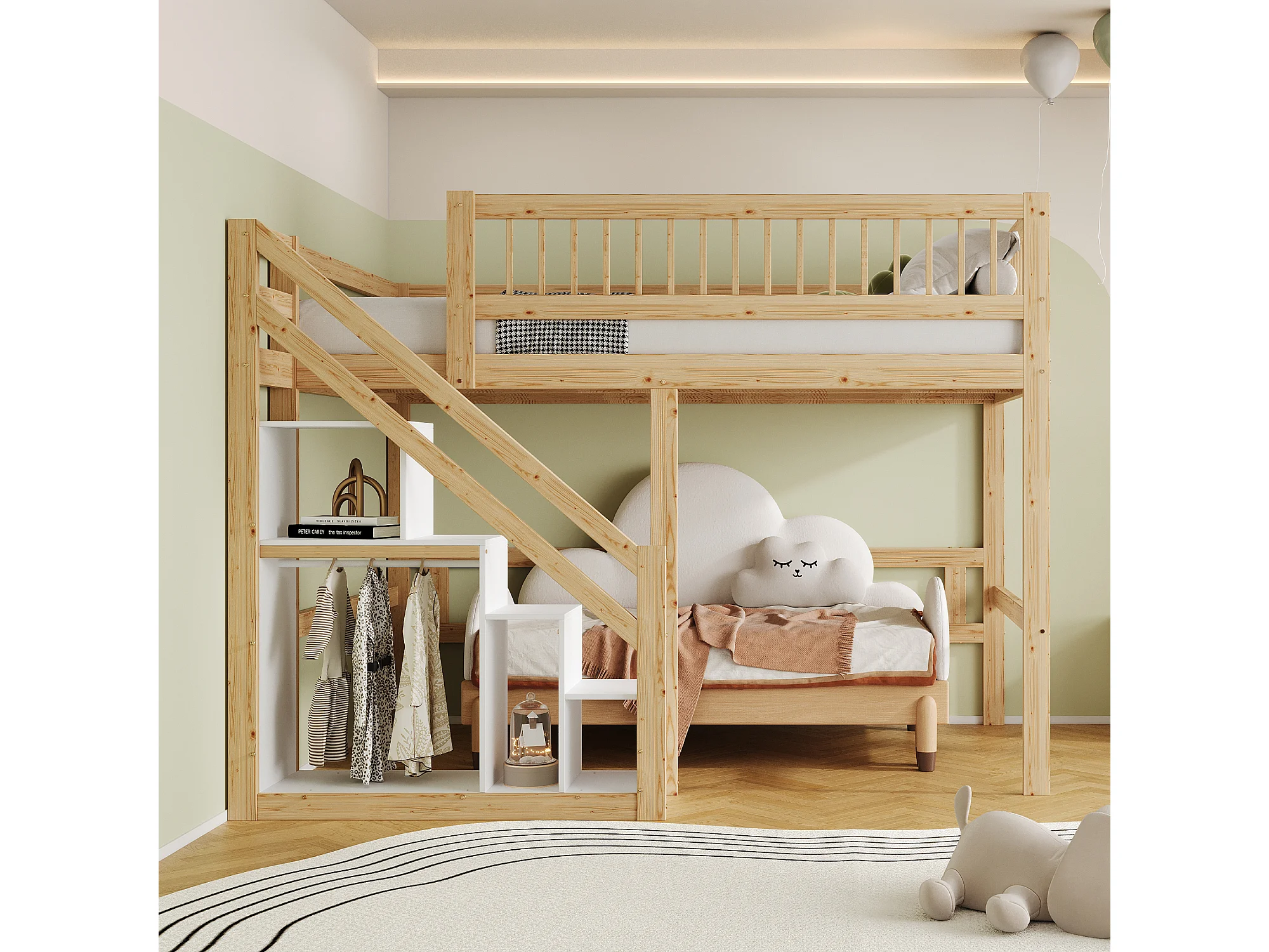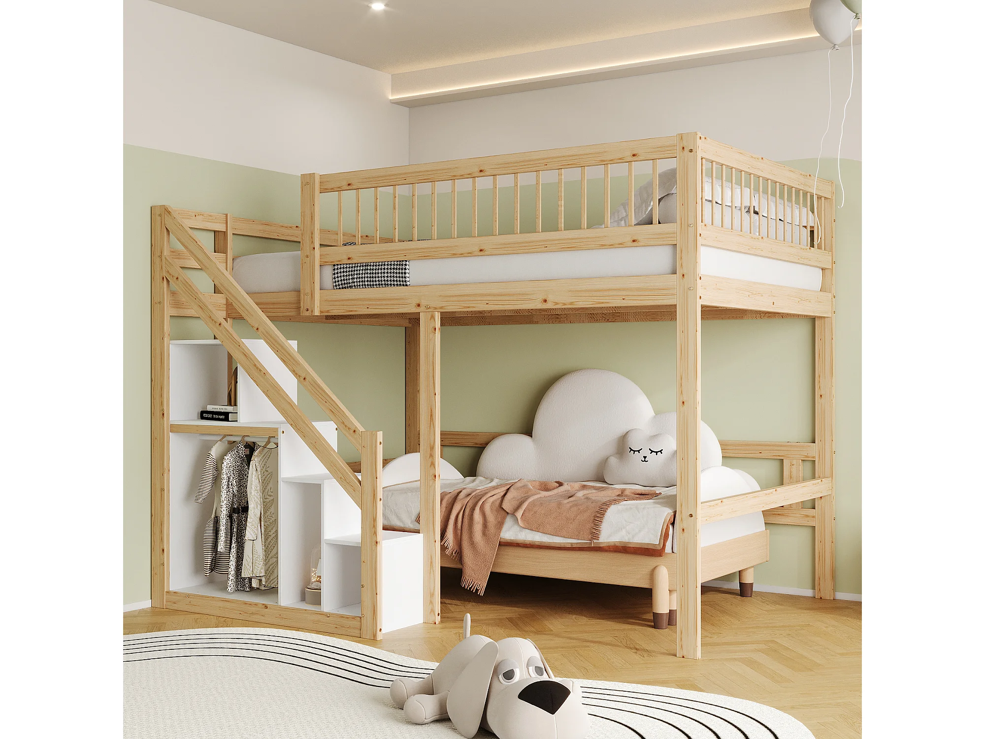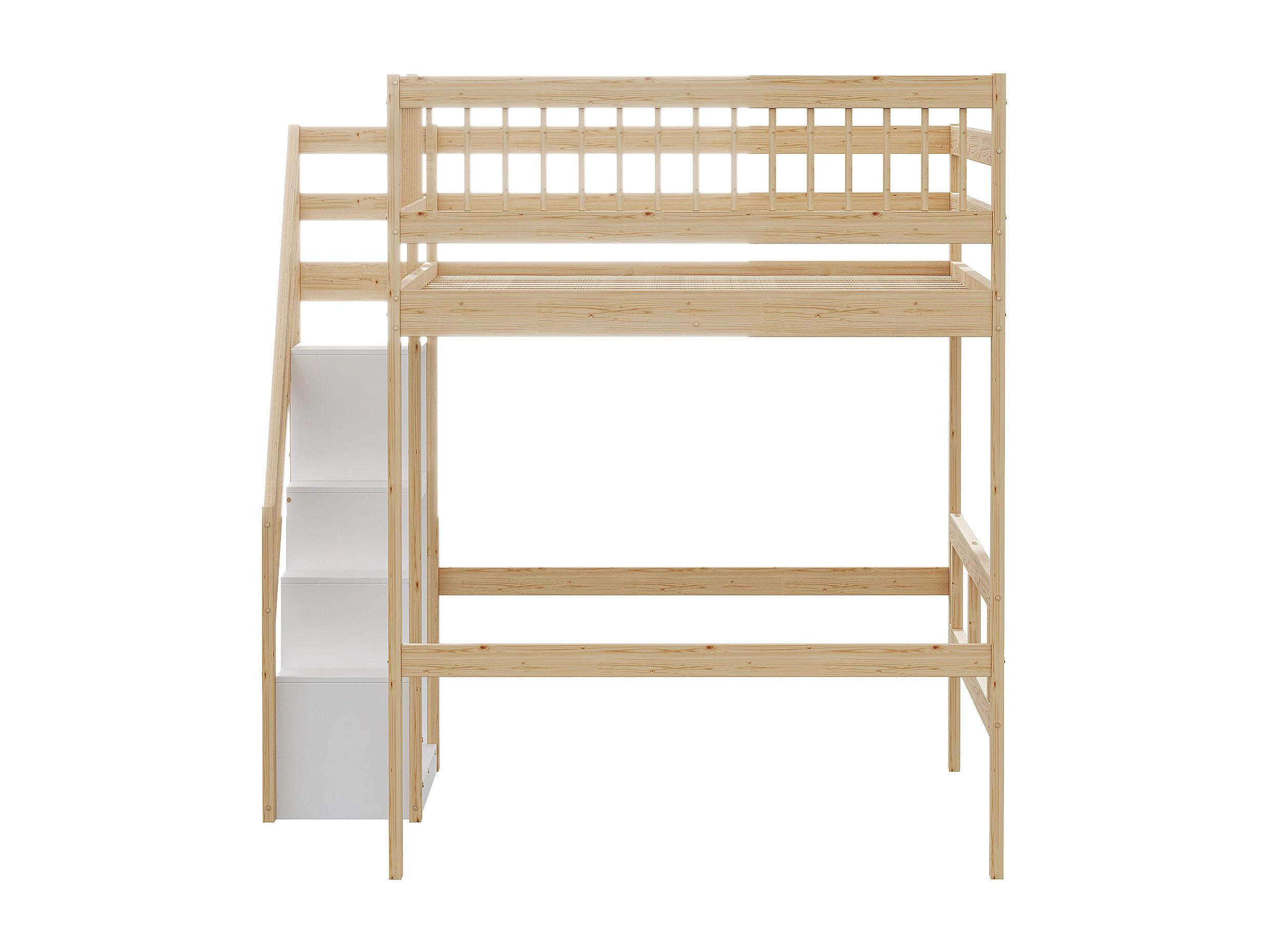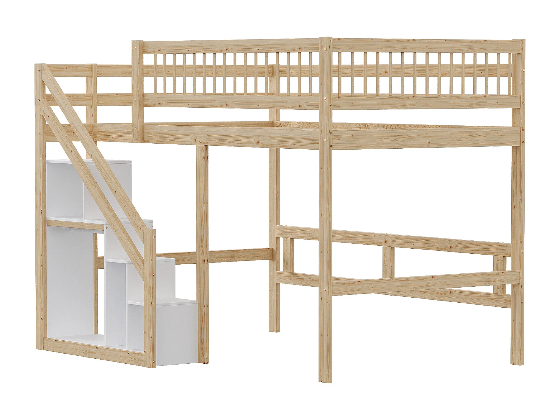 Lit en bois massif 140x200 cm naturel, avec escalier à rangement intégré et barrière sécurisée, design haut