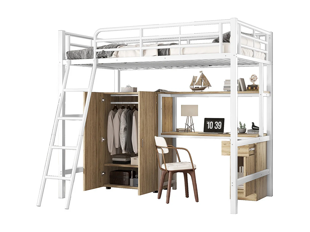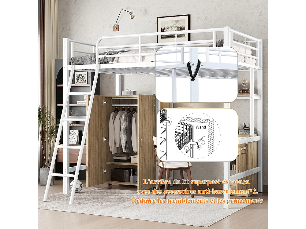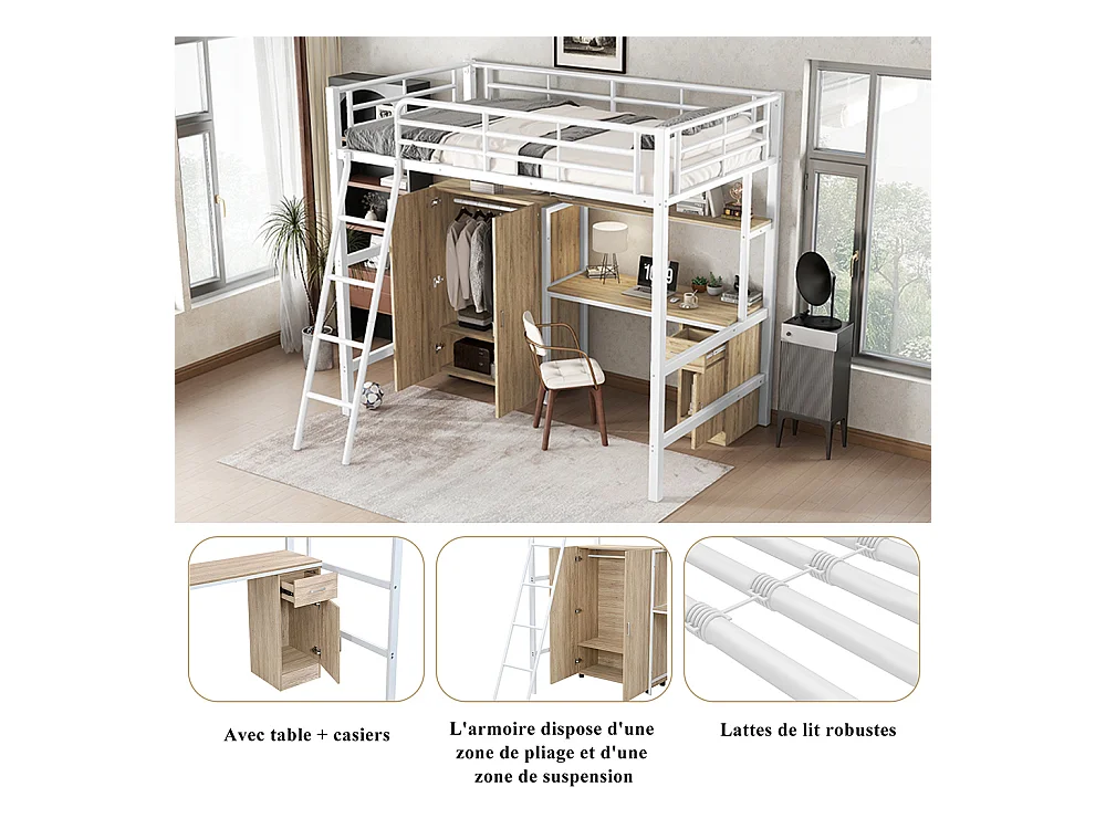 Lit en fer 90x200cm, avec table et armoire, nombreux rangements, fer+aggloméré, blanc+naturel,