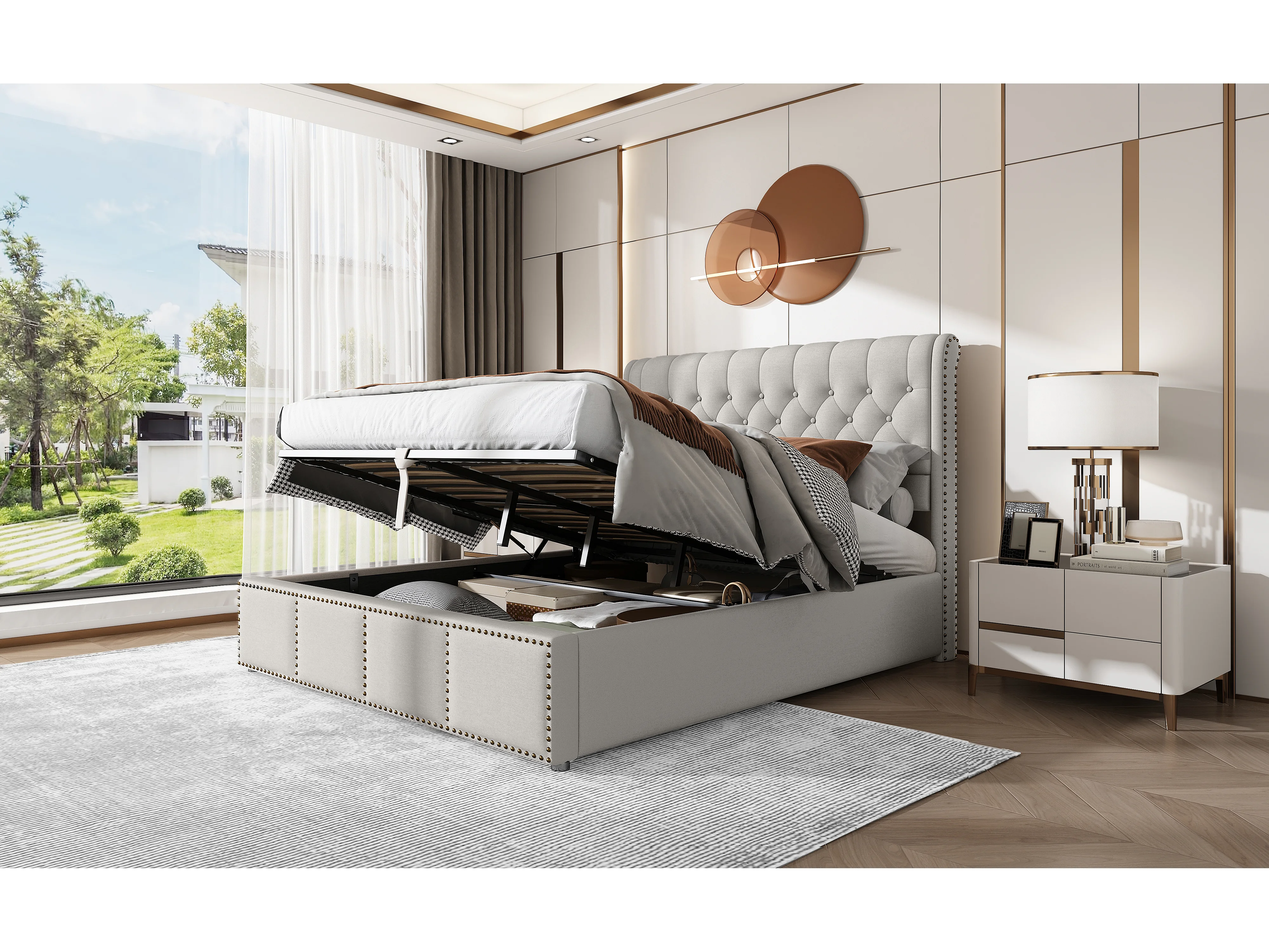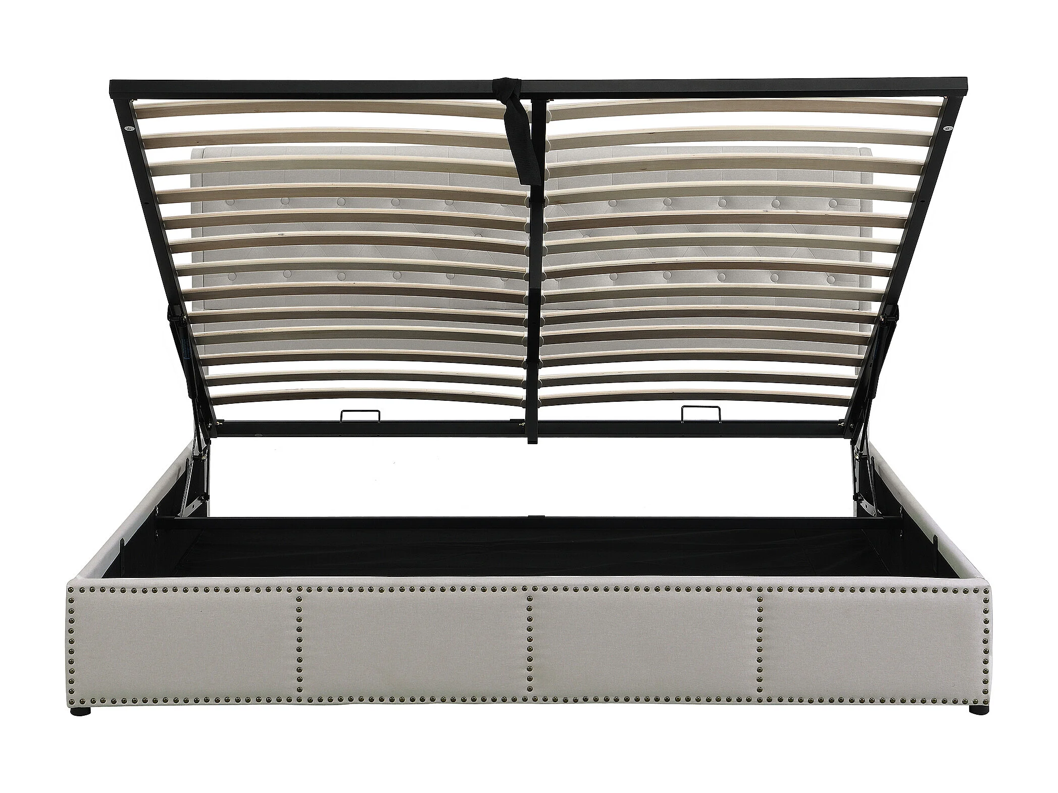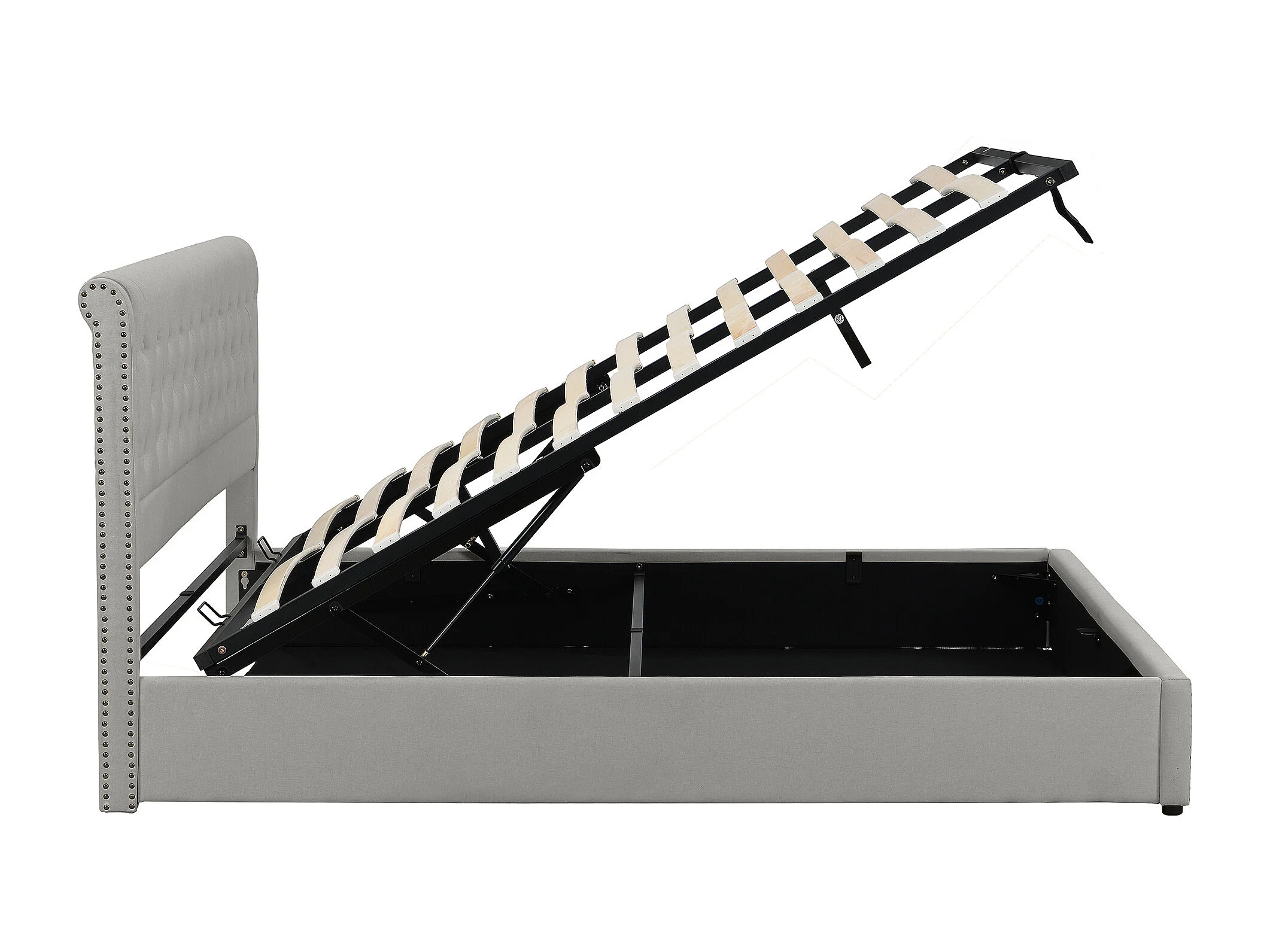 Lit en lin gris 140×200 cm avec rangement, tête de lit rembourrée et design élégant