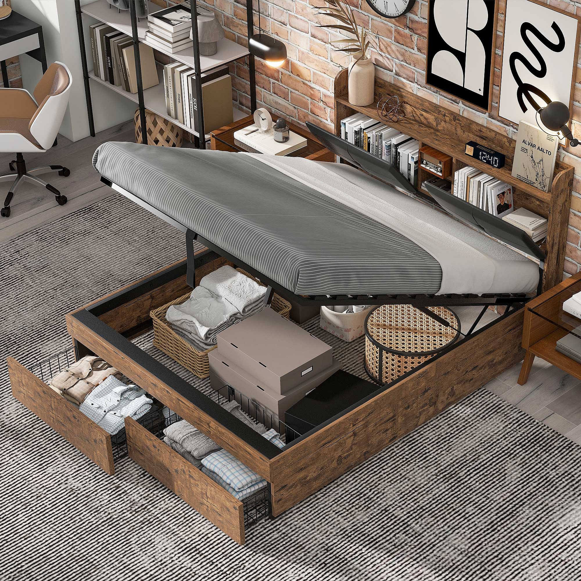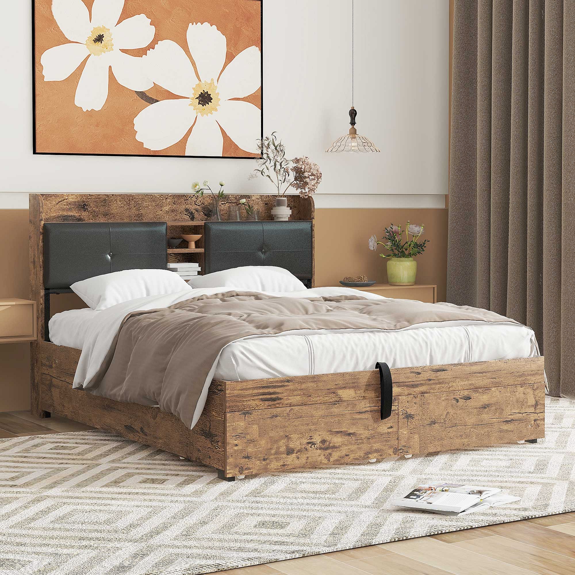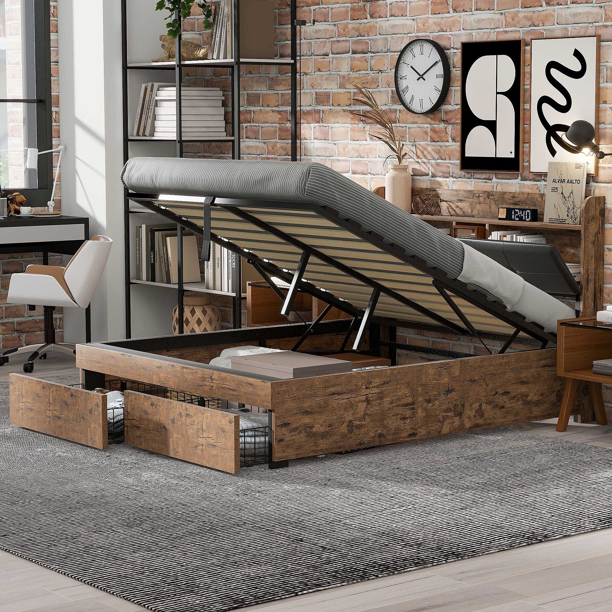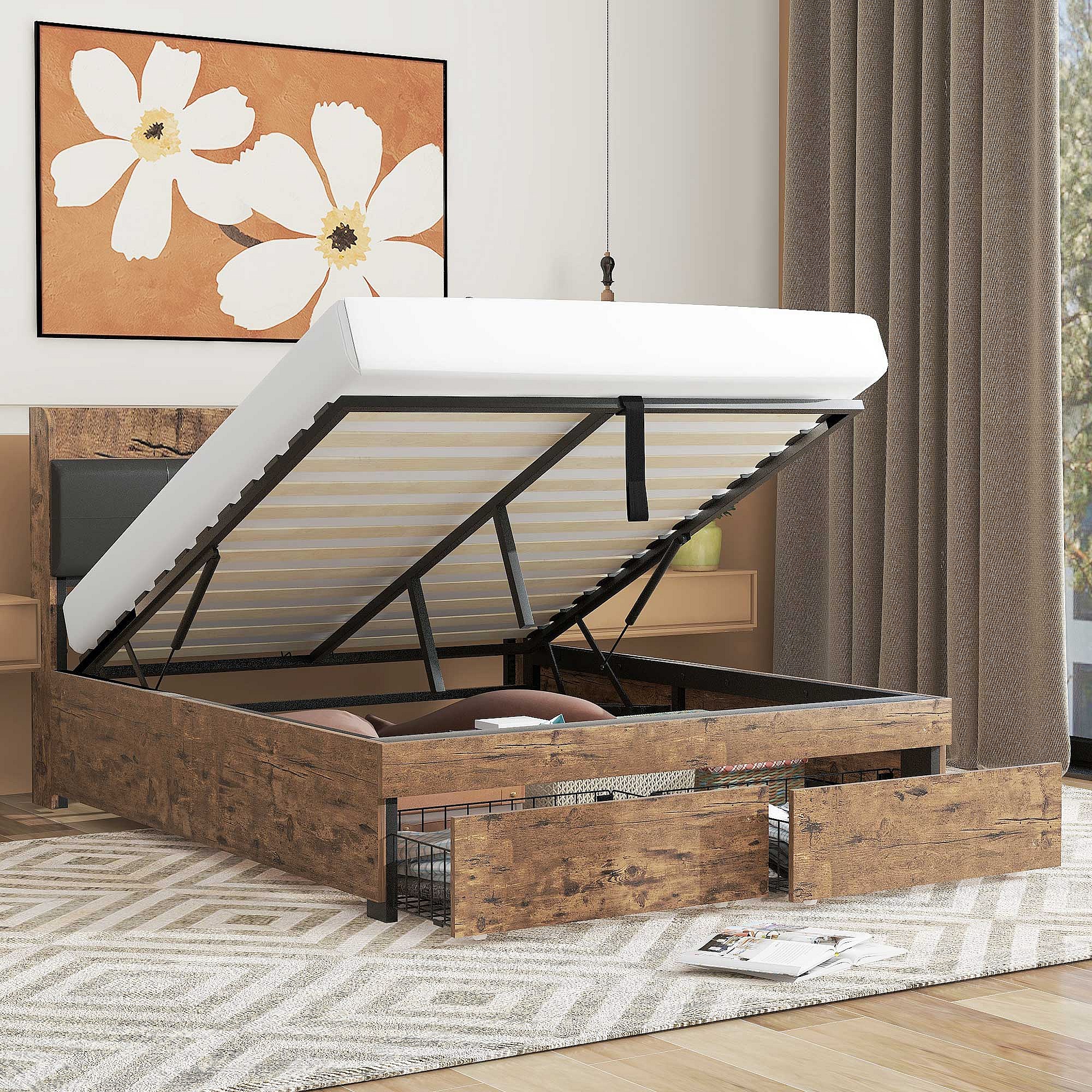 Lit en métal 140 x 200 cm avec tête de lit de rangement, 2 tiroirs et sommier à lattes en métal