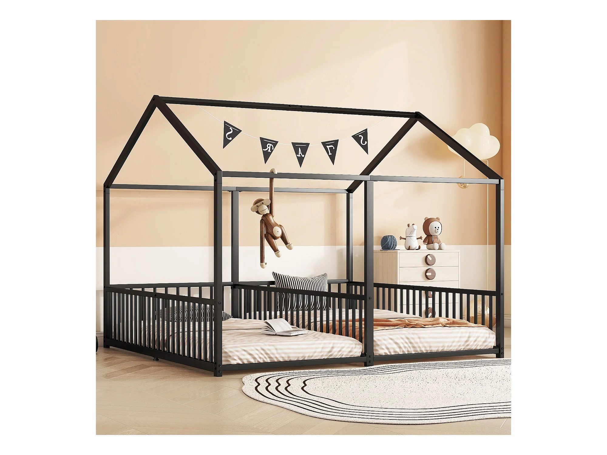 Lit en métal pour enfant 90x200 cm noir, cadre maison, avec échelle et barrière de sécurité, design double, sans matelas
