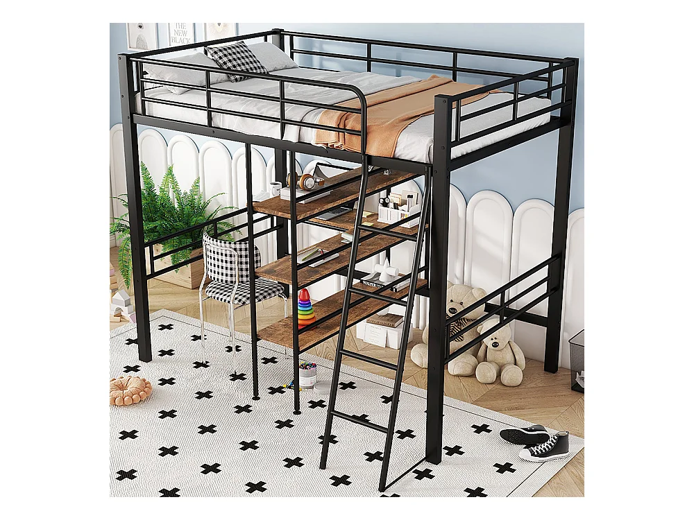 Lit en mezzanine 90*200 cm, sans matelas, lit avec bureau, plusieurs étagères, rails, échelle, Noir