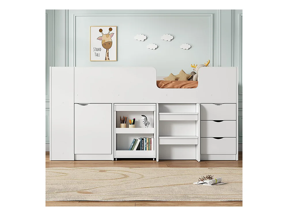Lit en mezzanine, 90*200 Lit d'enfant avec échelle, bureau, armoire amovible, tiroirs, blanc