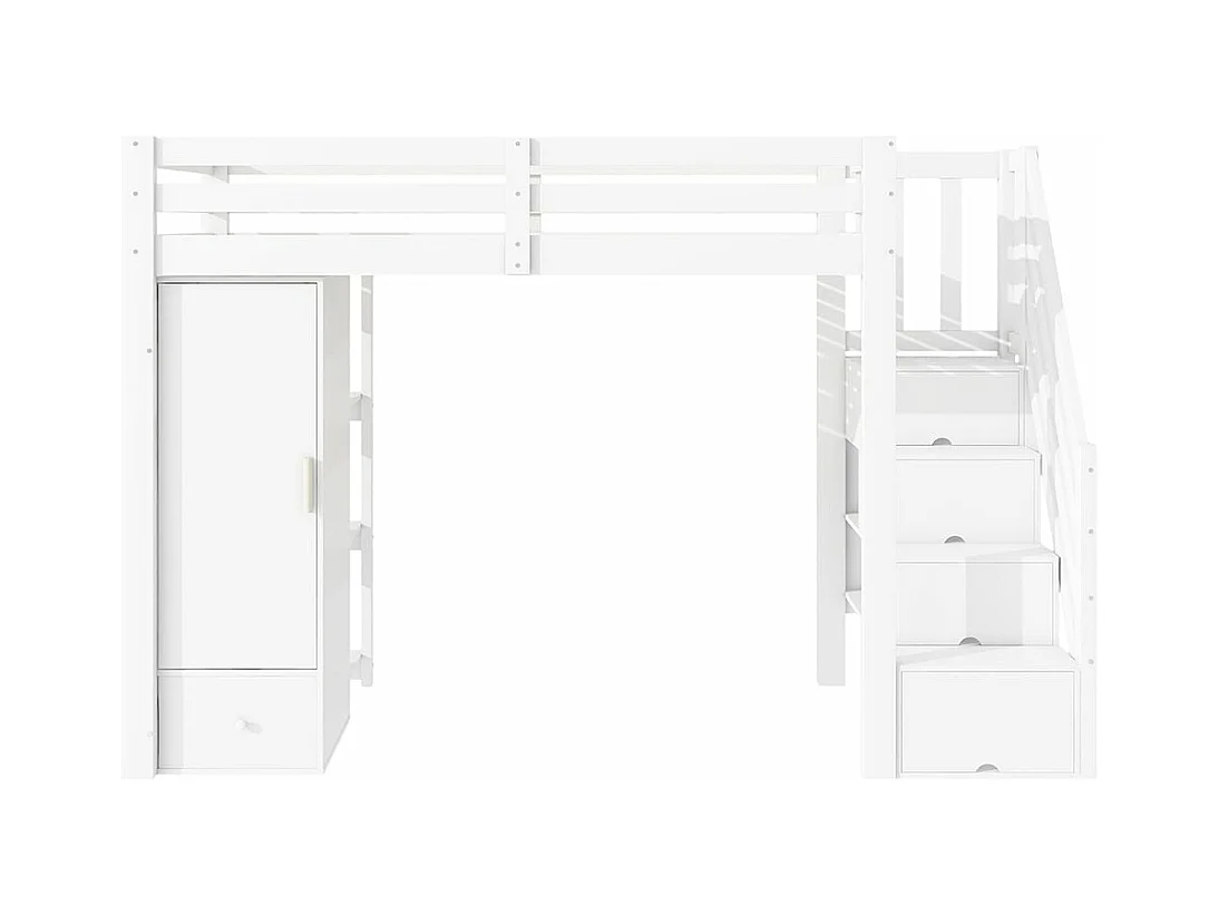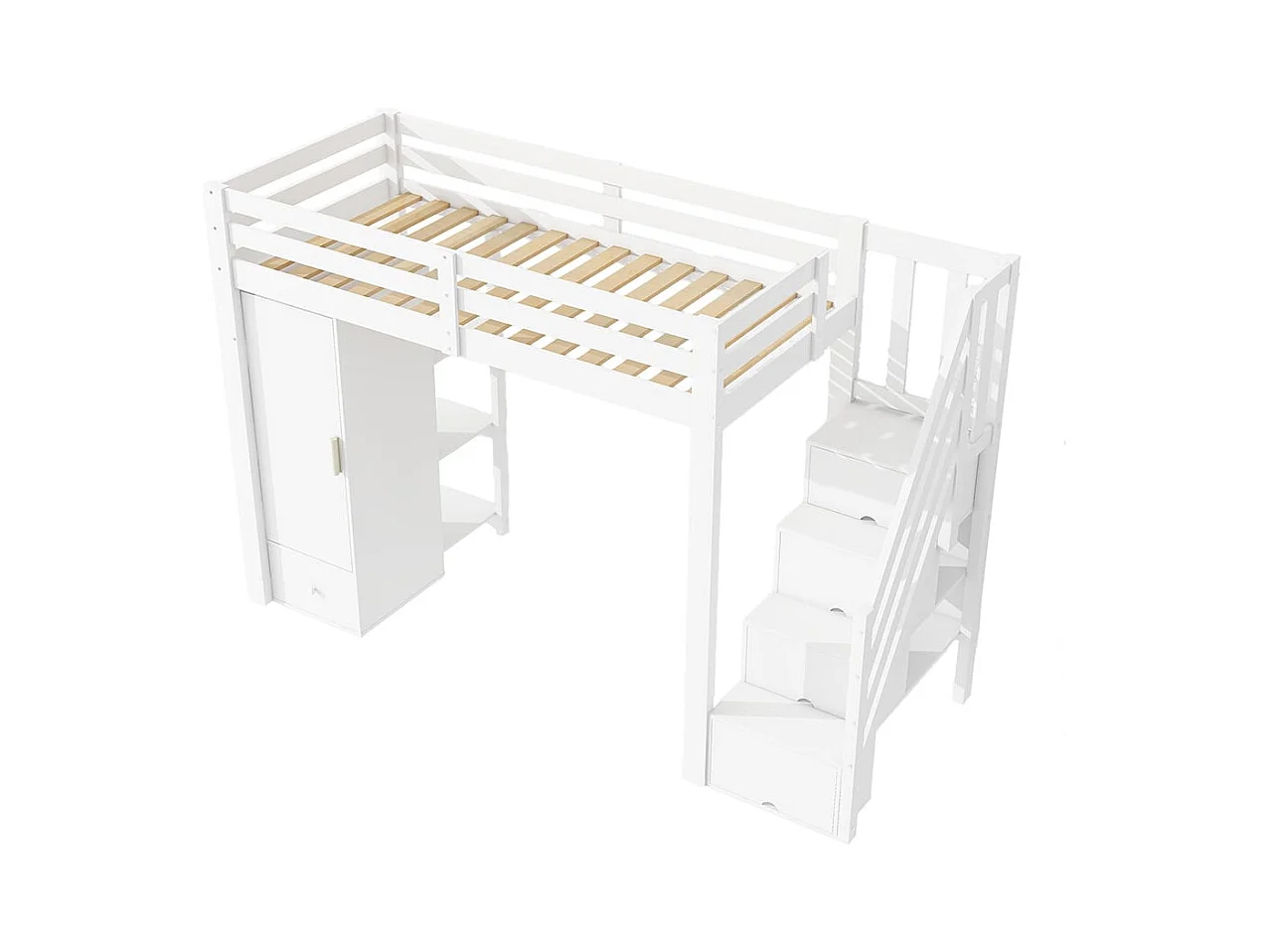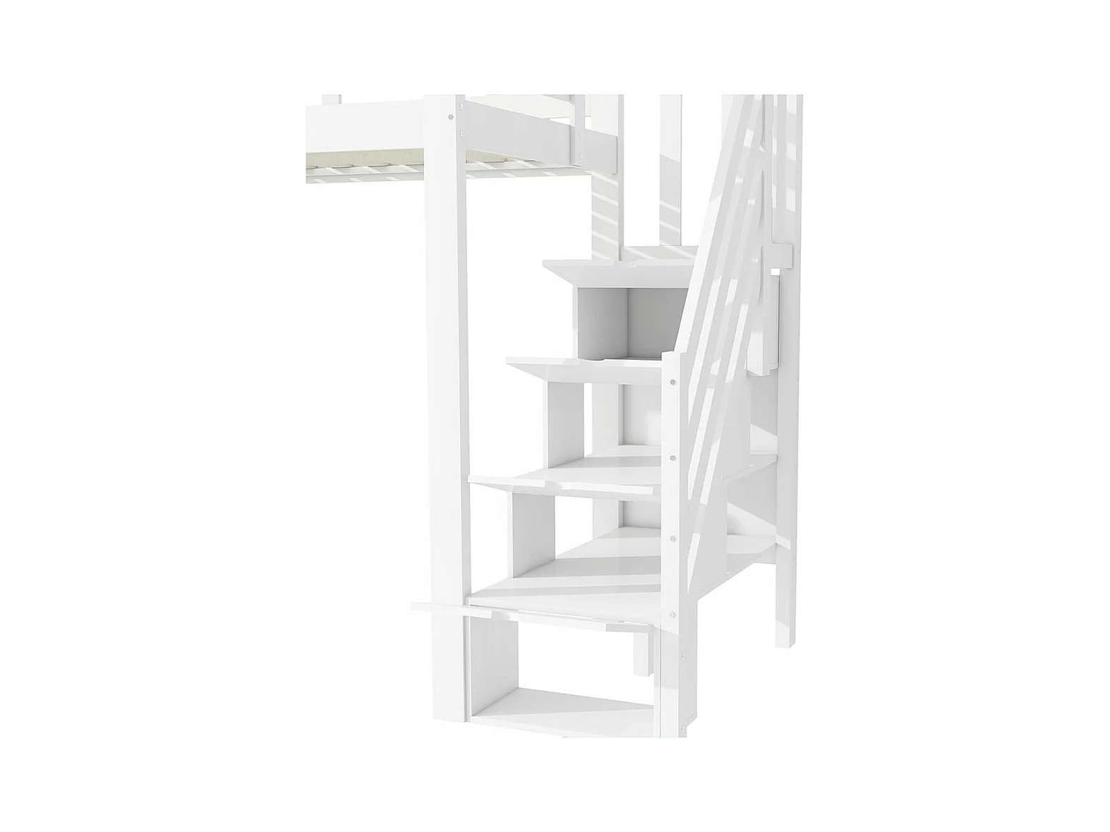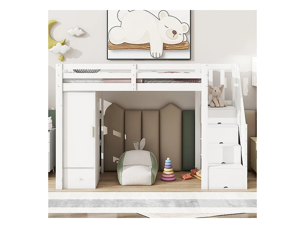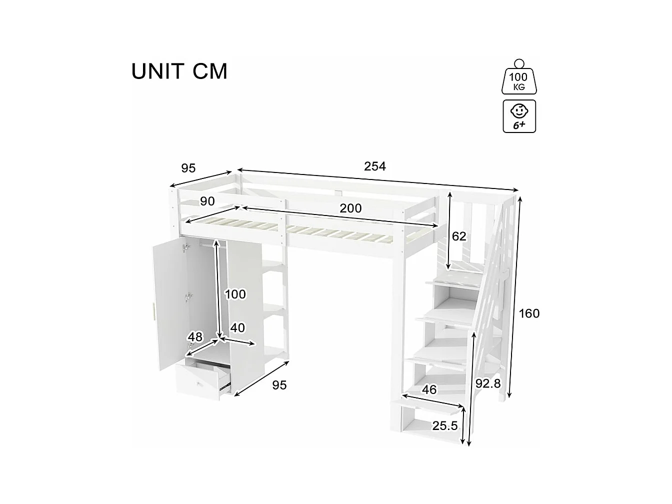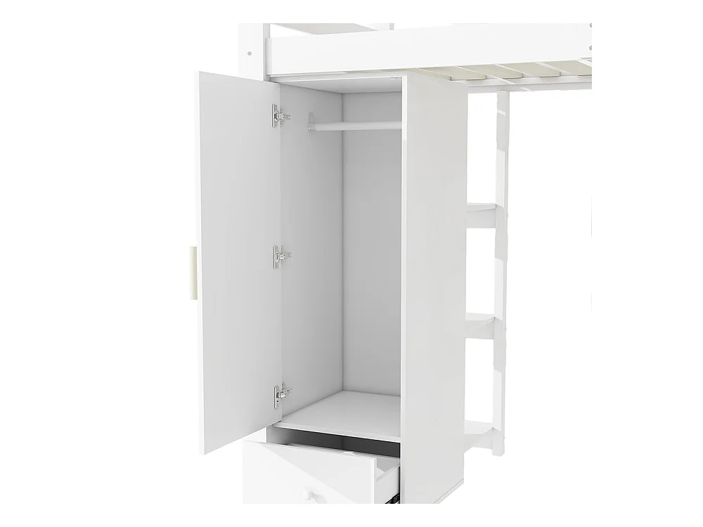 Lit en mezzanine, 90x200 cm, sans matelas, mains courantes, échelle escamotable, tiroirs, armoire, plusieurs étagères, espace combinable libre, blanc