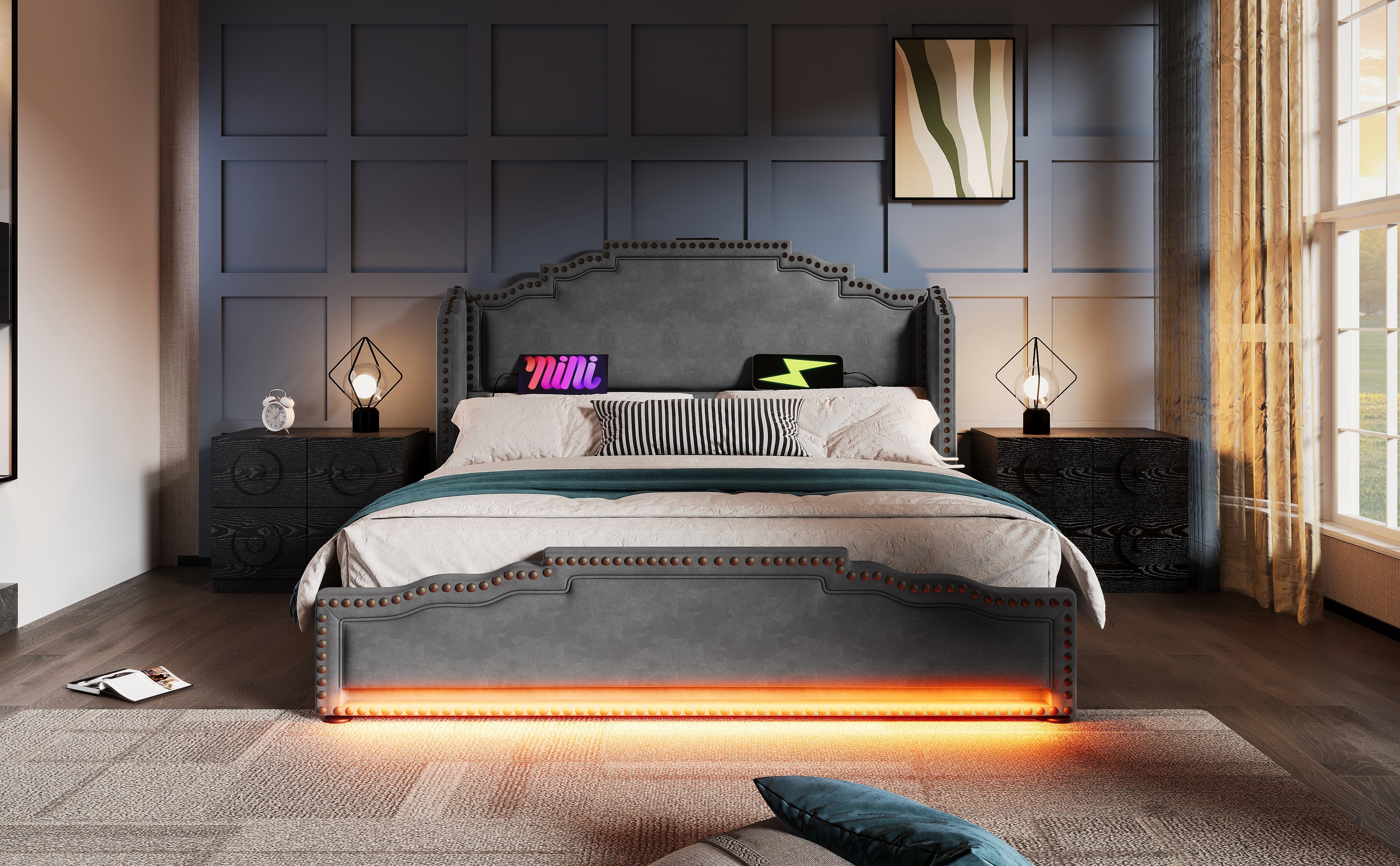 Lit en velours 140×200 cm avec 4 tiroirs, éclairage LED et ports USB-C, lit de rangement et lit d'adolescent