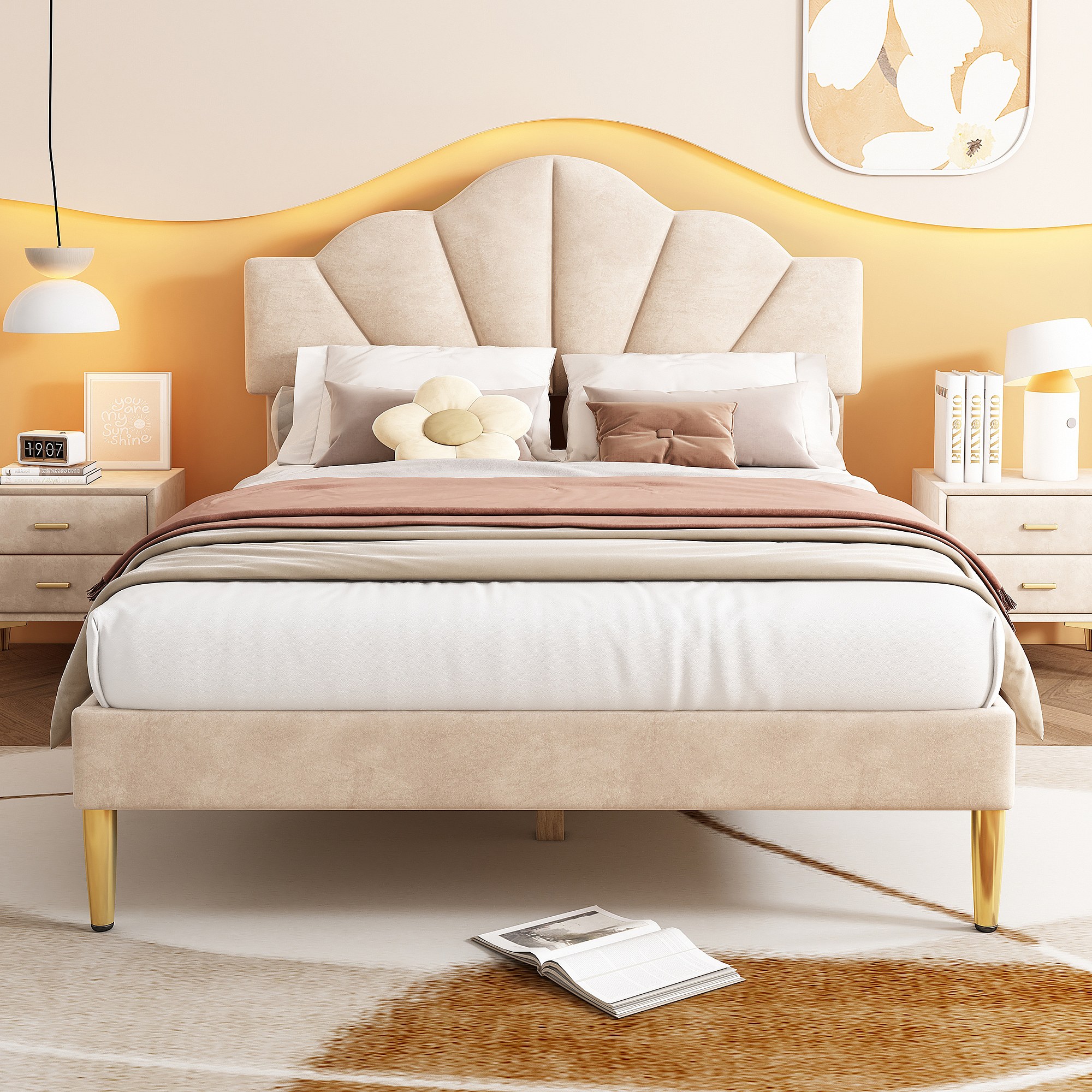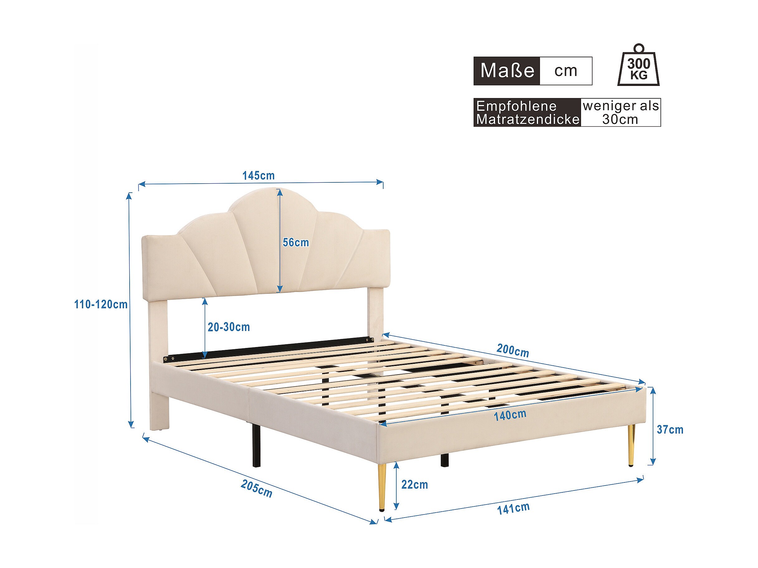 Lit en velours 140×200 cm, design élégant avec tête de lit réglable et pieds en fer doré