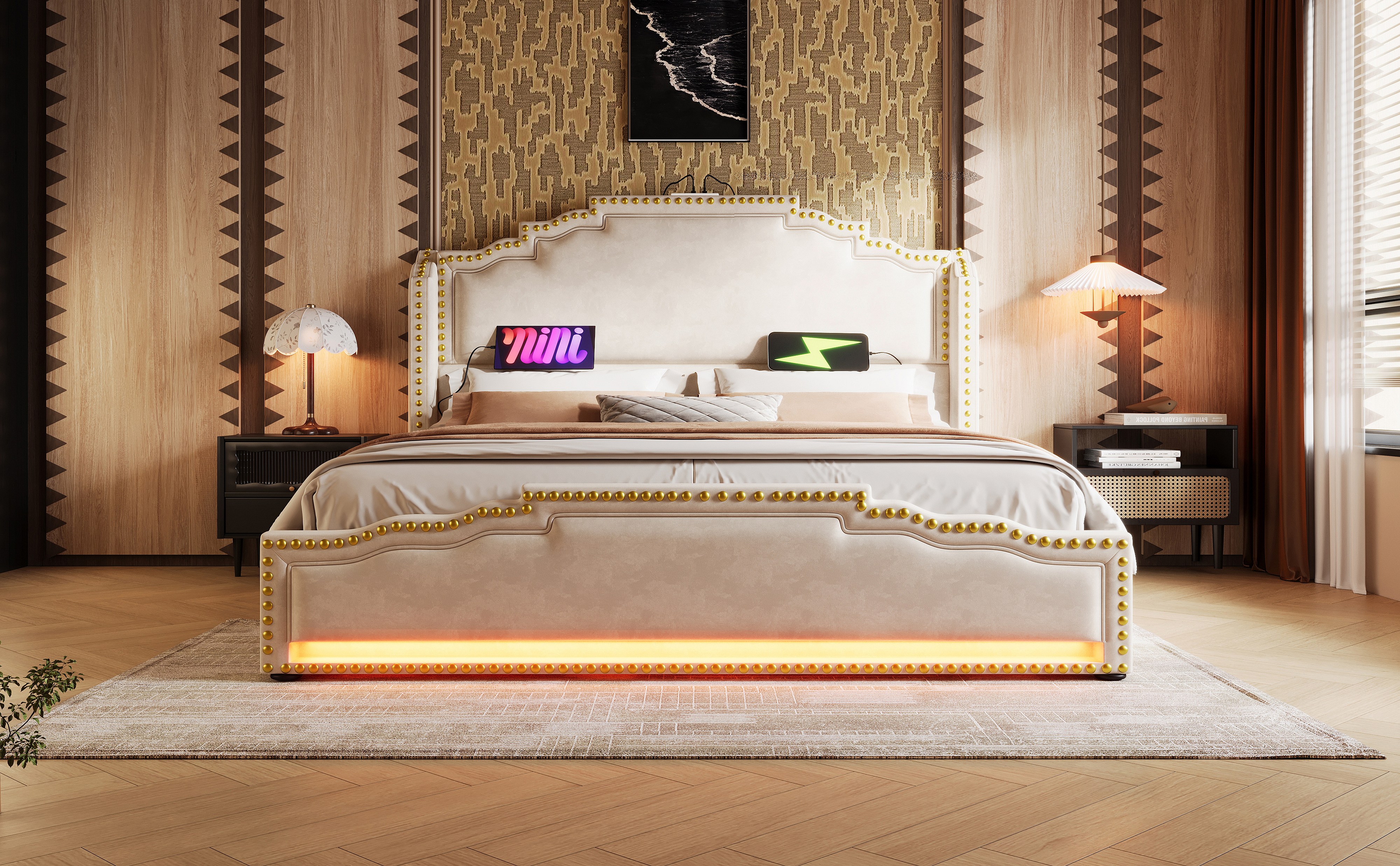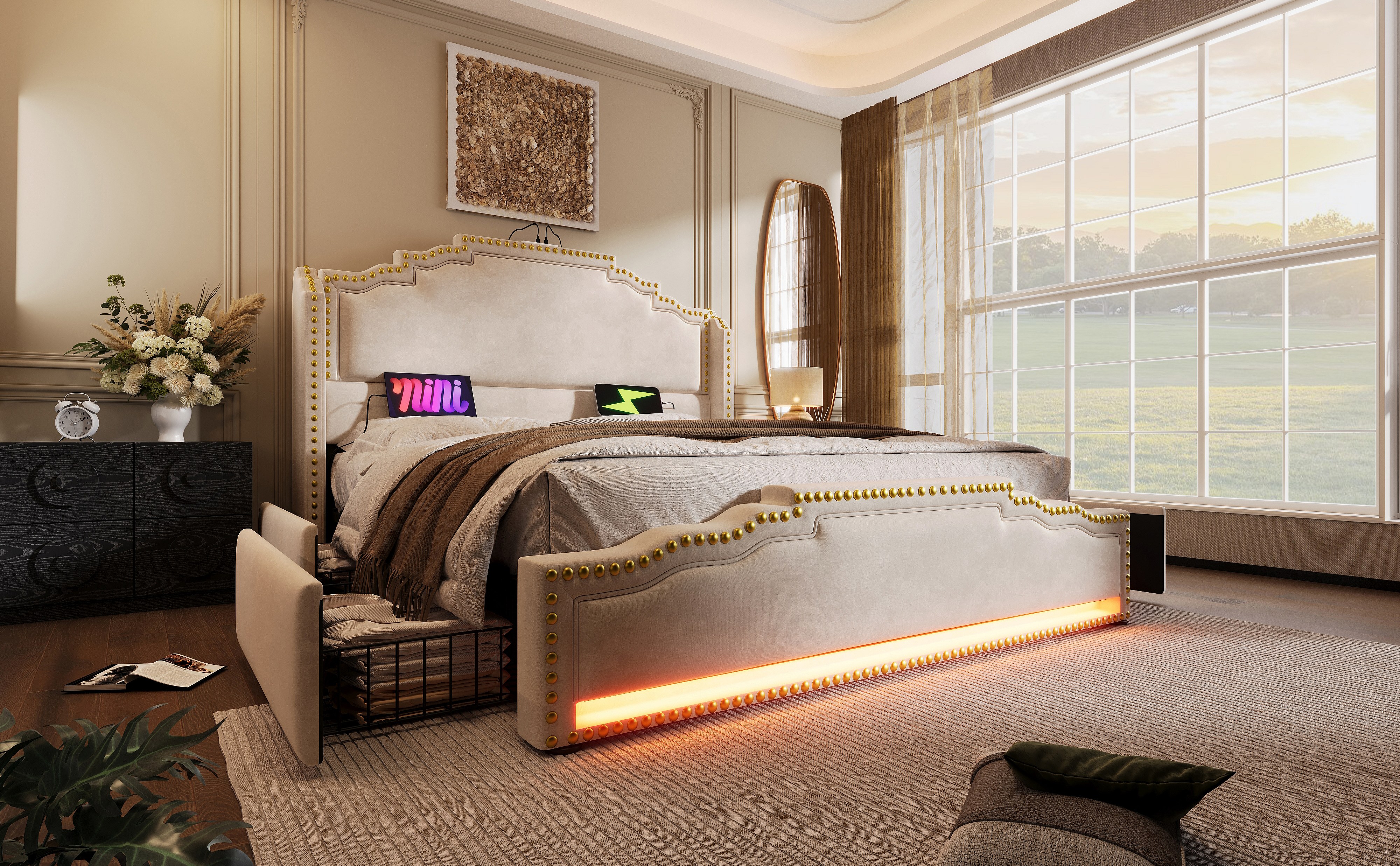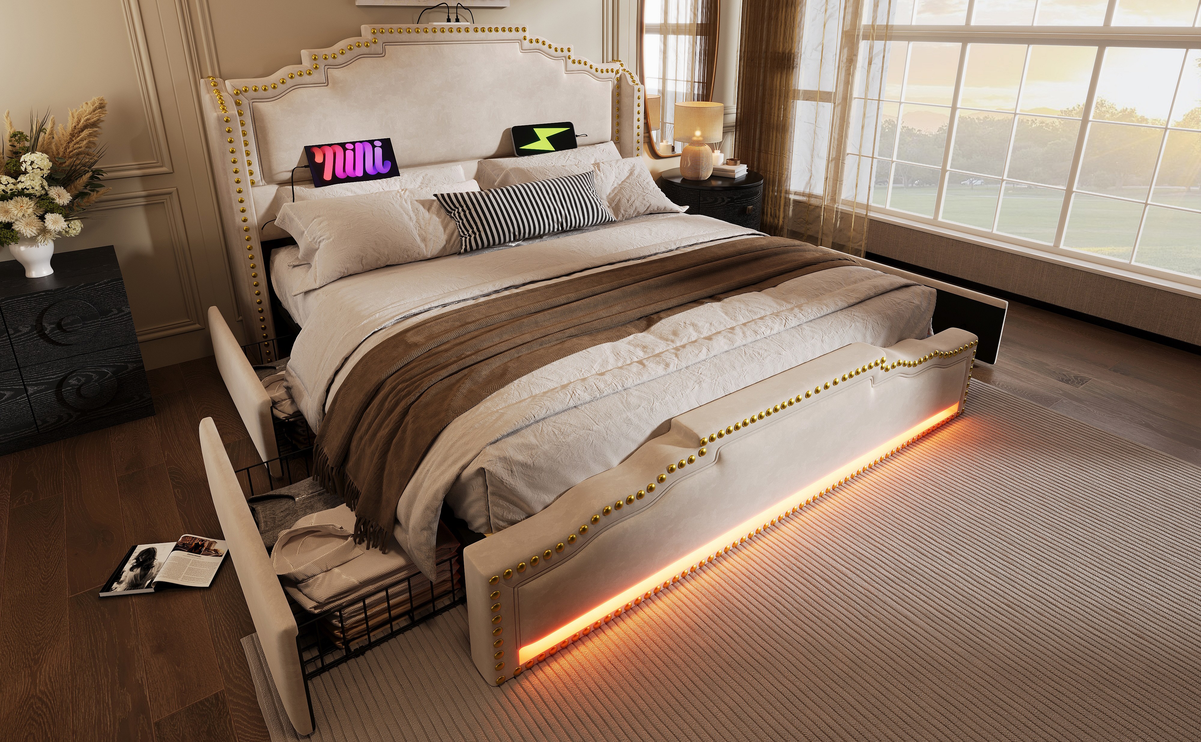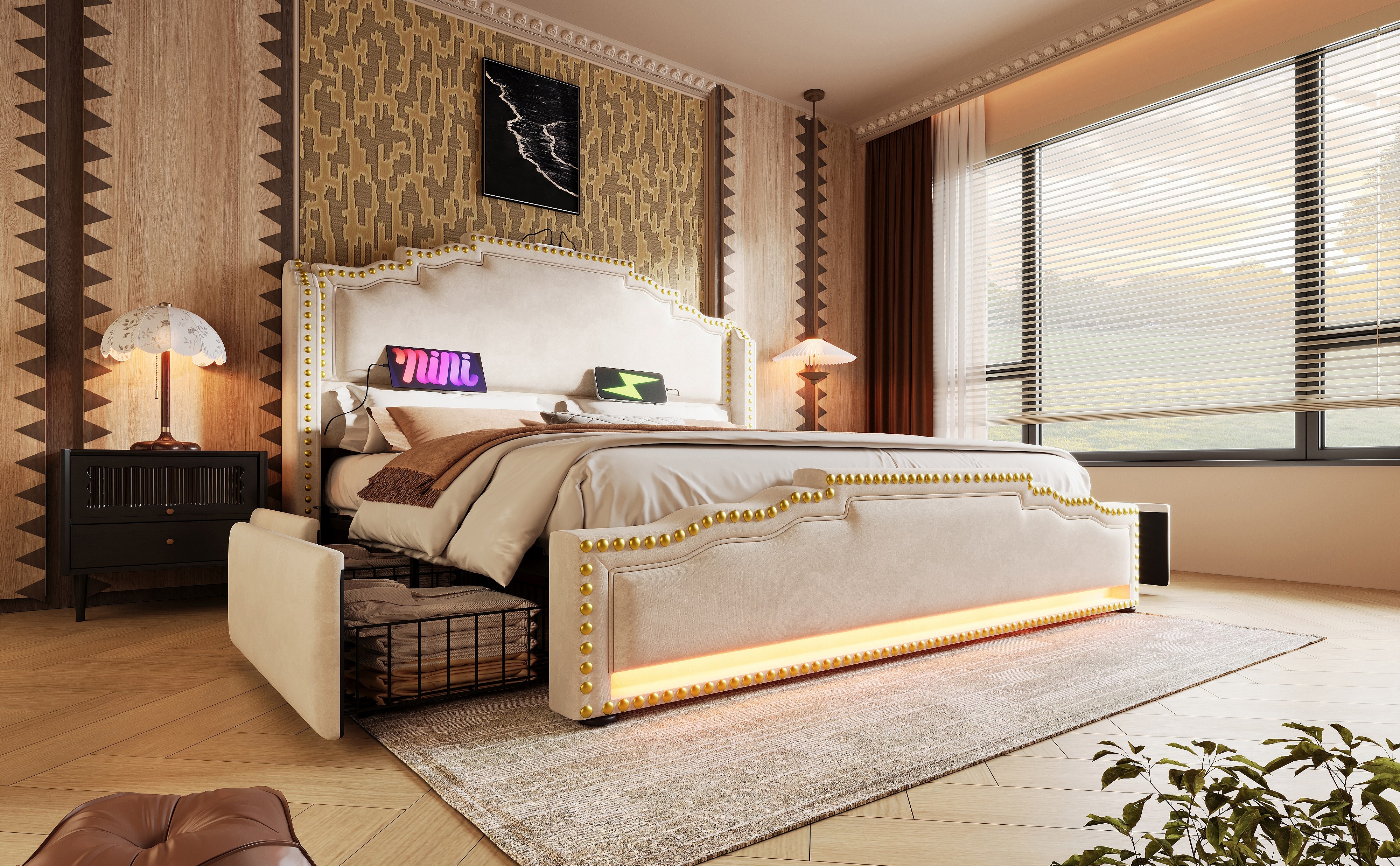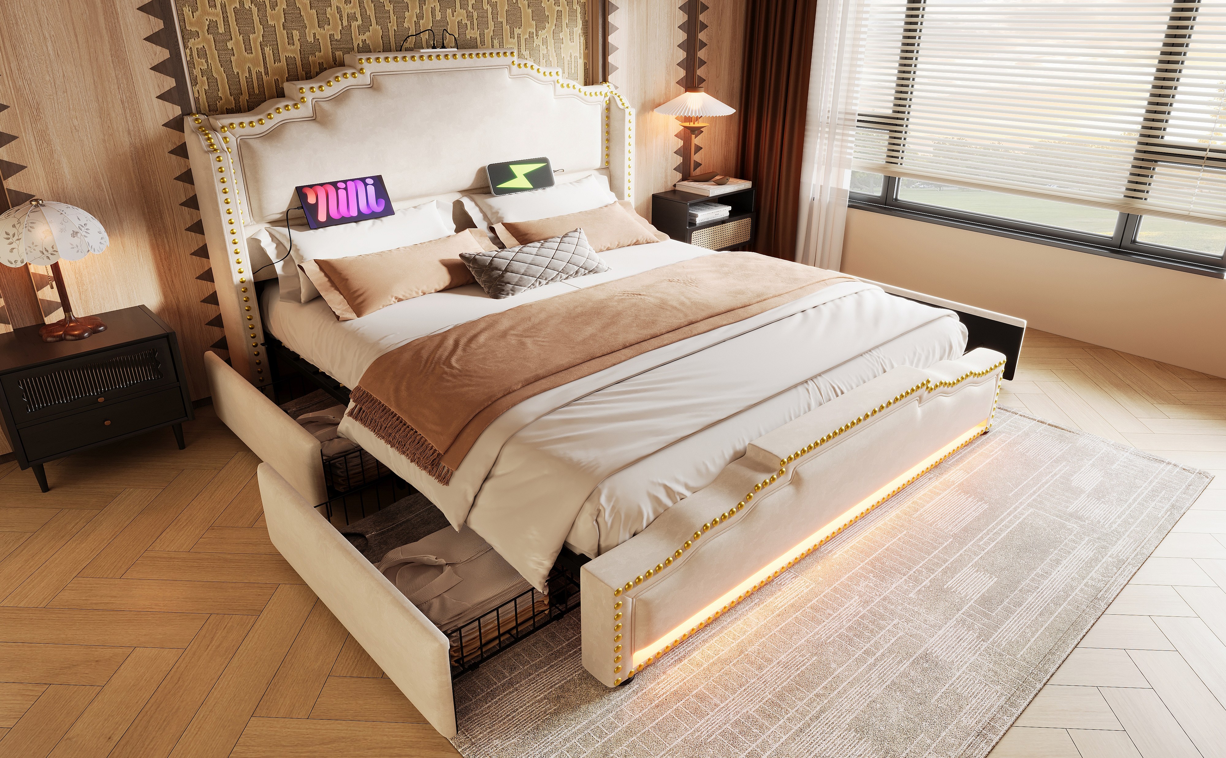 Lit en velours 140×200 cm, lit double avec 4 tiroirs, éclairage LED et ports USB-C, lit de rangement et lit d'adolescent
