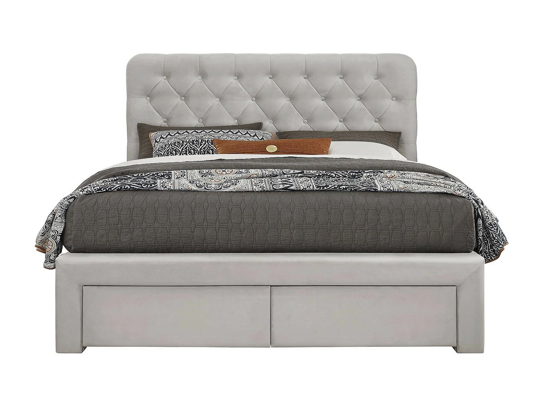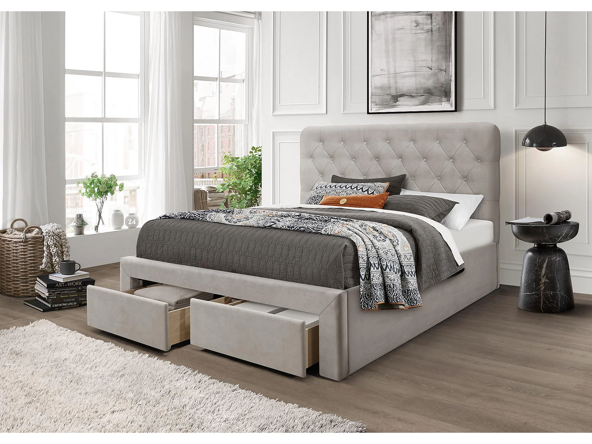 Lit en velours beige 160 x 200 avec tête de lit capitonnée et tiroirs Freesia