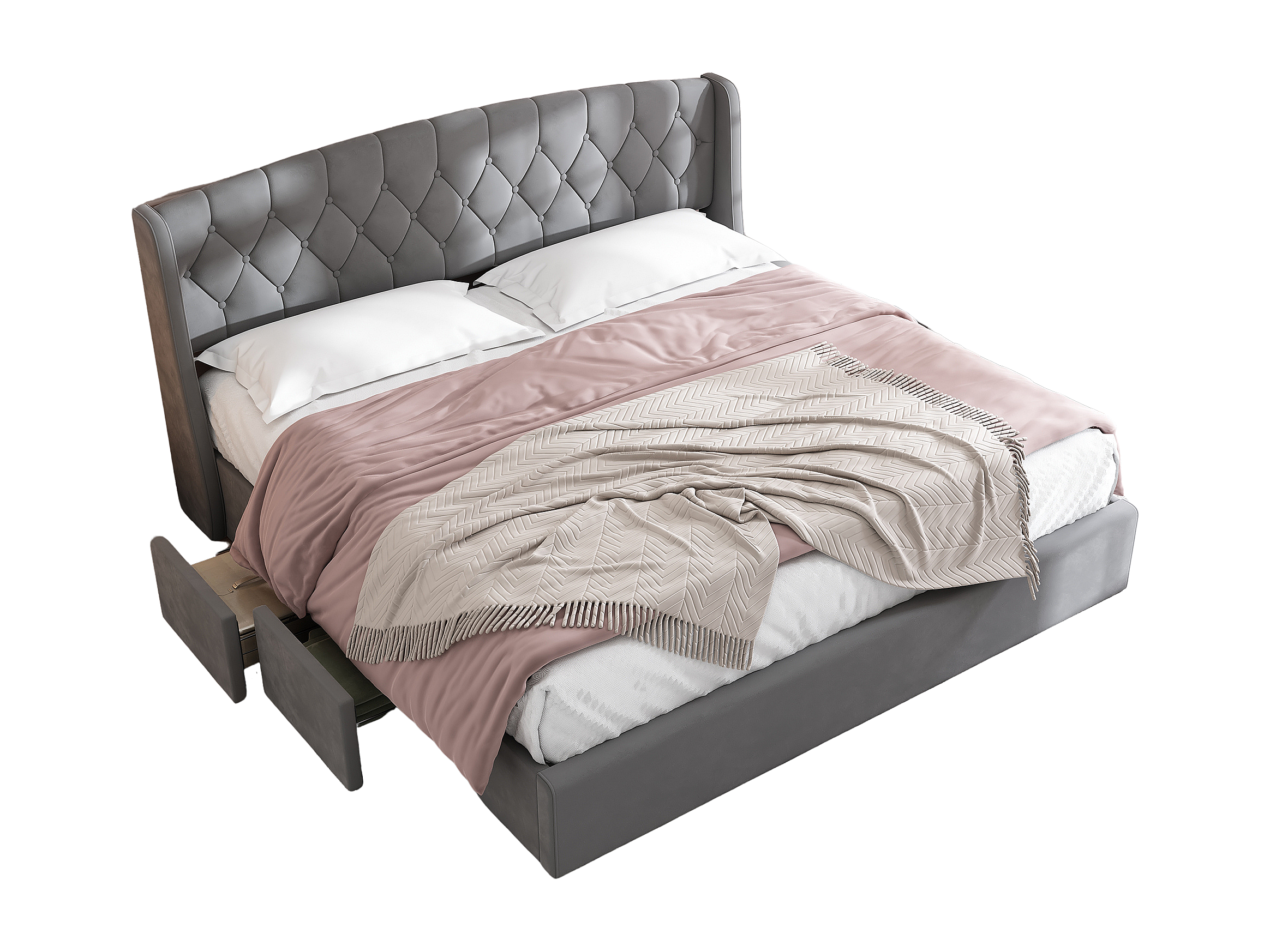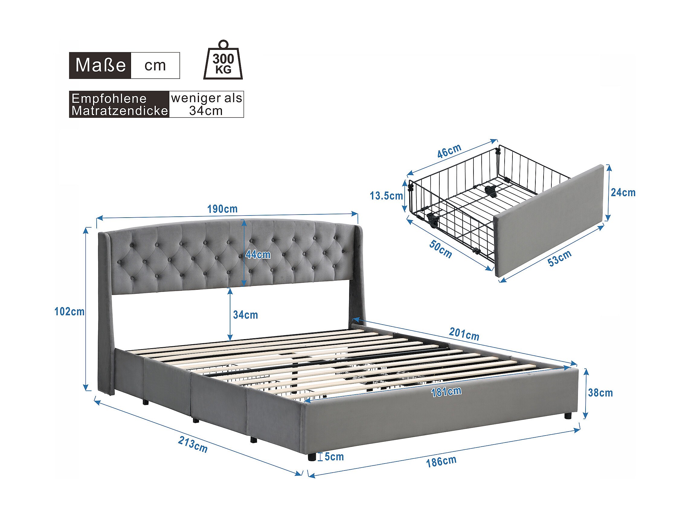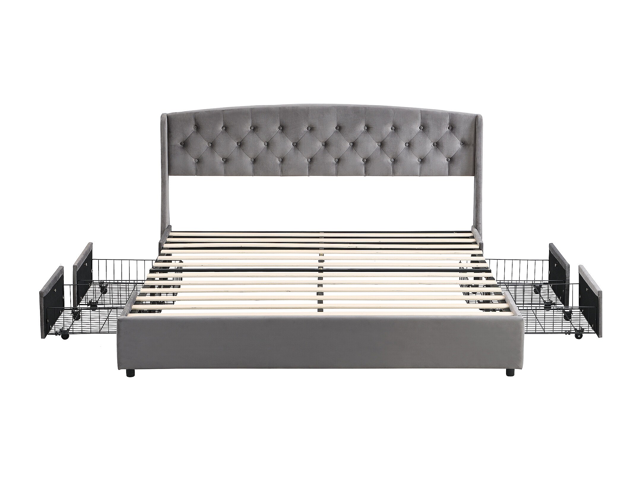 Lit en velours gris 180 x 200 cm avec 4 tiroirs en treillis, tête de lit confortable et design rétro élégant