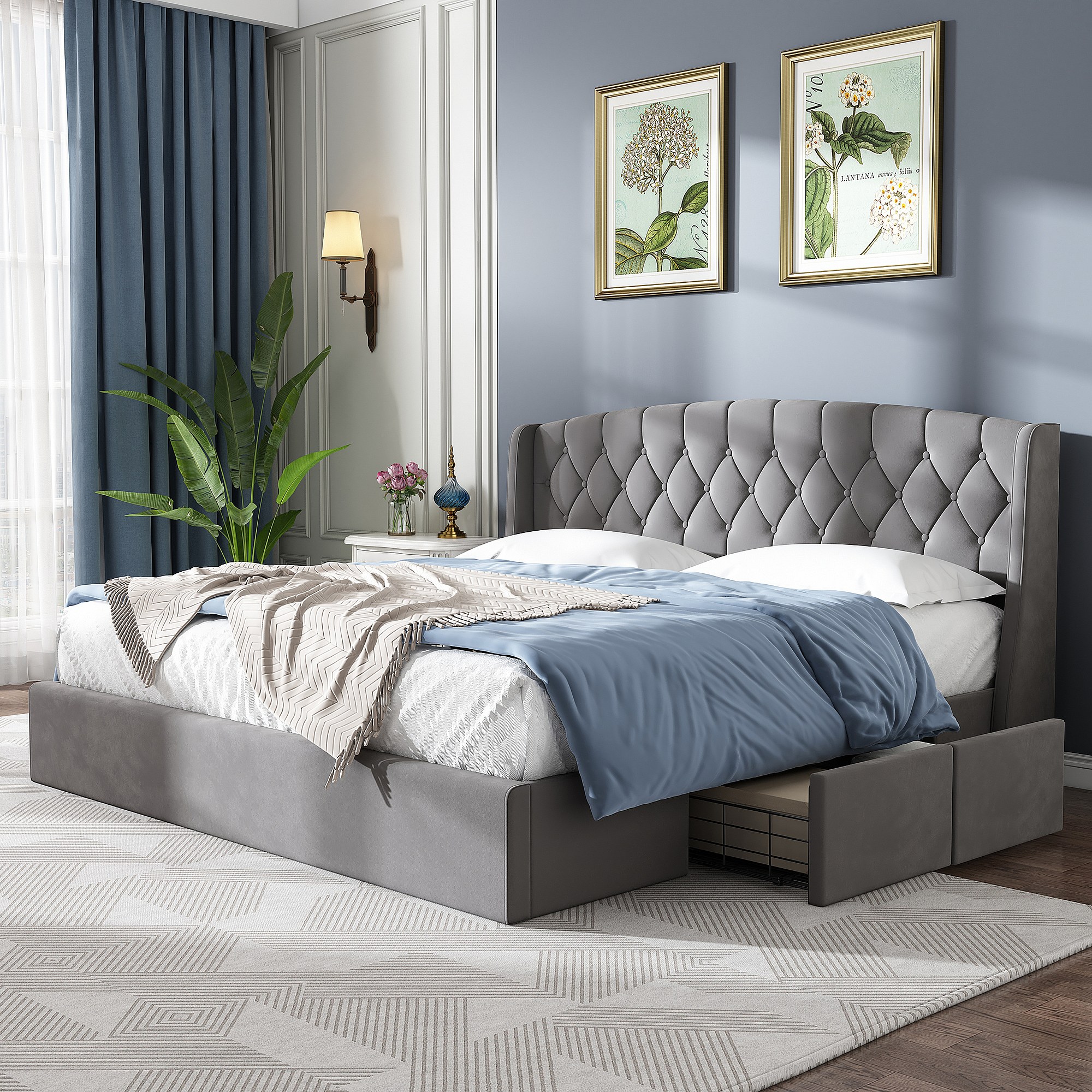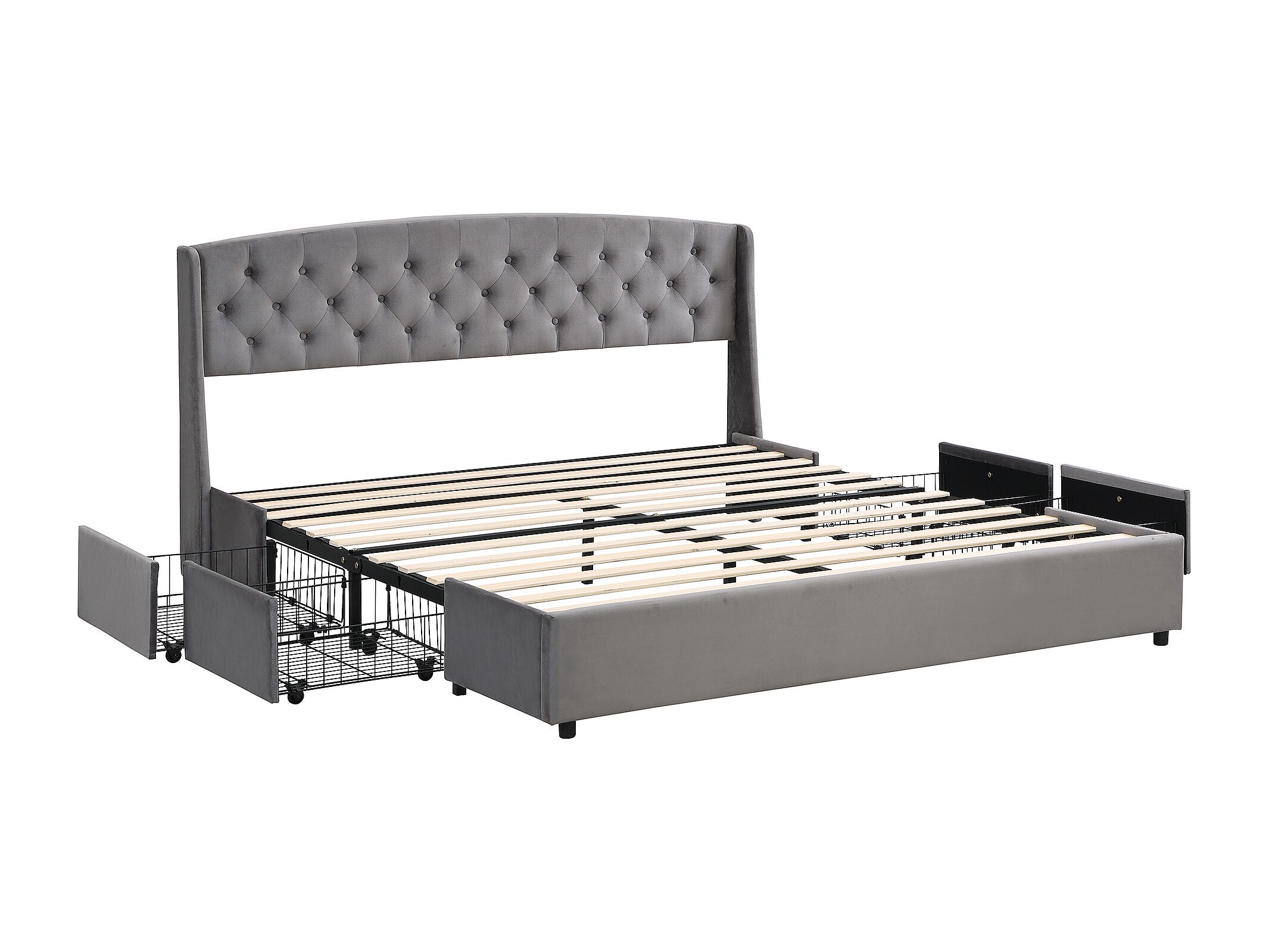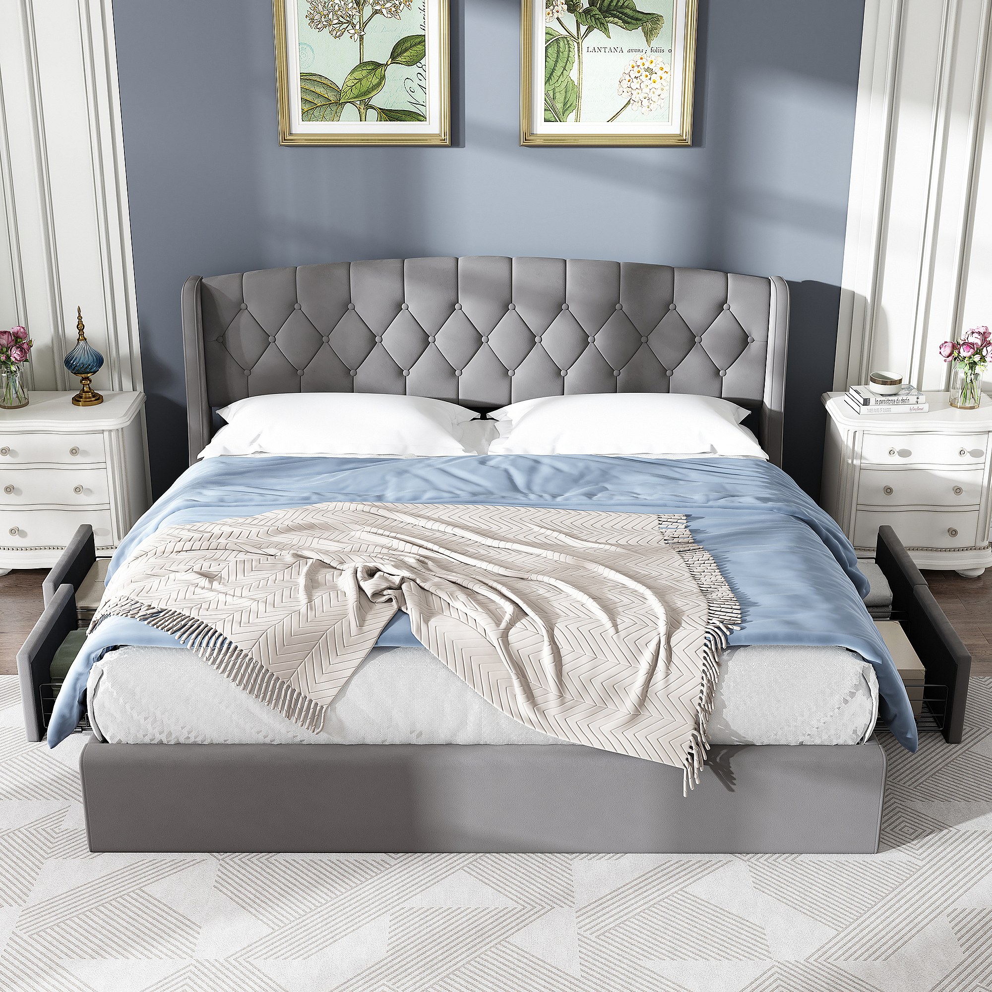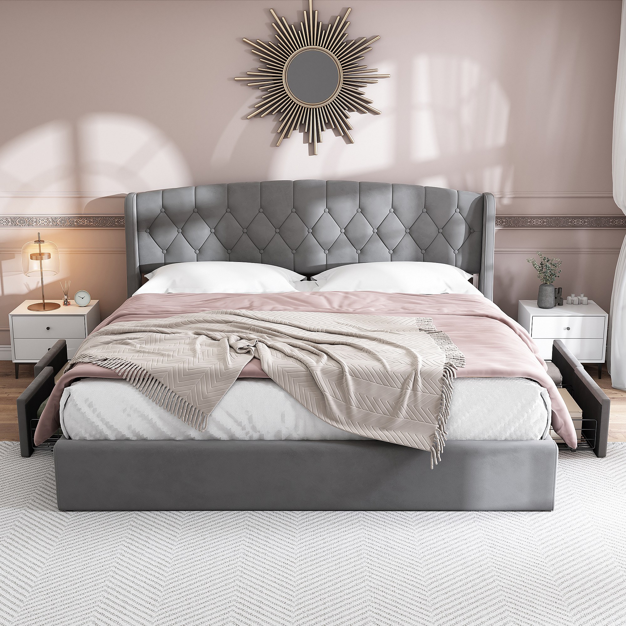 Lit en velours gris 180 x 200 cm avec 4 tiroirs en treillis, tête de lit confortable et design rétro élégant