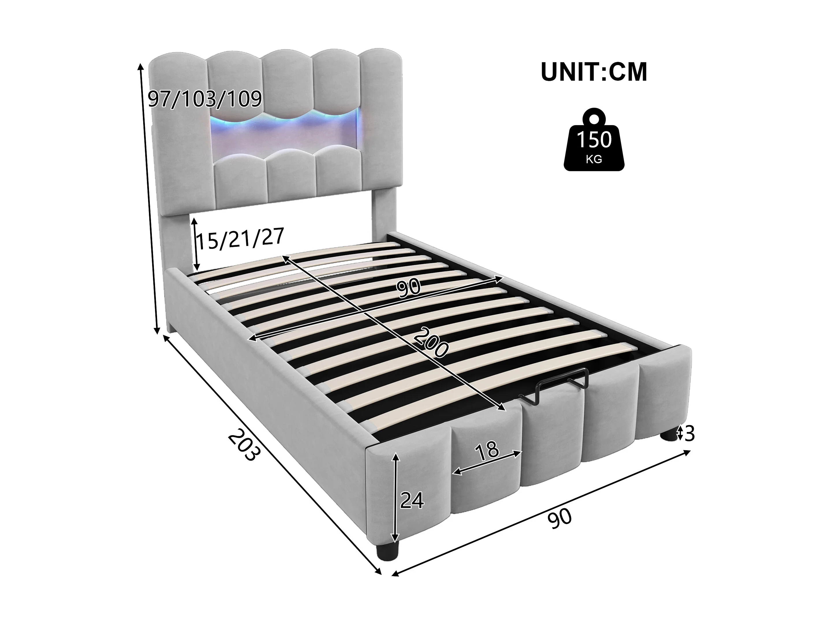 Lit en Velours Rembourré 90 x 200 cm, sans Matelas, Éclairage LED, Système Hydraulique, Tête de Lit Réglable, Gris
