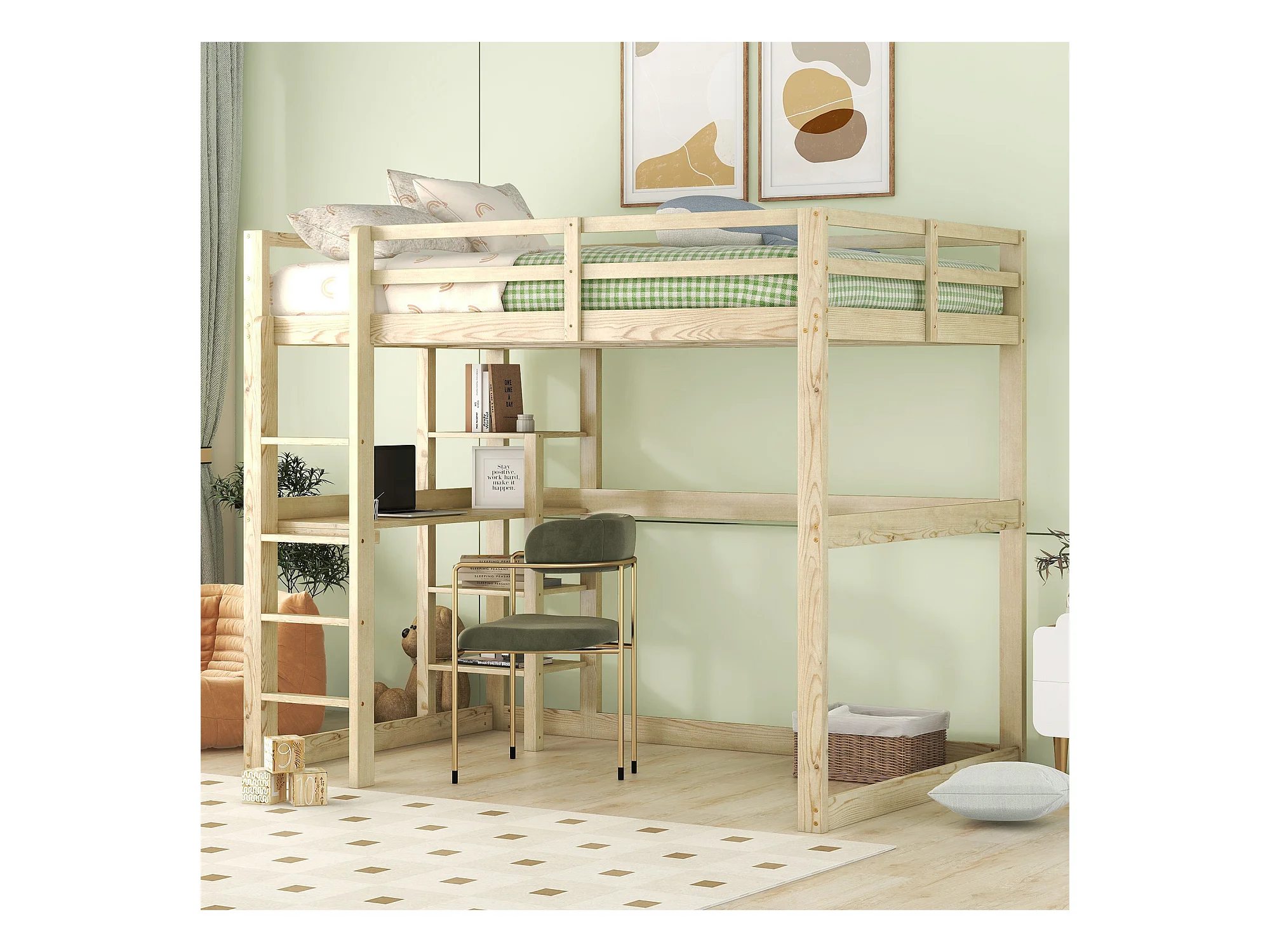 Lit Enfant 140 X 200 cm Cadre De Lit Mezzanine Avec Espace De Rangement - 4 Compartiments Et 1 Plateau De Bureau - Naturel