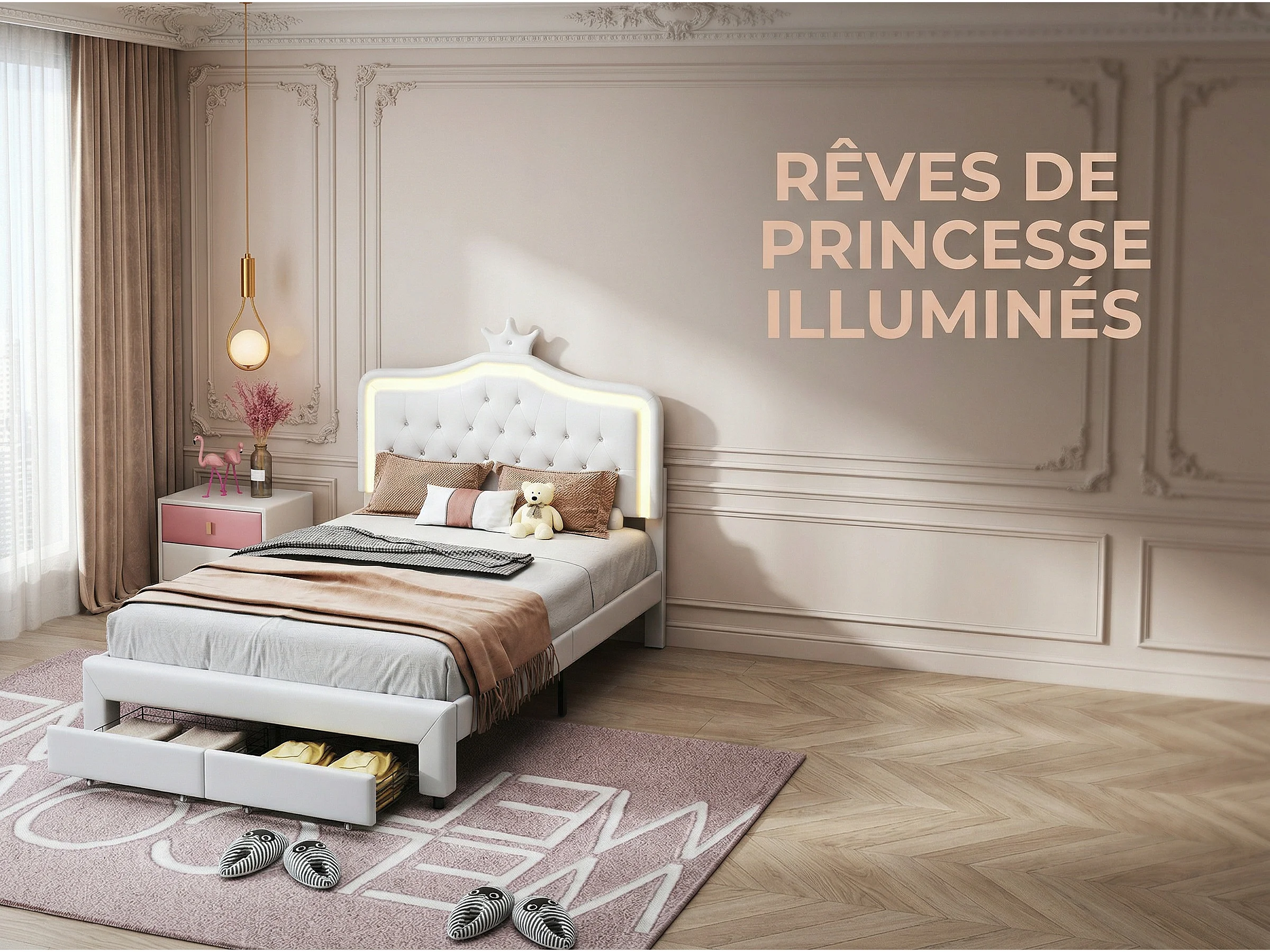 Lit enfant 140 x 200 cm, éclairage LED RGB, lit princesse blanc avec rangement