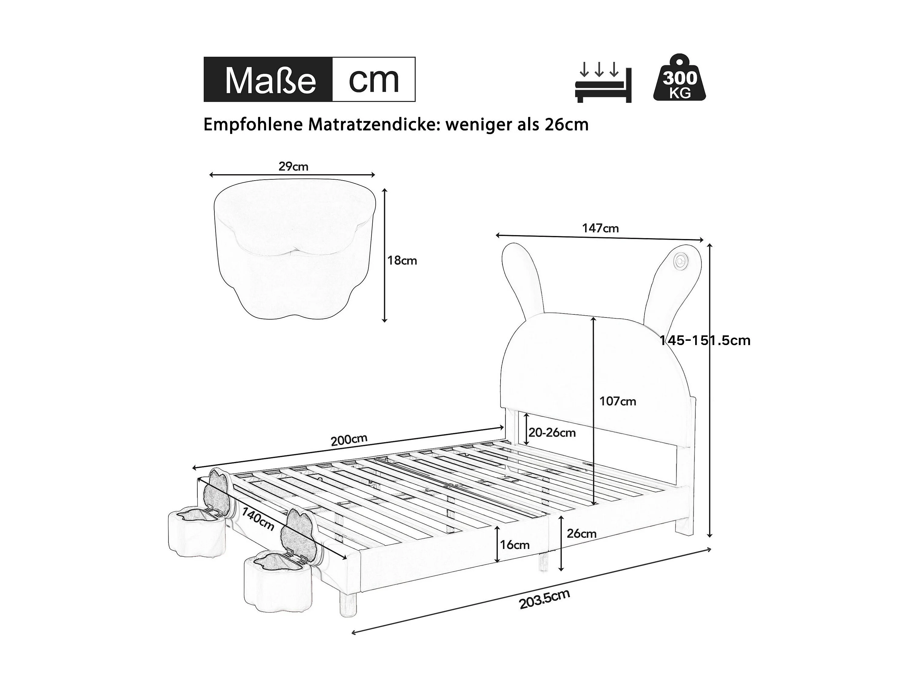 Lit enfant 140 x 200 cm, rangement, LED, tête de lit en forme d'oreilles de lapin, velours rose, sans matelas