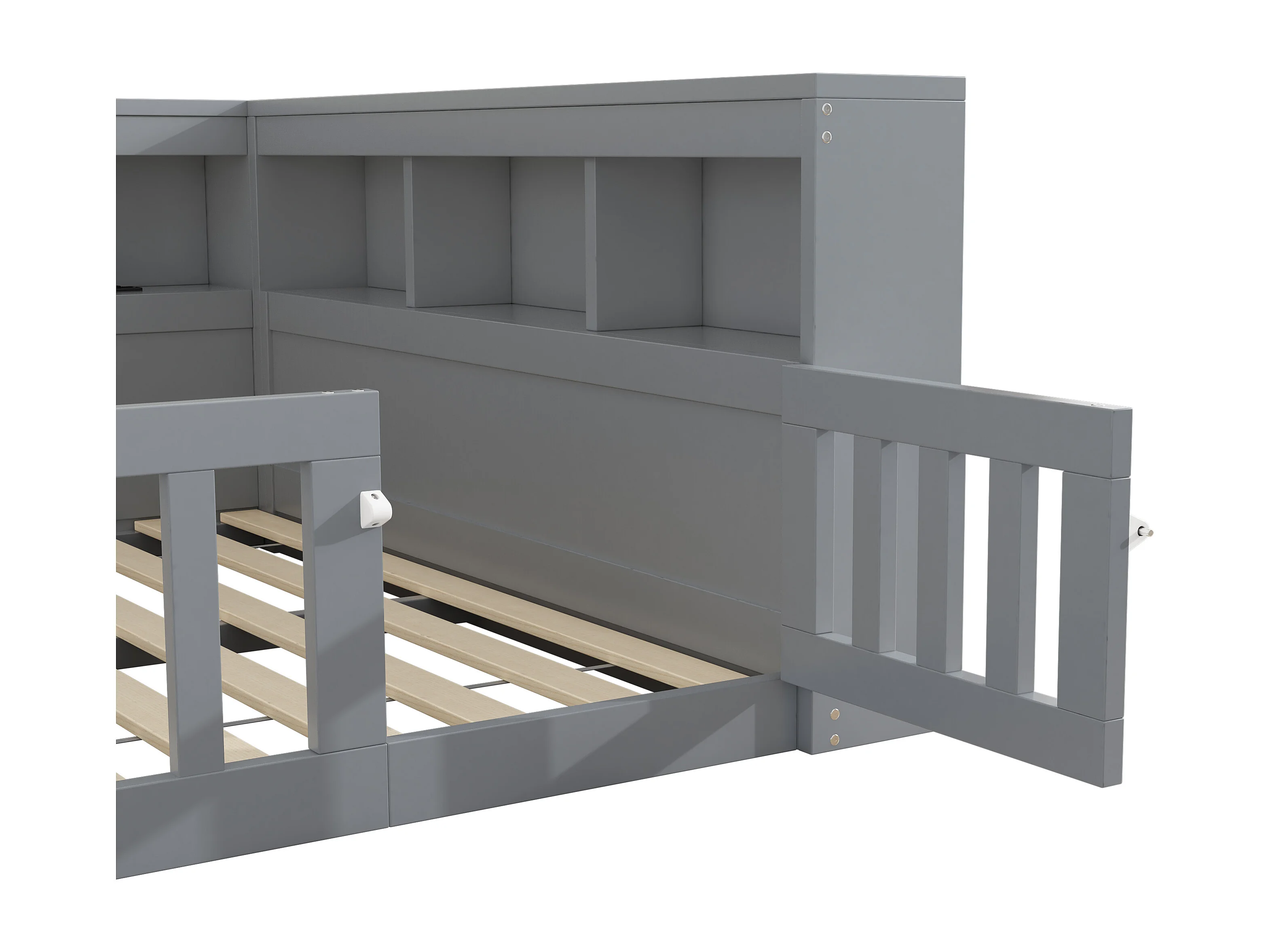 Lit enfant 140x190 cm au sol avec prise, rangements et sommier à lattes - Gris