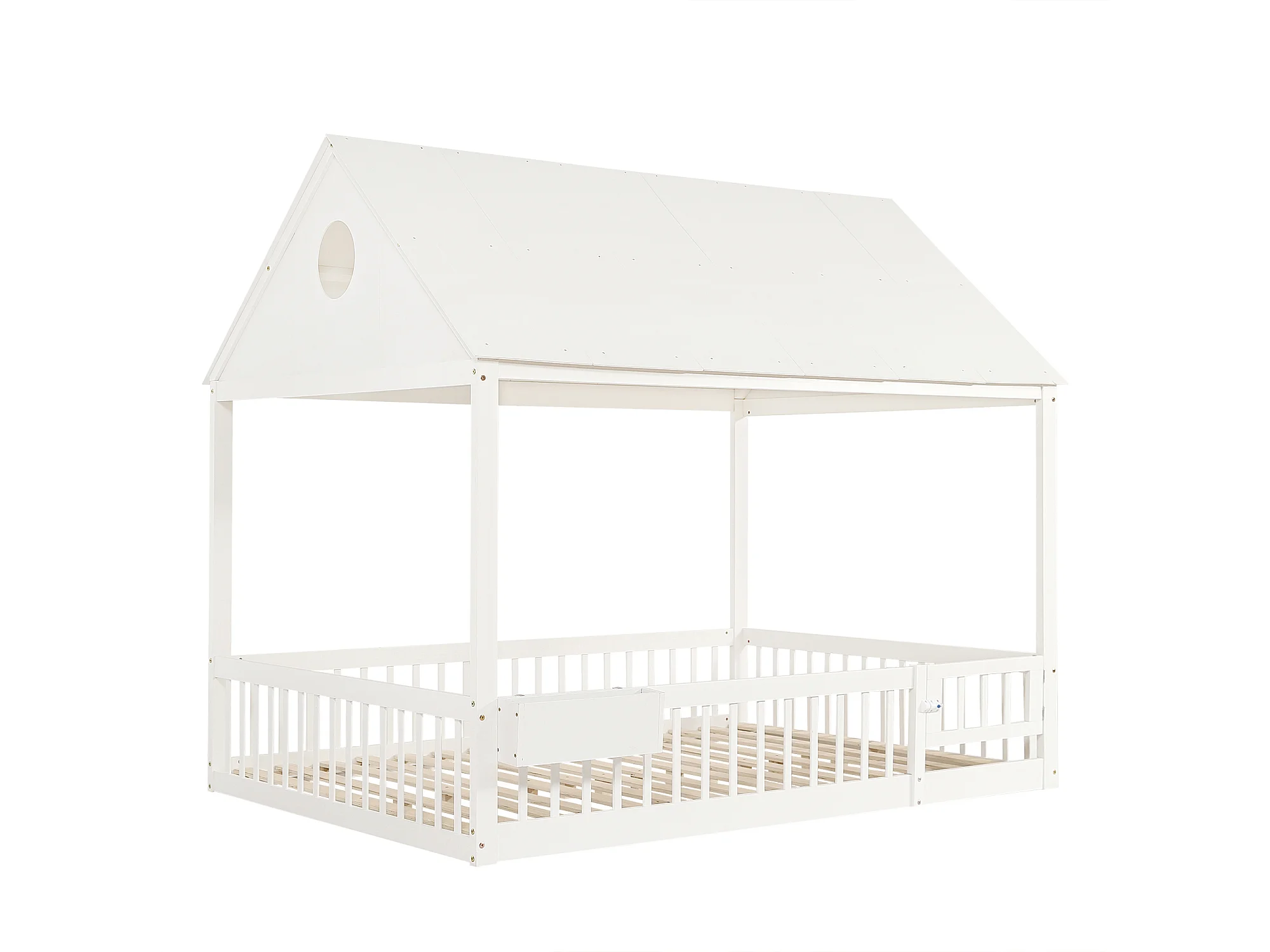 Lit enfant 140x200 cm - avec rideaux blancs décoratifs - avec 1 porte et compartiment de rangement - blanc (sans matelas)