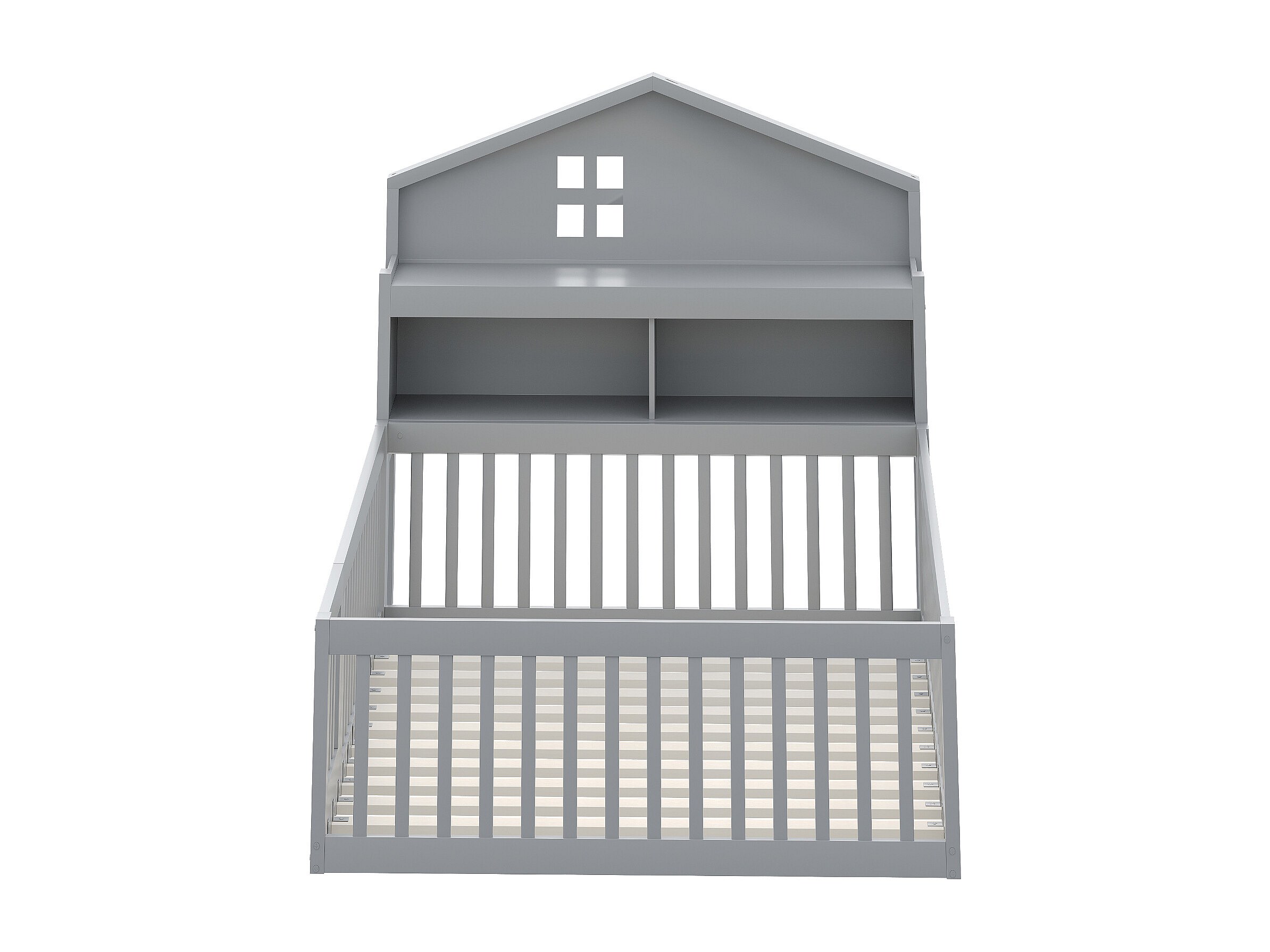 Lit enfant 140x200 cm, cadre en bois massif, lit-maison avec étagères, rangement, barrières de sécurité, porte, étagère à livres, sommier à lattes, gris