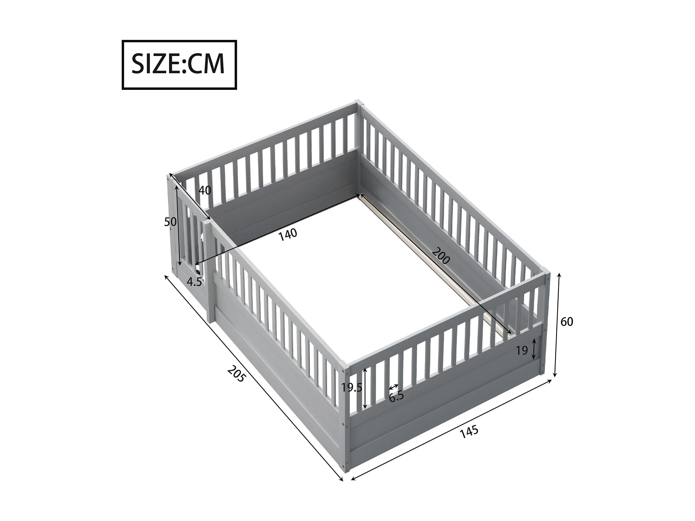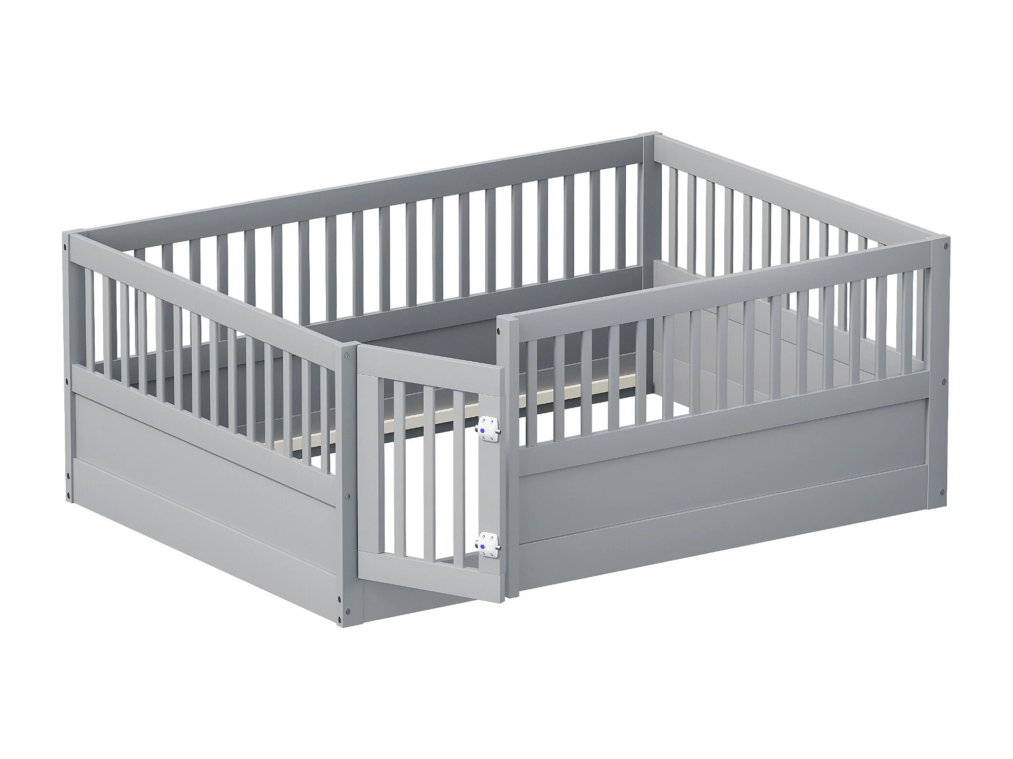 Lit enfant 140x200 cm en bois avec barrière et porte, simple et pratique, gris