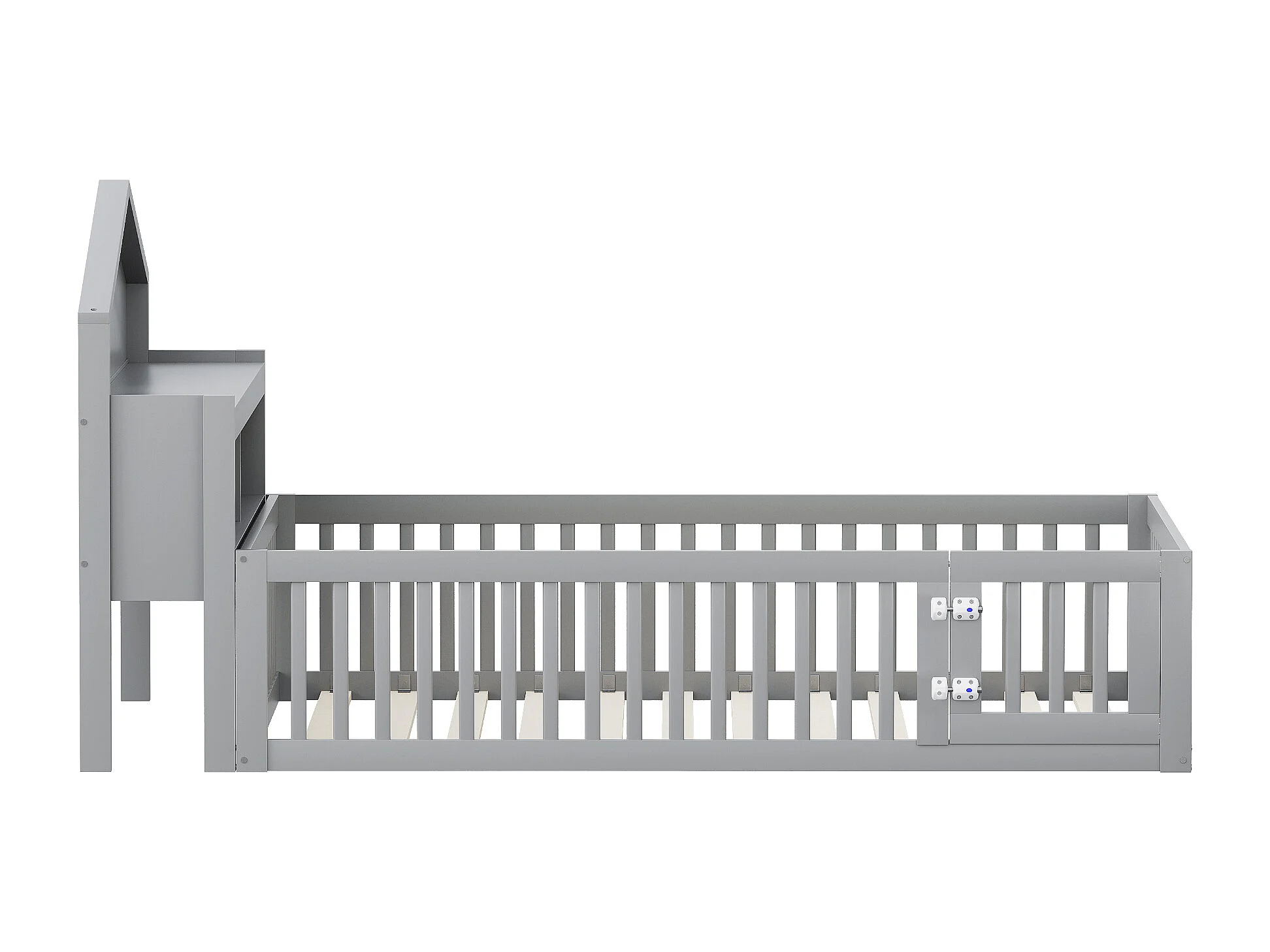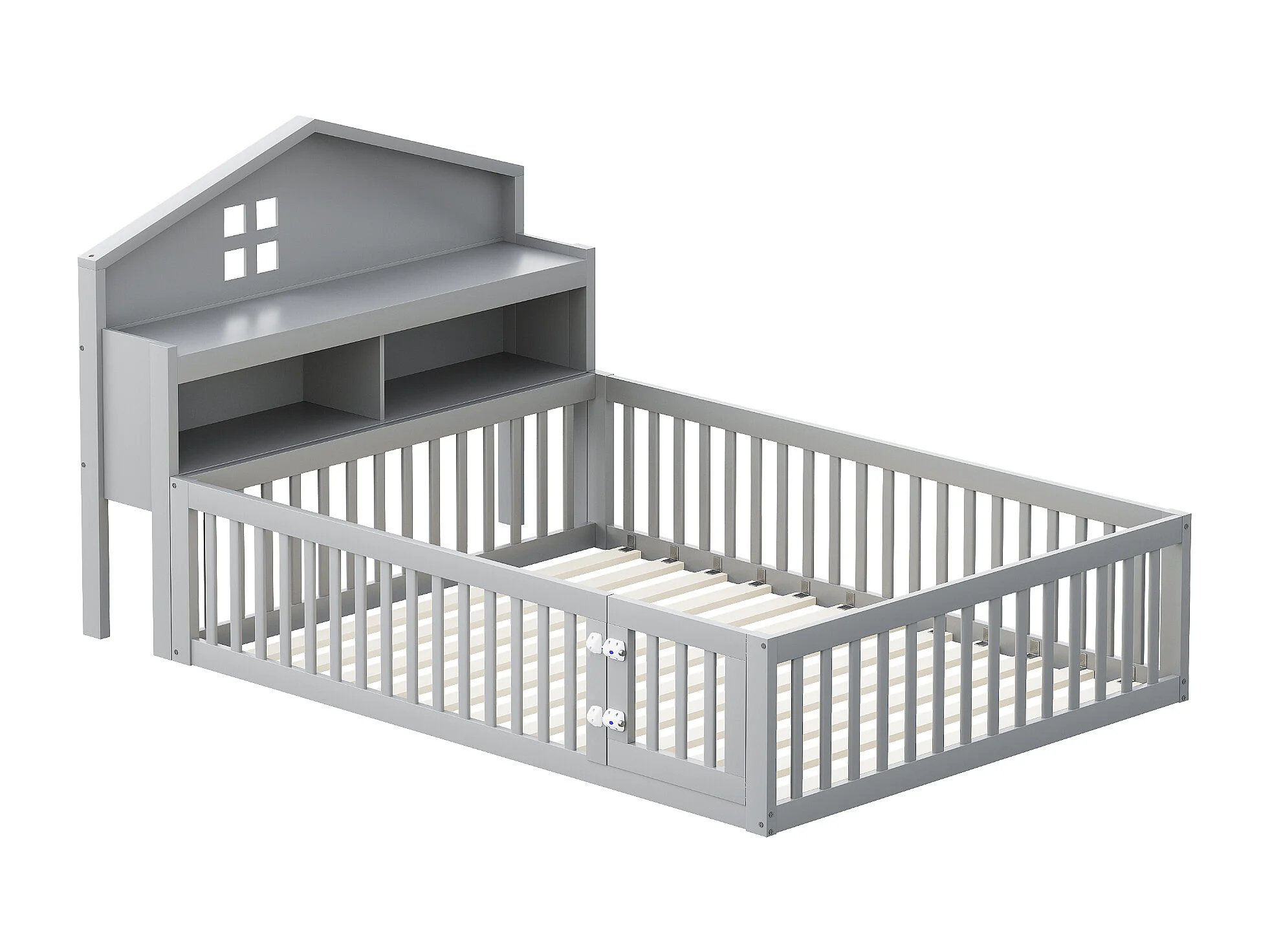 Lit enfant 140x200 cm en bois massif, structure maison avec étagères, barrière et porte, avec images, gris
