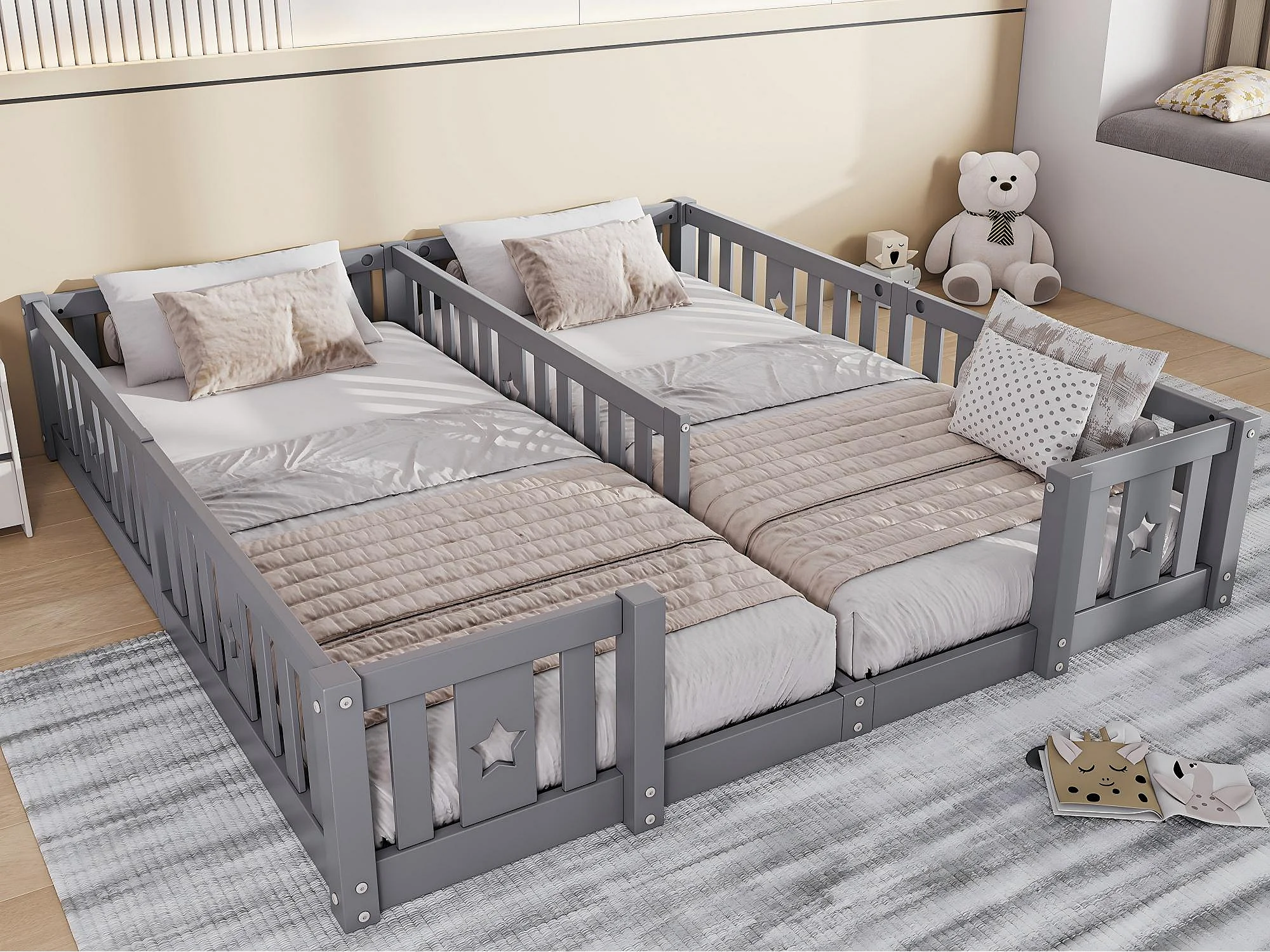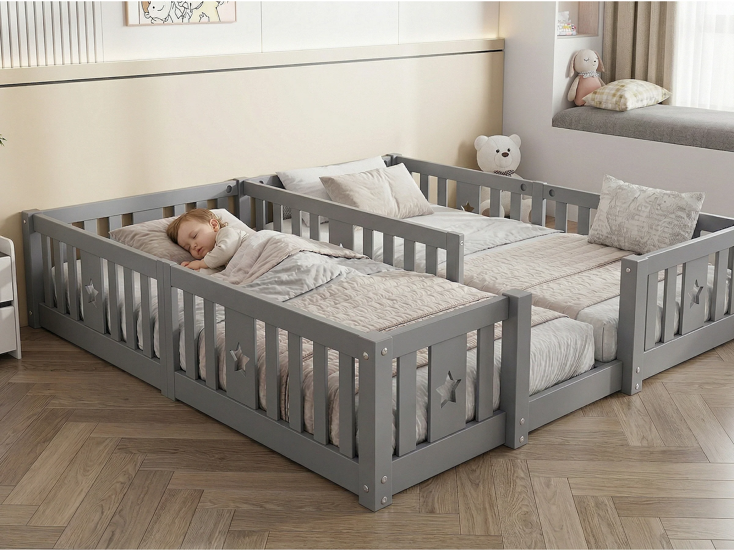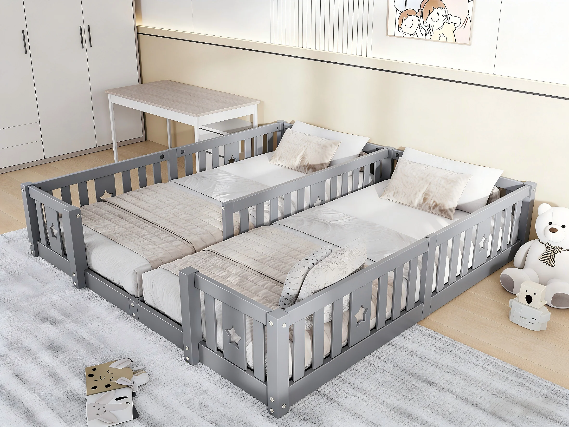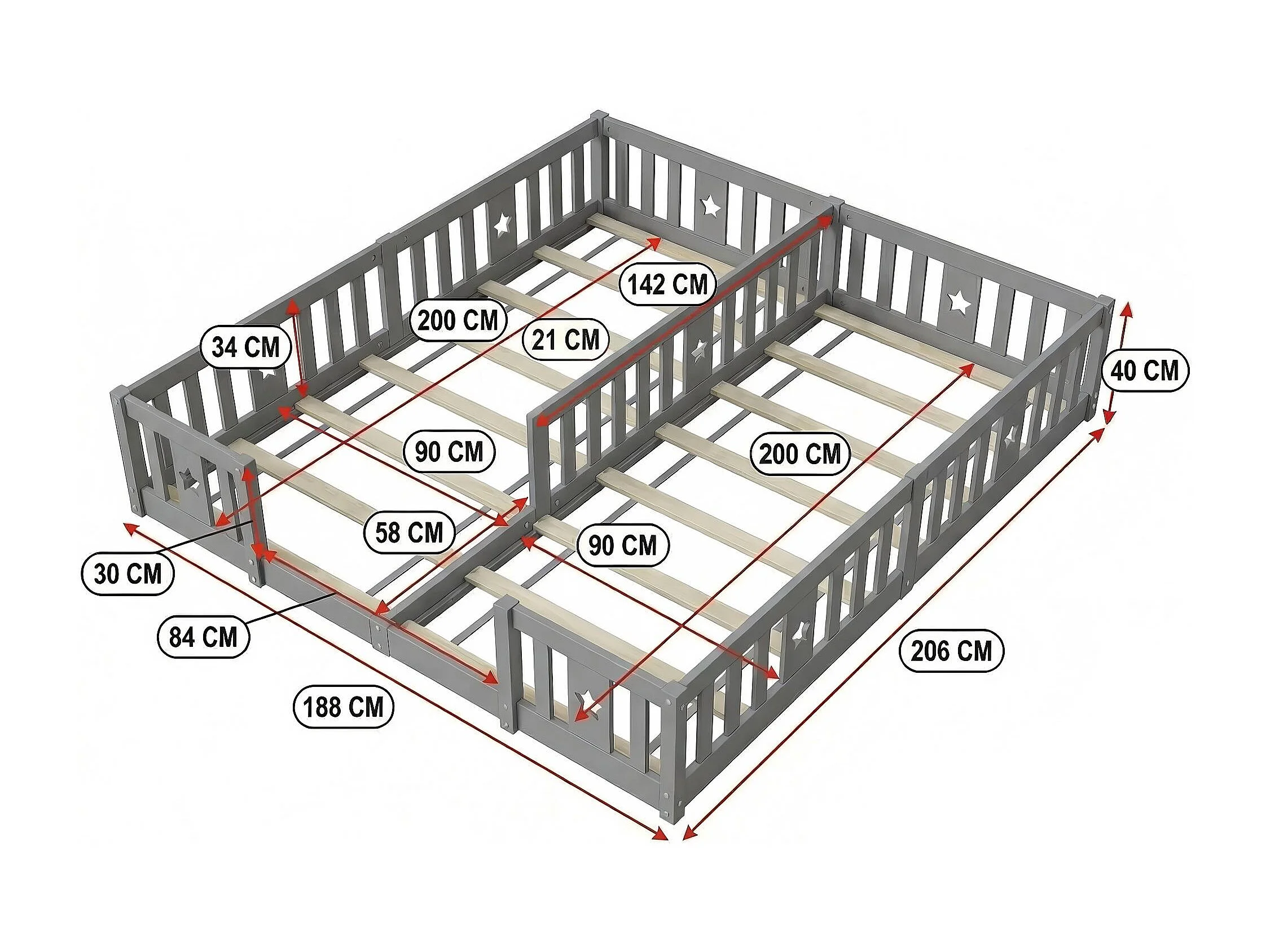 Lit enfant 180x200 cm en bois massif, lit au sol avec barrières, structure à barreaux avec motif étoile