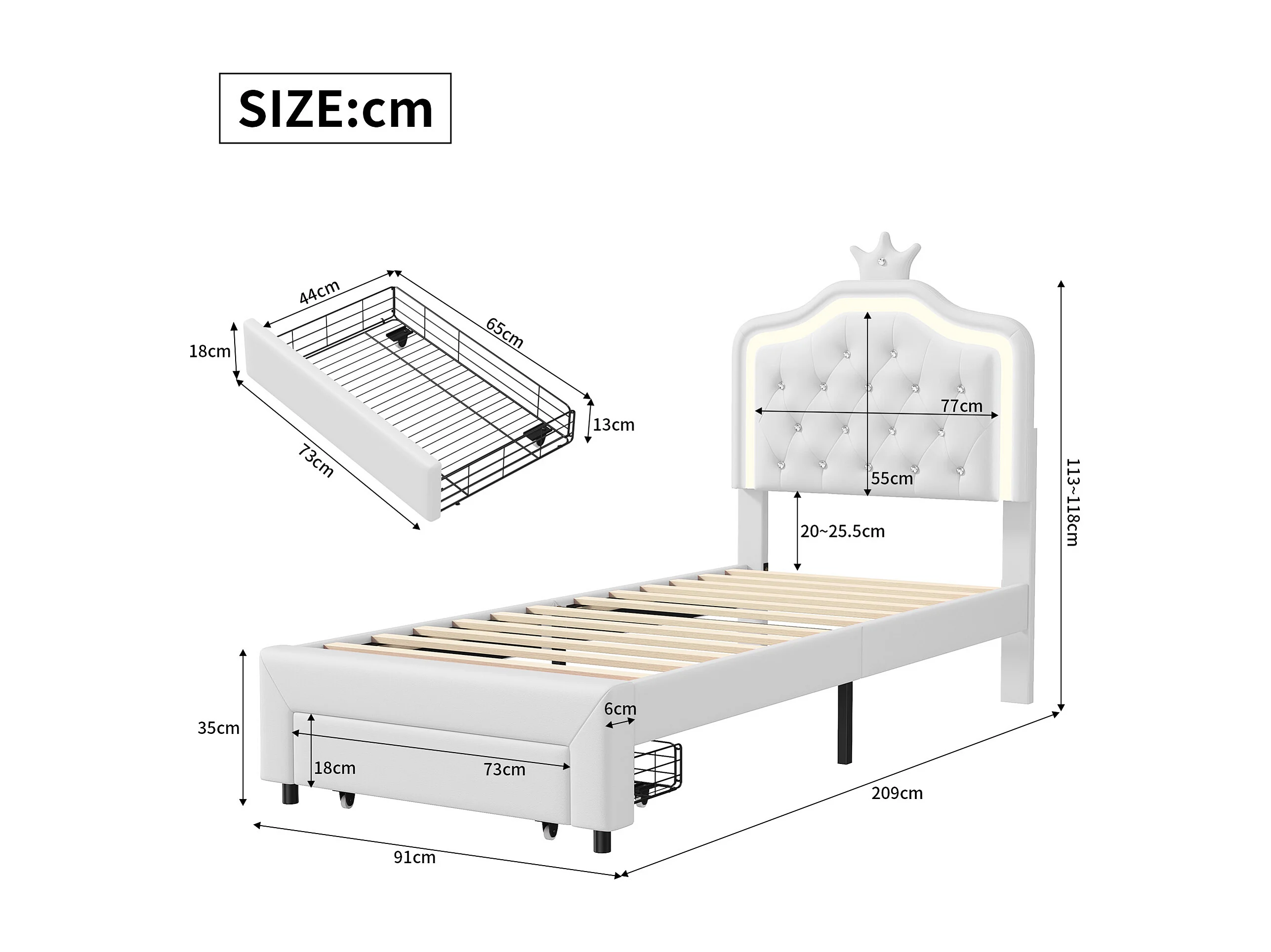 Lit enfant 90×200 cm avec sommier à lattes, tiroirs et LED – Princesse avec couronne, blanc
