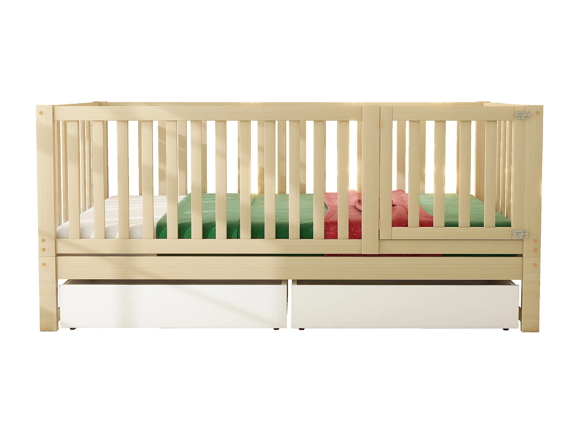Lit enfant 90 x 200 cm avec 2 tiroirs et une porte - bois massif - sommier à lattes - blanc et naturel (sans matelas)