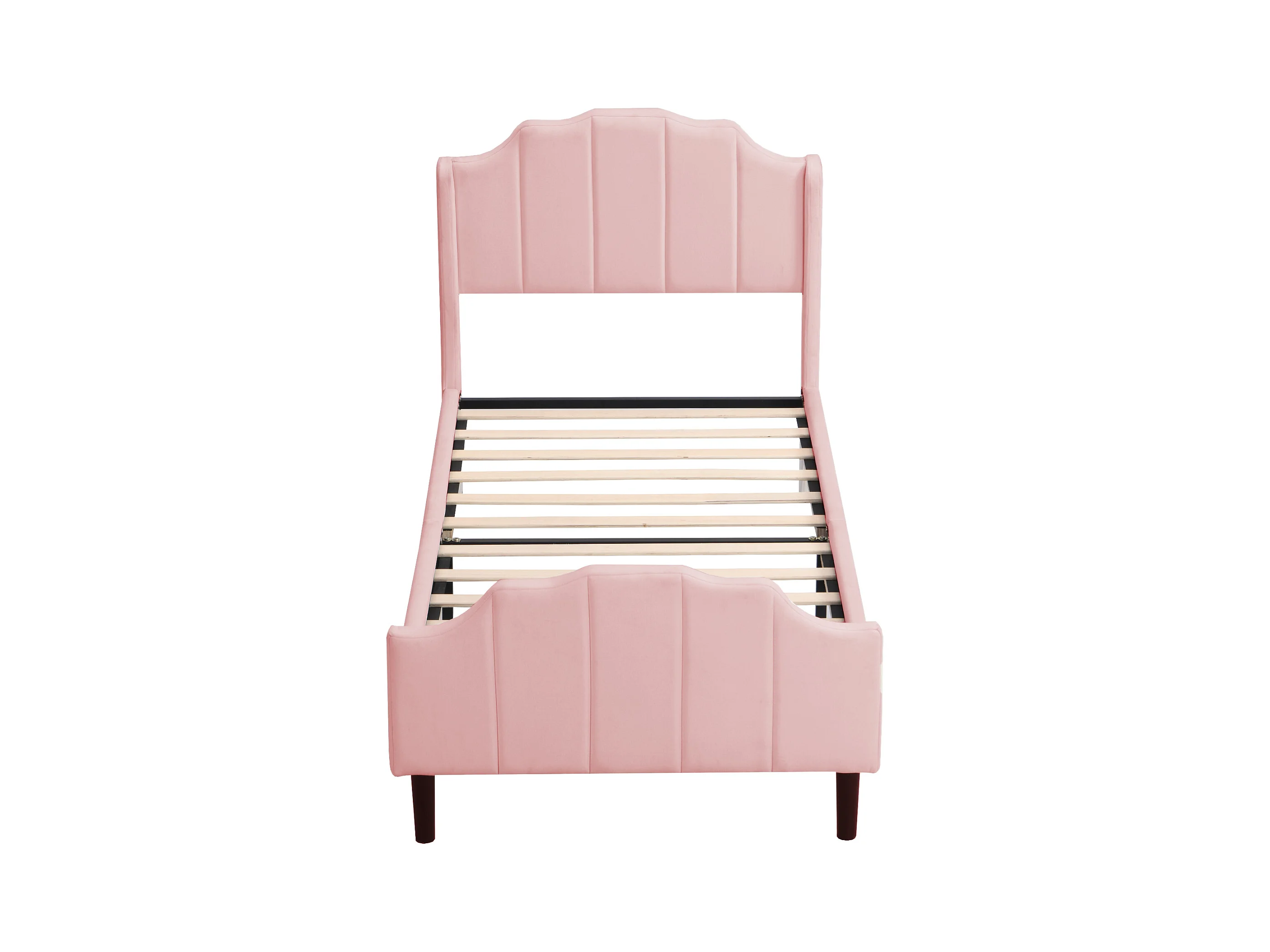Lit enfant 90 x 200 cm avec tête et pied en velours rose, cadre robuste et lattes de soutien