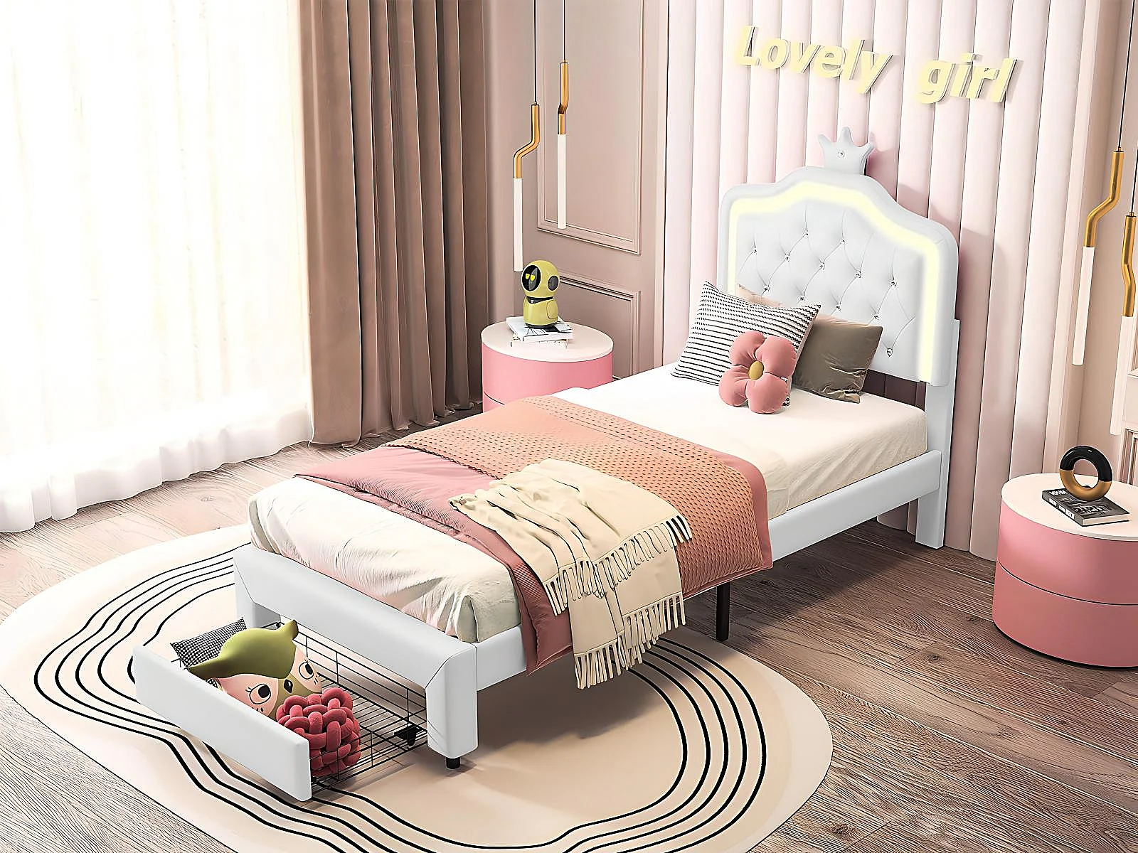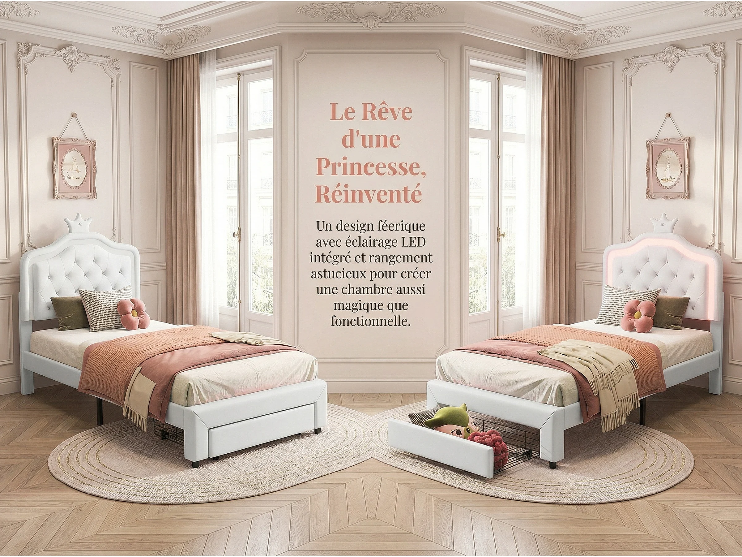 Lit enfant 90 x 200 cm, éclairage LED RGB, lit princesse blanc avec rangement