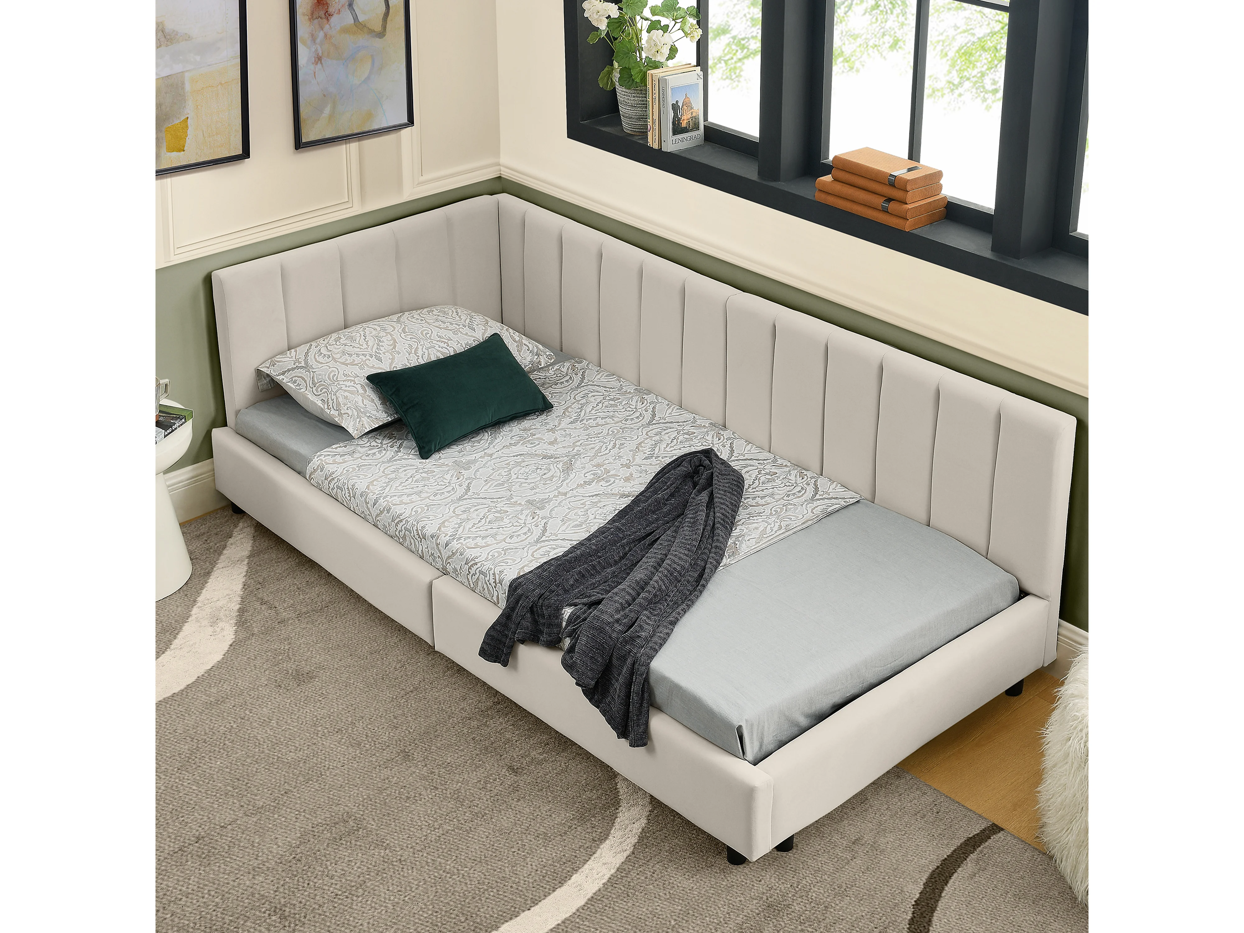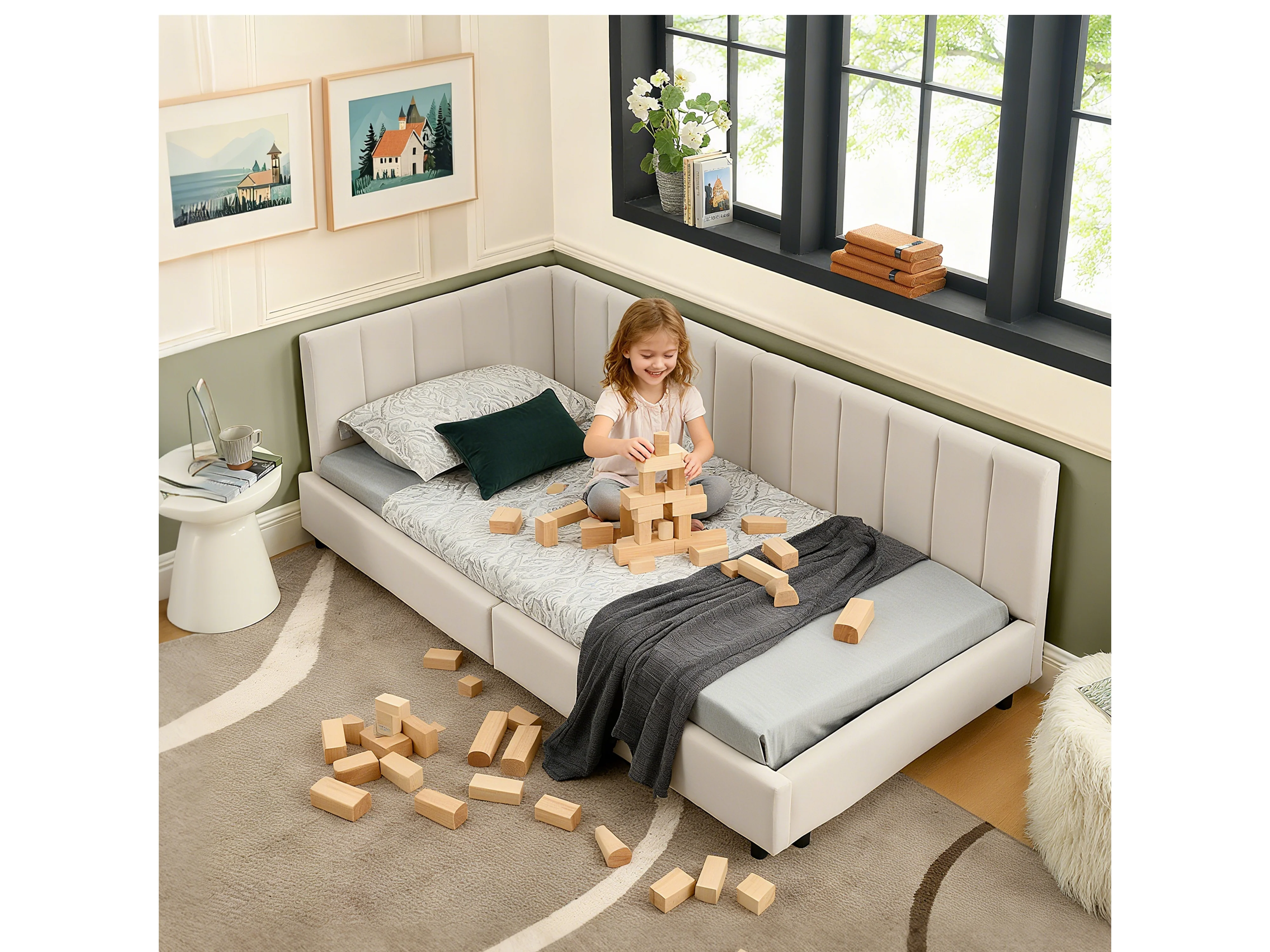 Lit enfant 90 x 200 cm - Lit simple à rayures verticales - velours beige - matelas non inclus