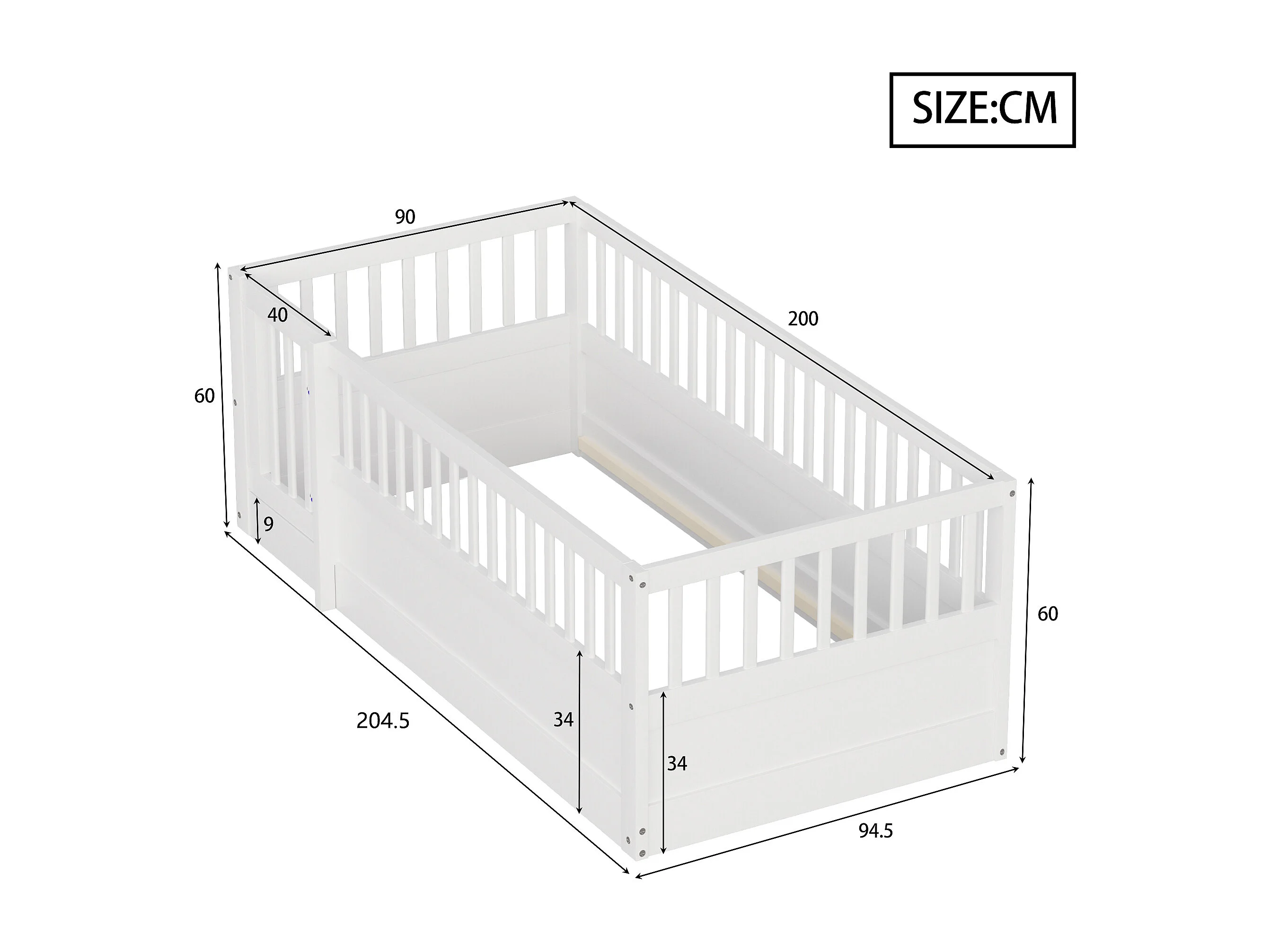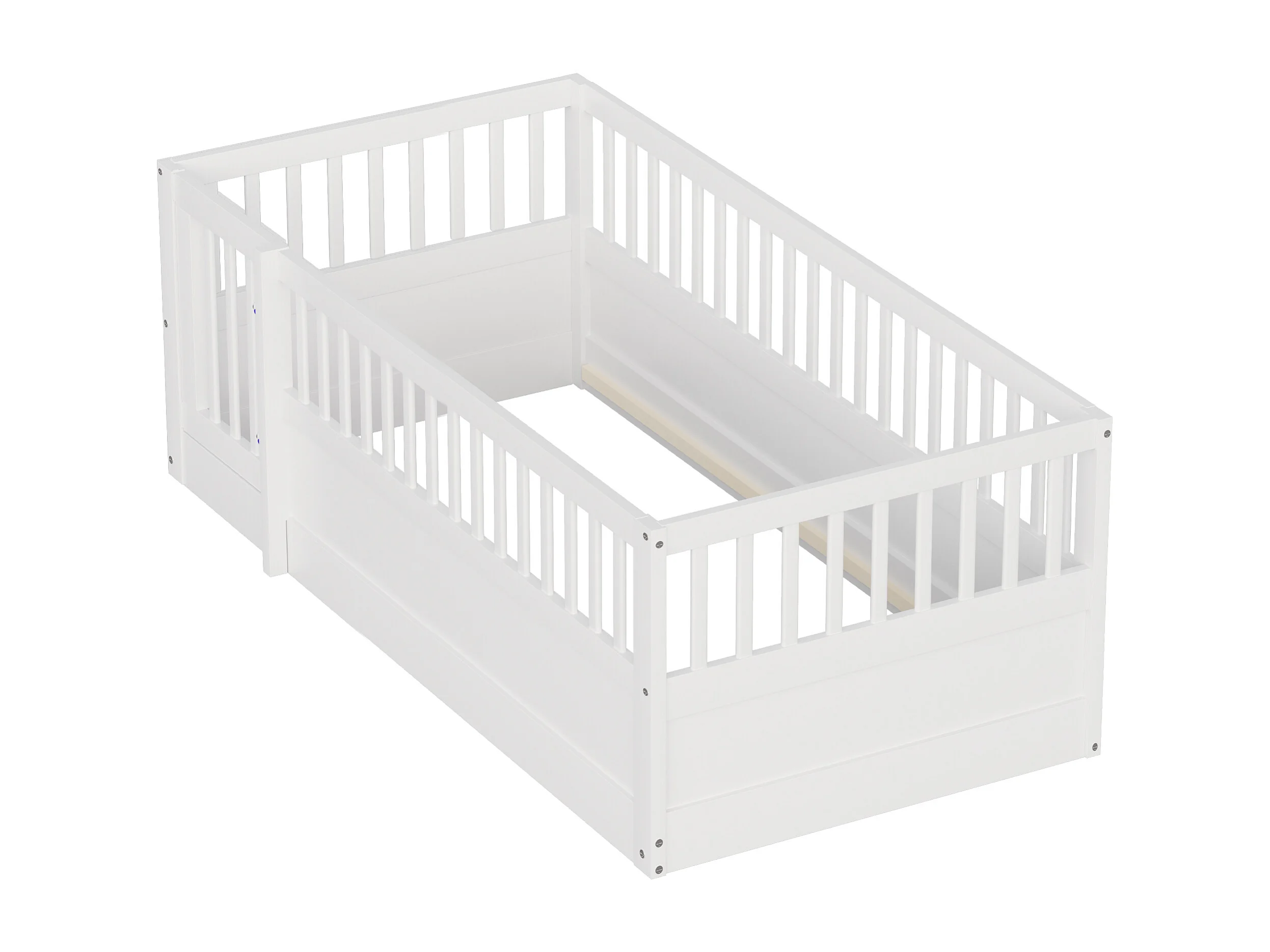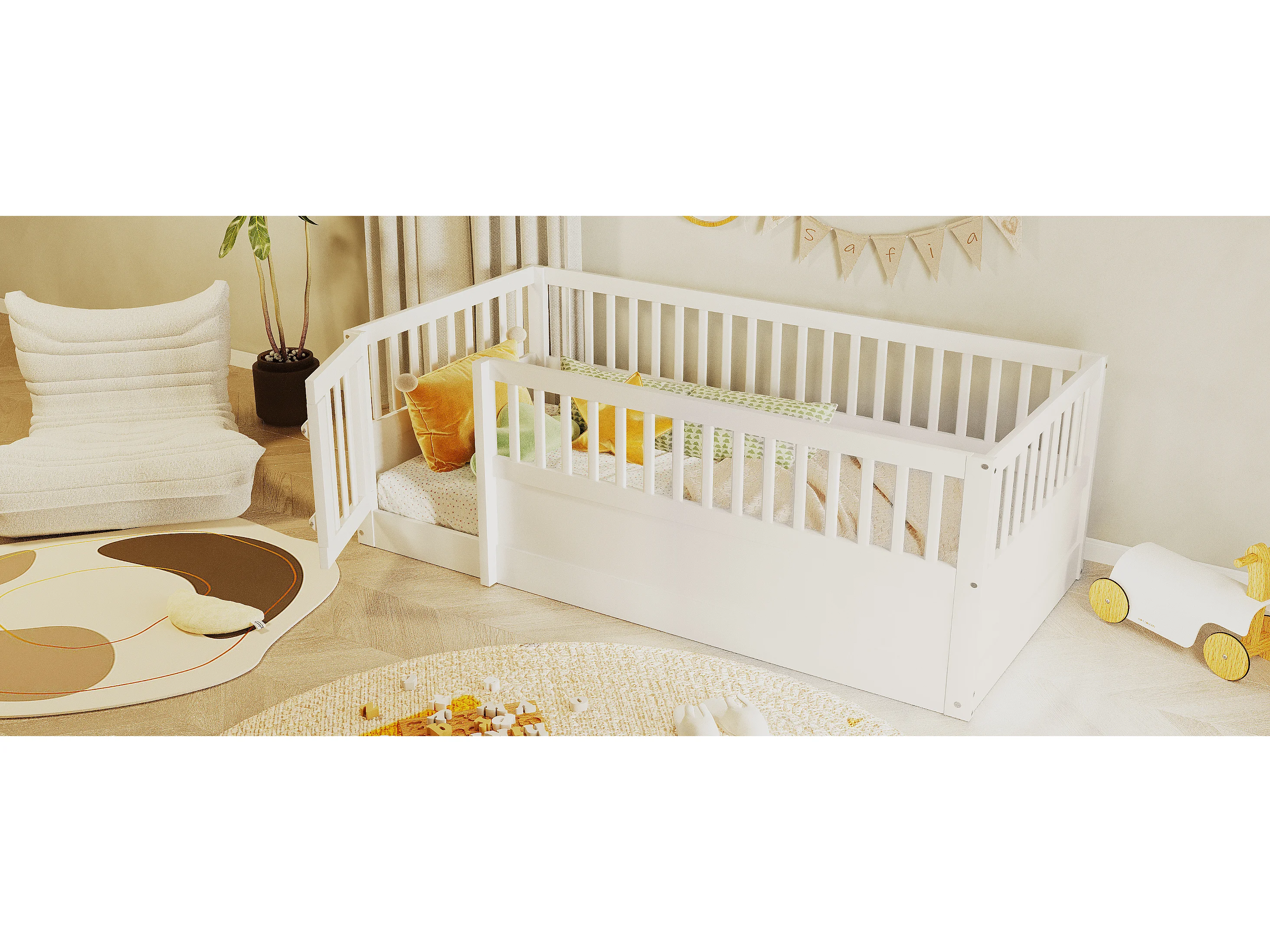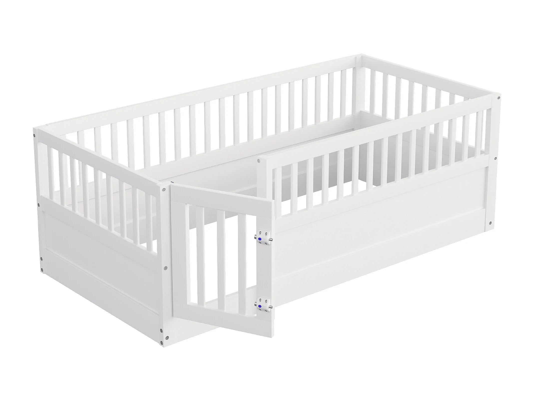 Lit enfant - 90 x 200 cm - sans sommier à latte - avec barreaux et porte - pin + contreplaqué + MDF - blanc