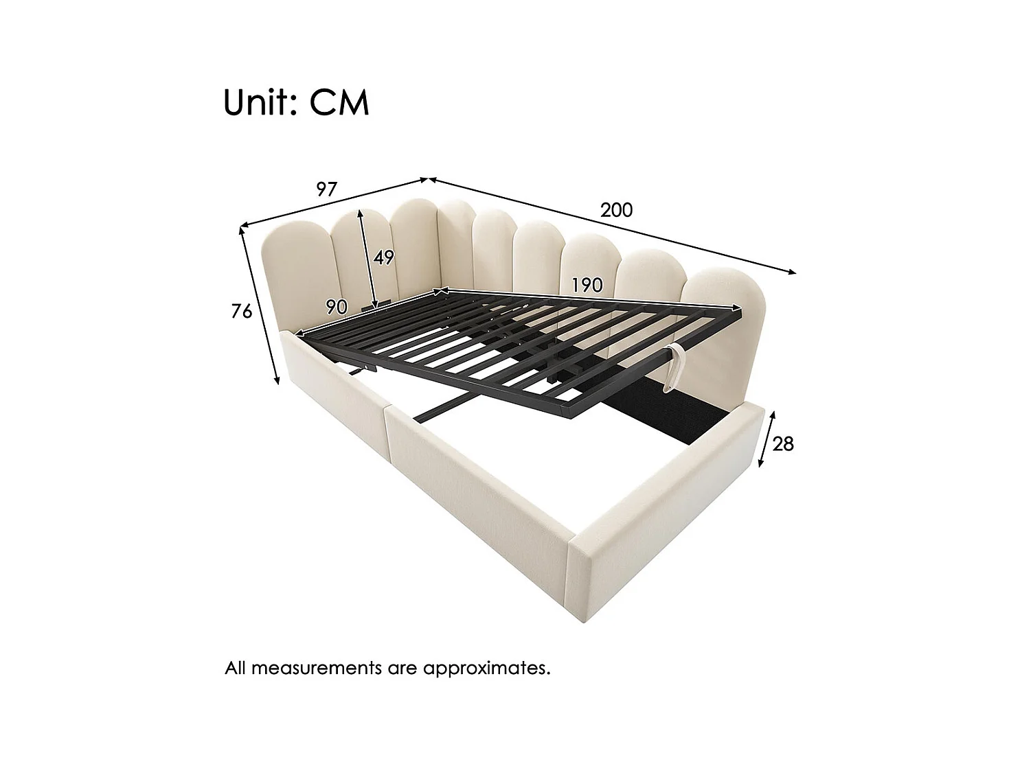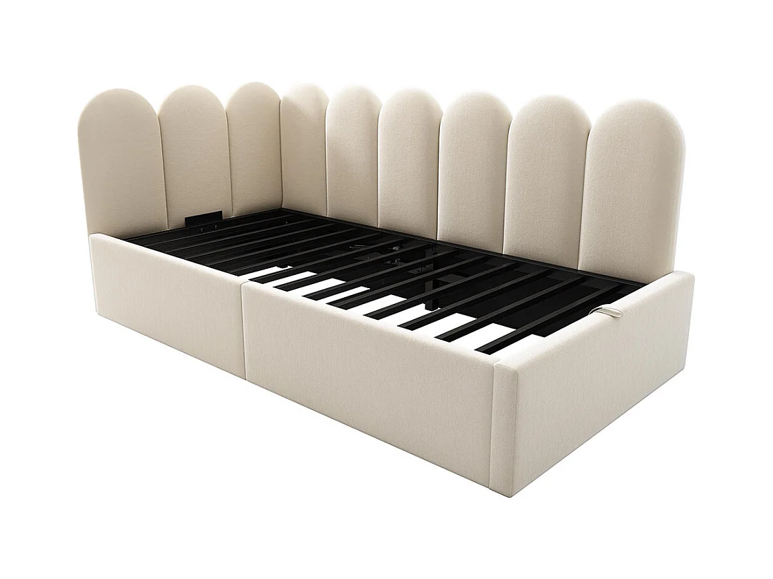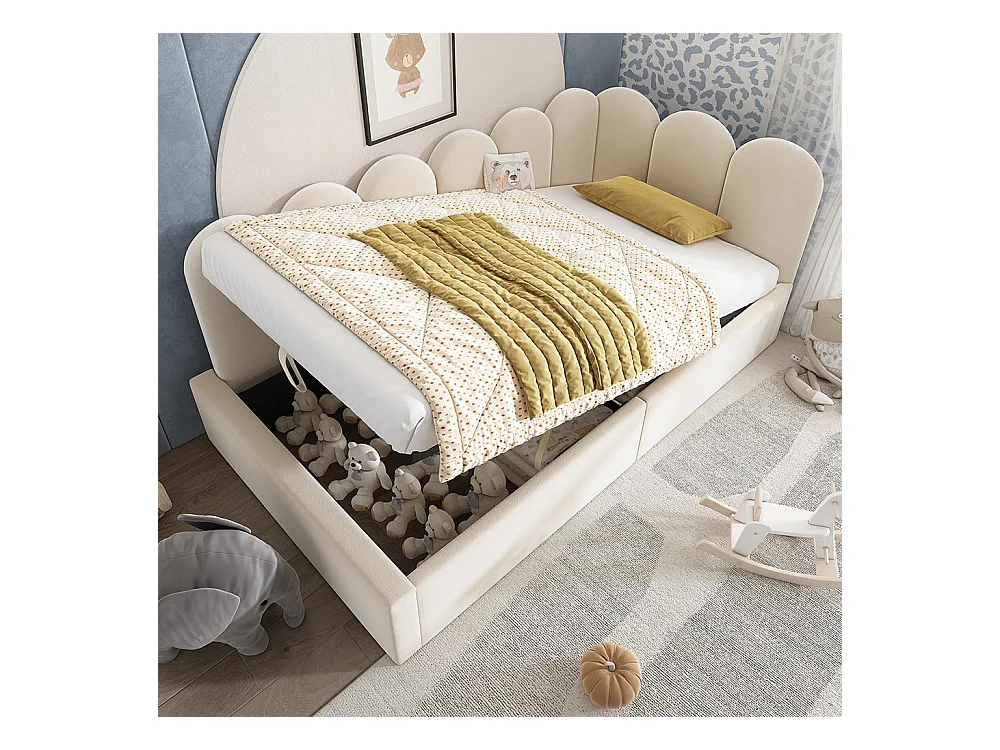 Lit enfant 90x190 cm, canapé - lit rembourré avec rangement hydraulique, cadre à lattes métalliques, velours, beige