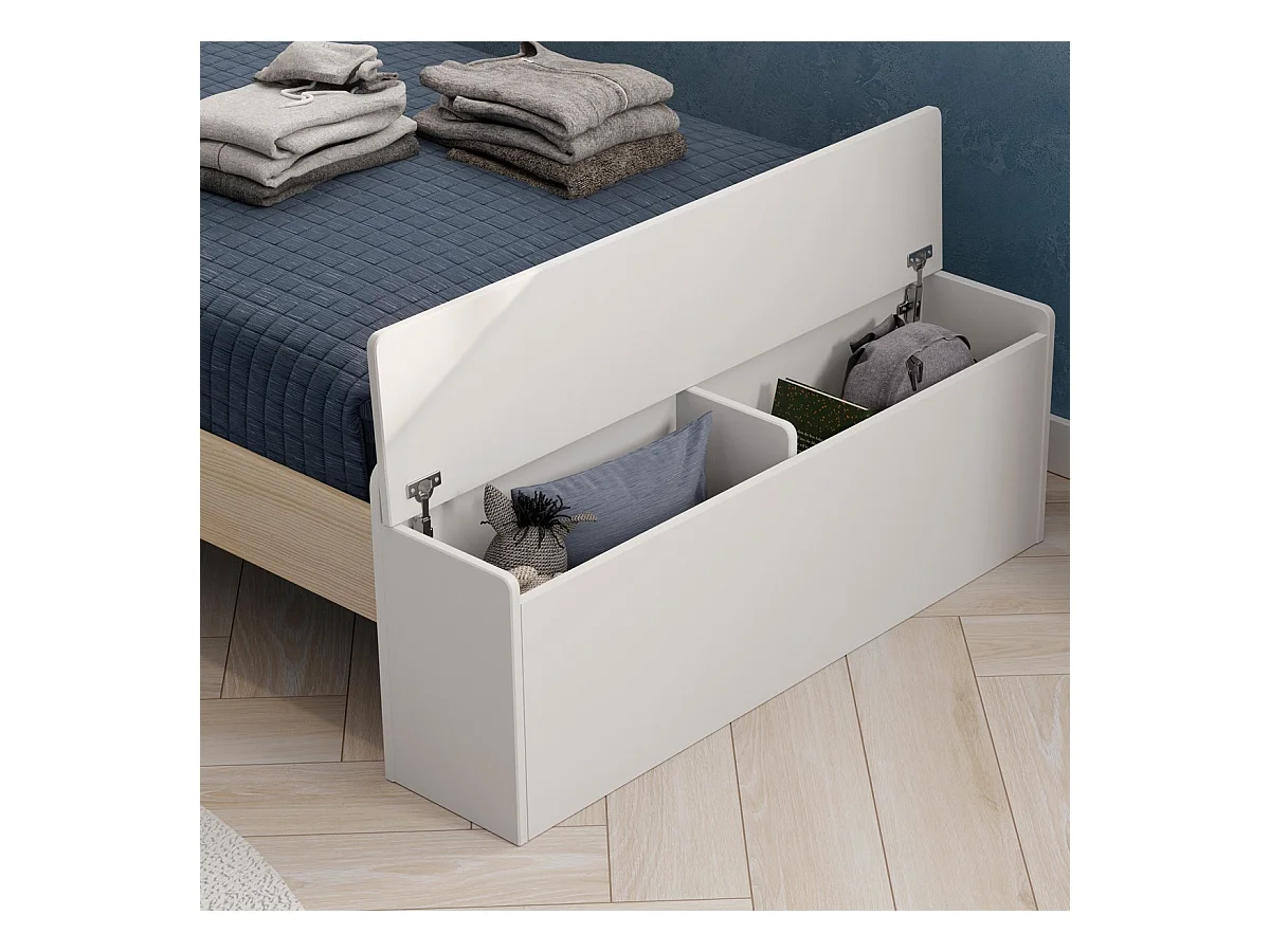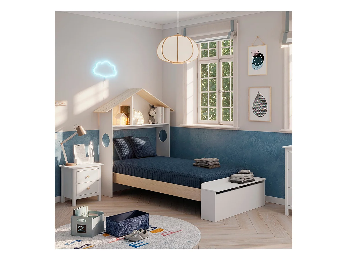 Lit enfant 90x190 cm en bois blanc avec tête de lit cabane et coffre de rangement - Anatole