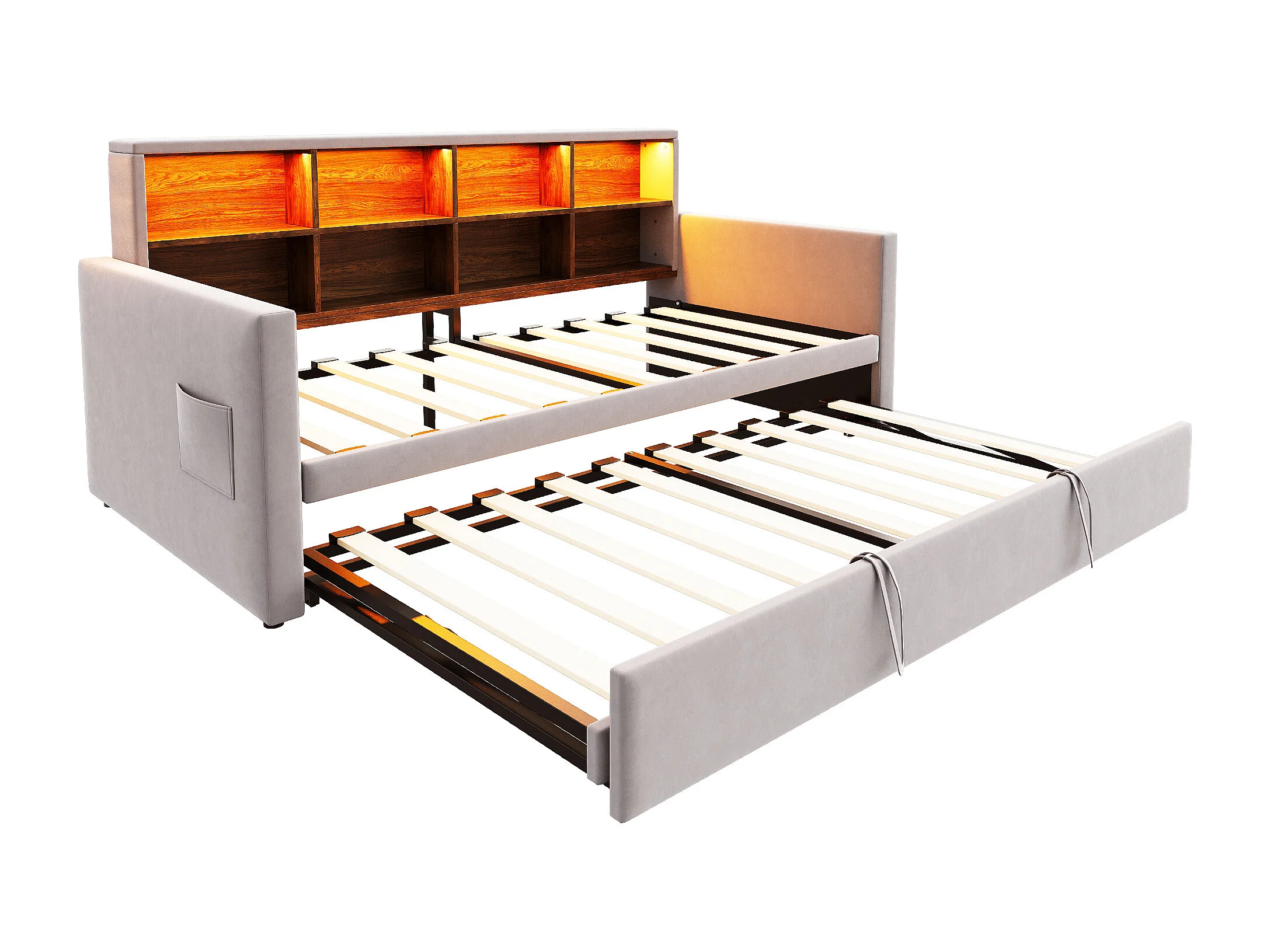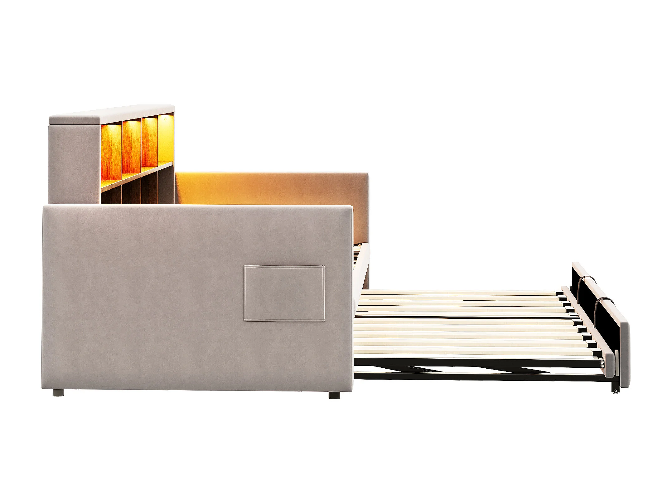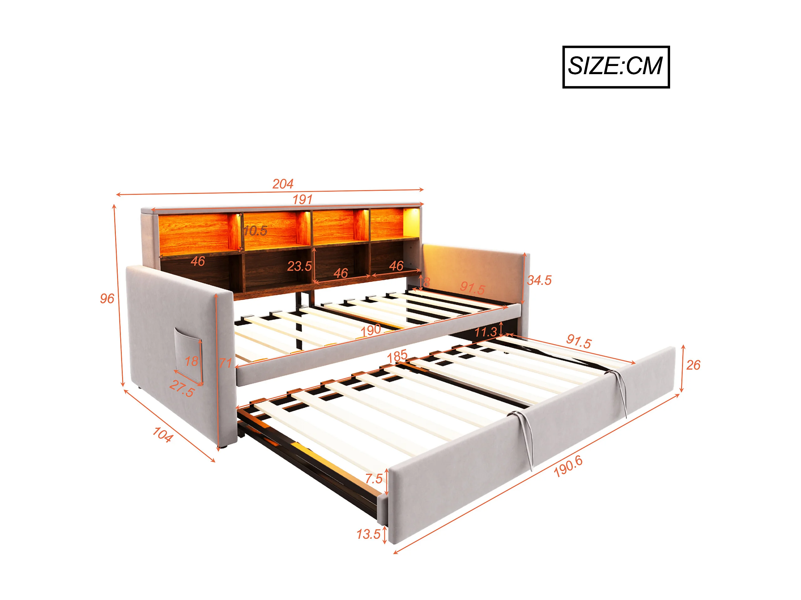 Lit enfant 90x190 cm extensible 180x190 cm - Lit banquette avec LED , Prise de charge et rangement - Velours gris clair