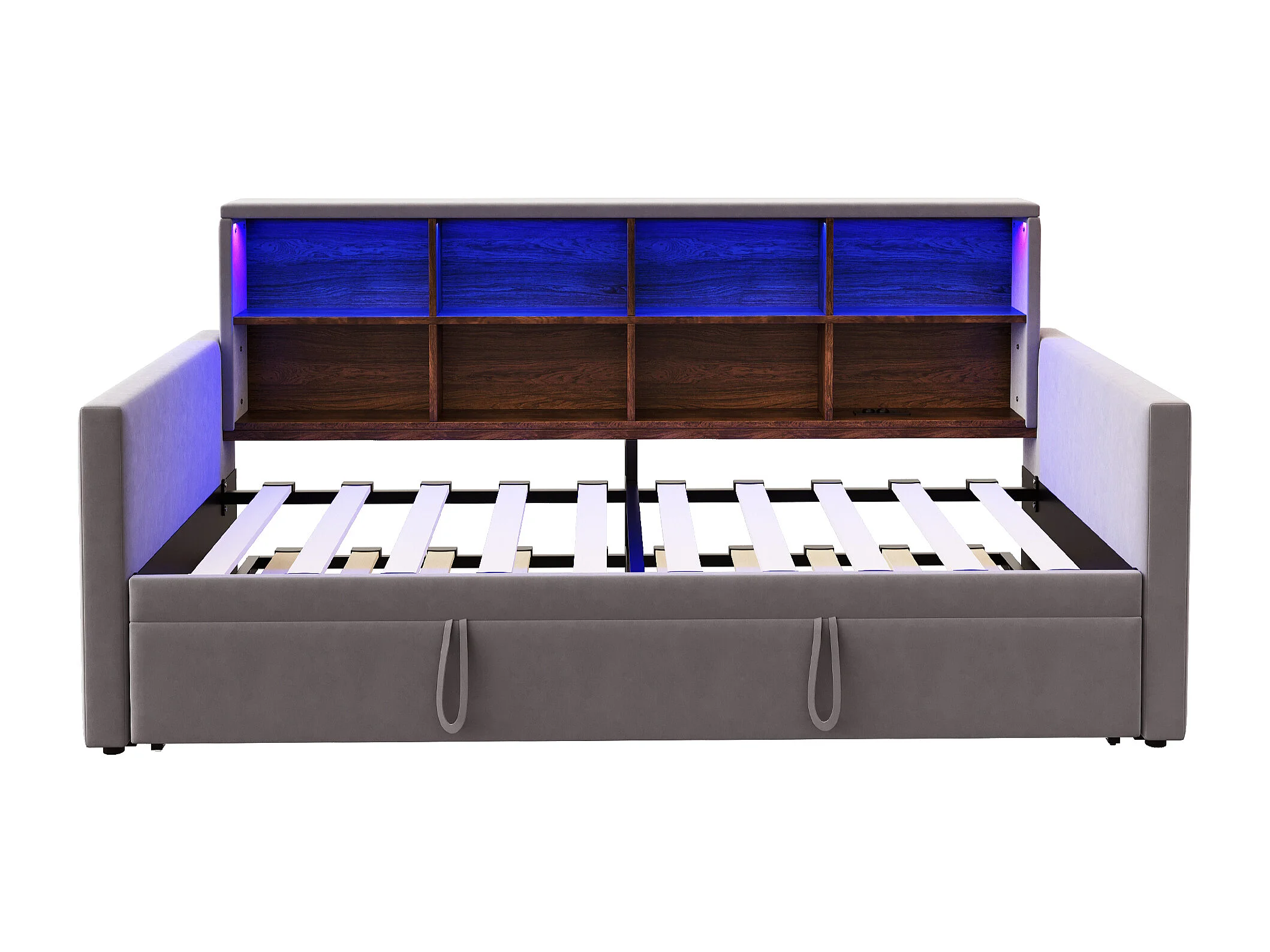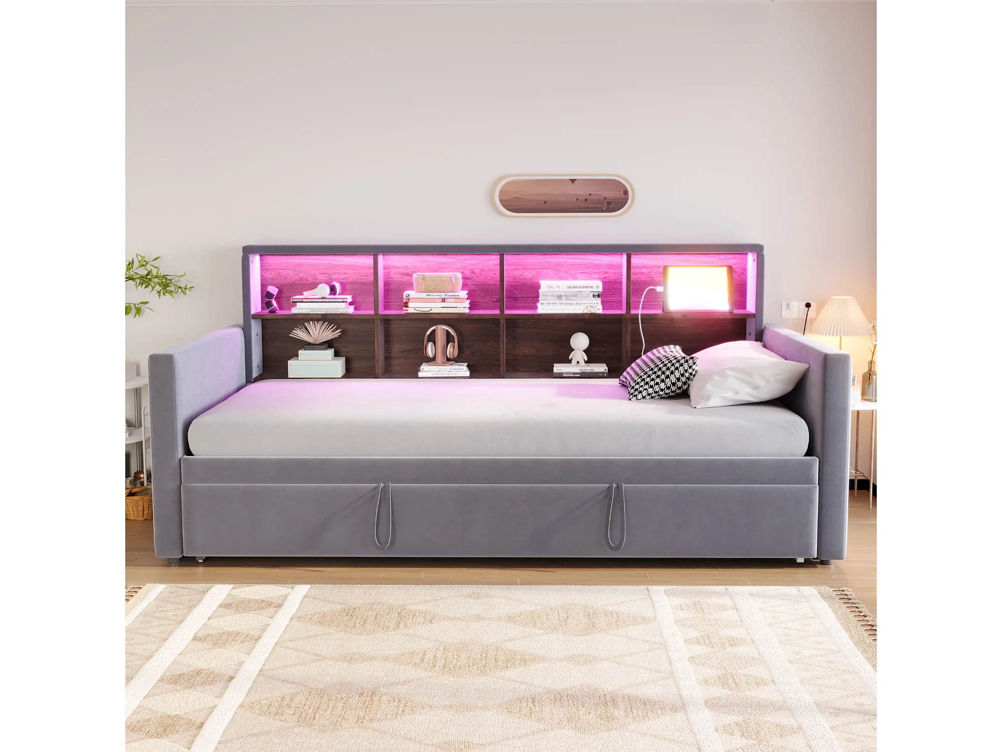 Lit enfant 90x190 cm extensible 180x190 cm - Lit banquette avec LED , Prise de charge et rangement - Velours gris foncé